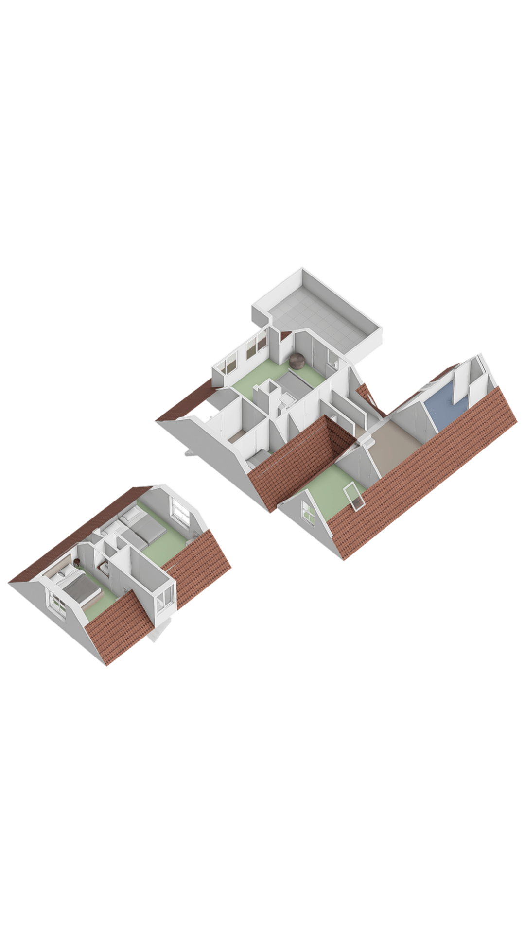 The first floor is divided between the front and rear sections of the house. In the front, you’ll find two spacious bedrooms, each with storage behind the knee walls. In the rear, a wide staircase leads to a charming landing with a built-in box bed—a unique feature sure to appeal to children. From here, you access the spacious master bedroom, which includes built-in wardrobes, a storage loft, and French doors opening onto a large rooftop terrace with panoramic views of the surrounding landscape.