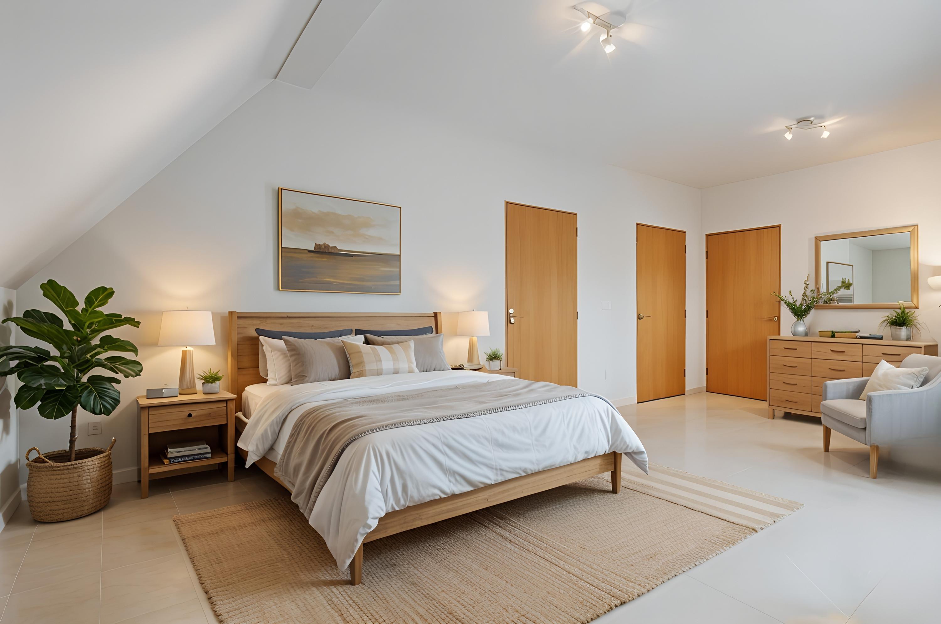 From the hallway, you reach the three bedrooms and two bathrooms. All bedrooms feature new PVC flooring, giving a warm yet low-maintenance appearance.