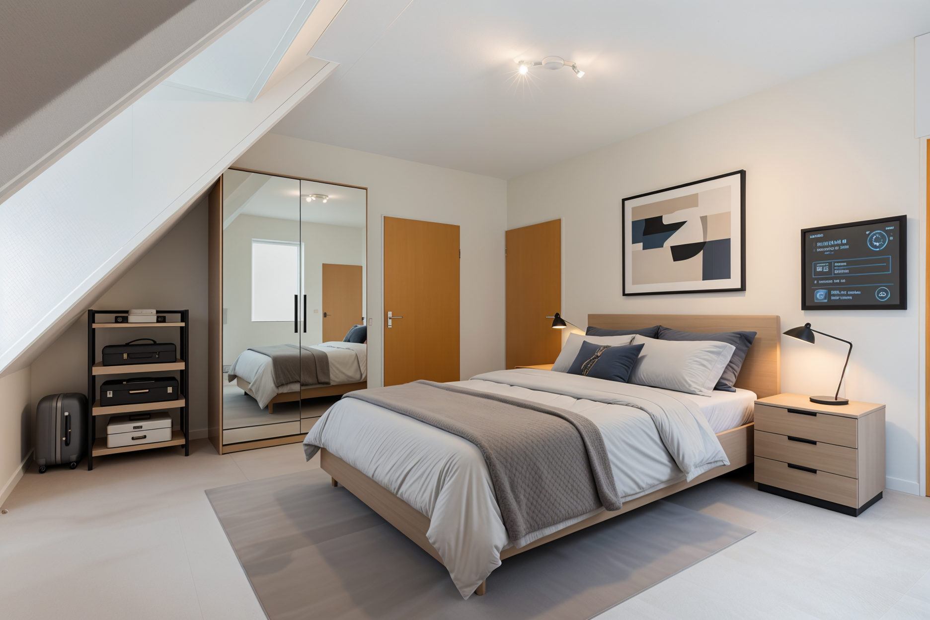 The master bedroom includes bespoke fitted wardrobes, double doors to the balcony and a luxurious en-suite bathroom. This spacious suite offers a walk-in shower and a second shower with a non-slip floor—ideal for residents with reduced mobility. A double washbasin unit and wall-hung toilet complete the design.