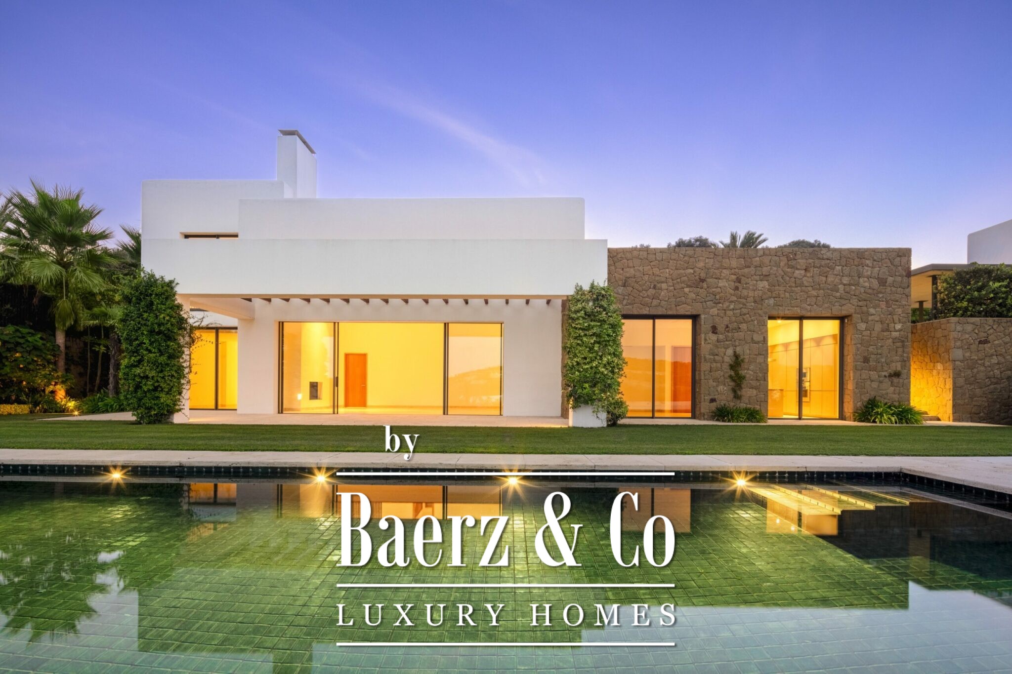 Villa Estepona with Golf and Mountain Views invites quiet grandeur within the heart of a celebrated golf resort. This five-bedroom villa occupies a 1,690 m² plot, its white Ibizan façade softened by Mediterranean stones. A landscape of manicured gardens with palms and vivid floral shrubs sets a gracious tone.