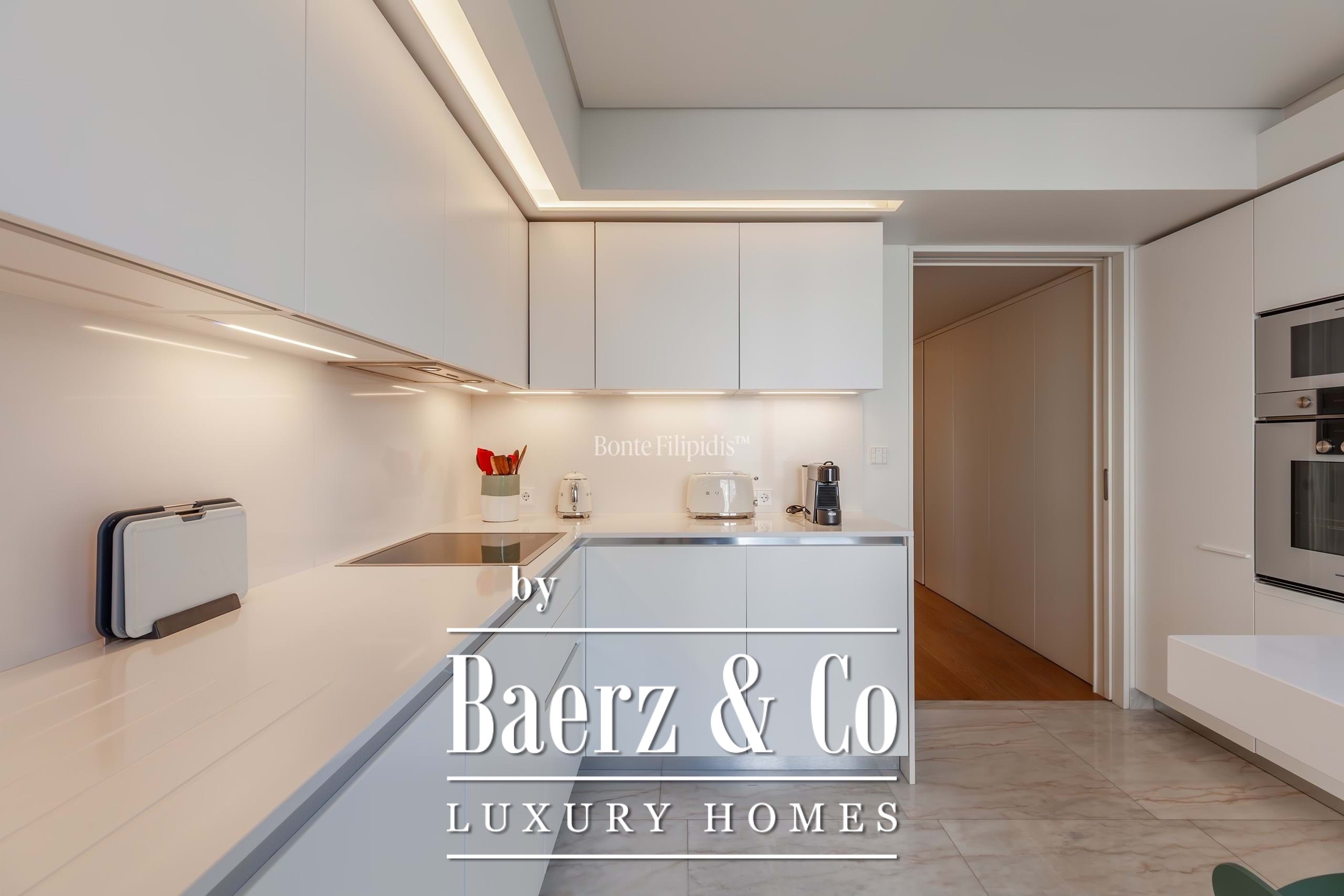 The apartment’s open-plan living and dining area extends directly to the terrace, forming the core of its social rhythm. The contemporary kitchen is fully equipped, with a dedicated laundry area and ample storage, blending utility with understated style. Two of the four bedrooms are suites, with the master featuring a walk-in closet, abundant natural light, and direct terrace access. The private zone balances quiet retreat and generous proportions, while considered wood panelling and curated furnishings shape an atmosphere of warmth and discretion.
