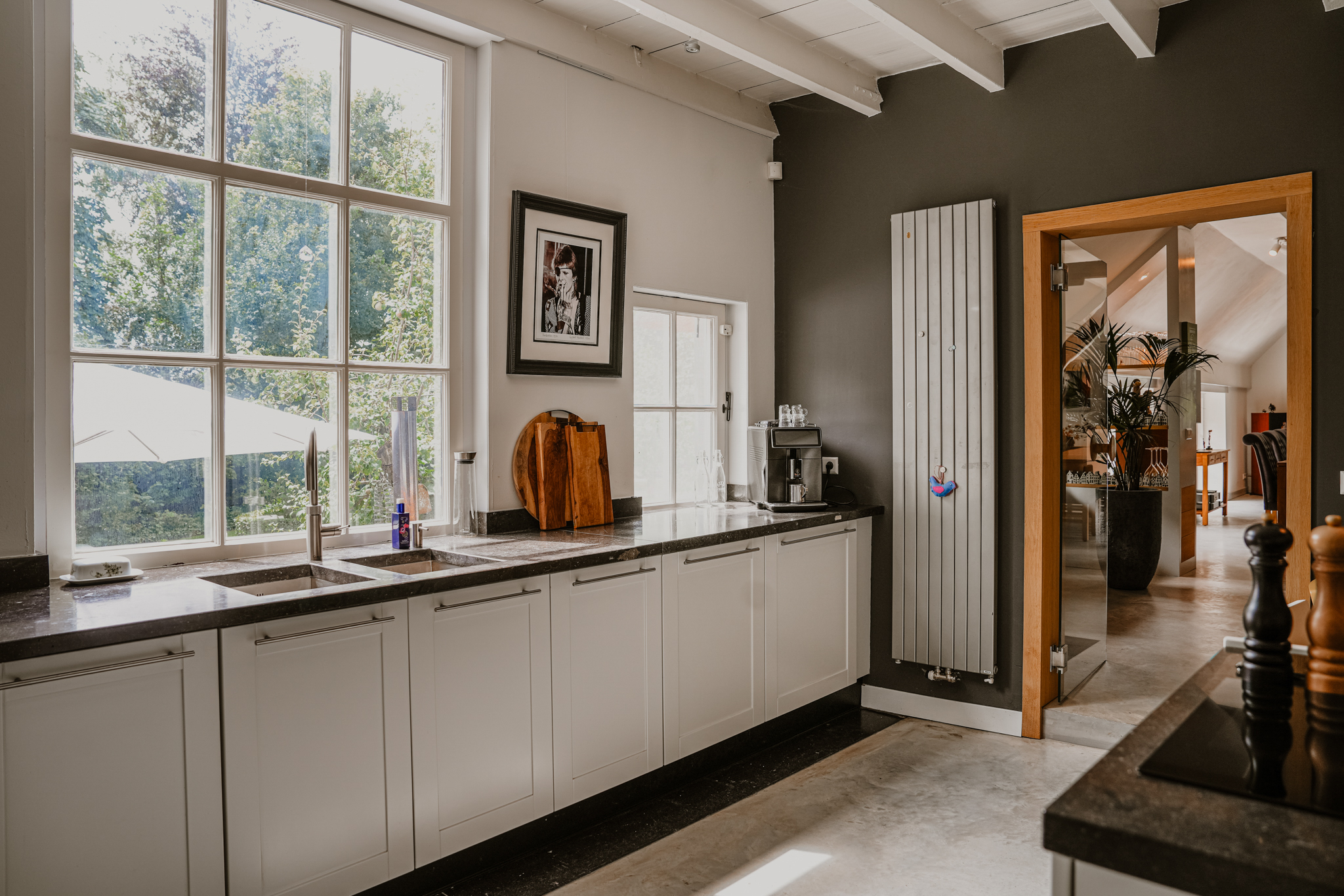 Impressive, garden-oriented living room, a luxuriously fitted kitchen with fireplace and wood-burning stove, a cosy sitting room, a study above the wine cellar and a spacious bedroom with wardrobe and comfortable bathroom on the ground floor.
