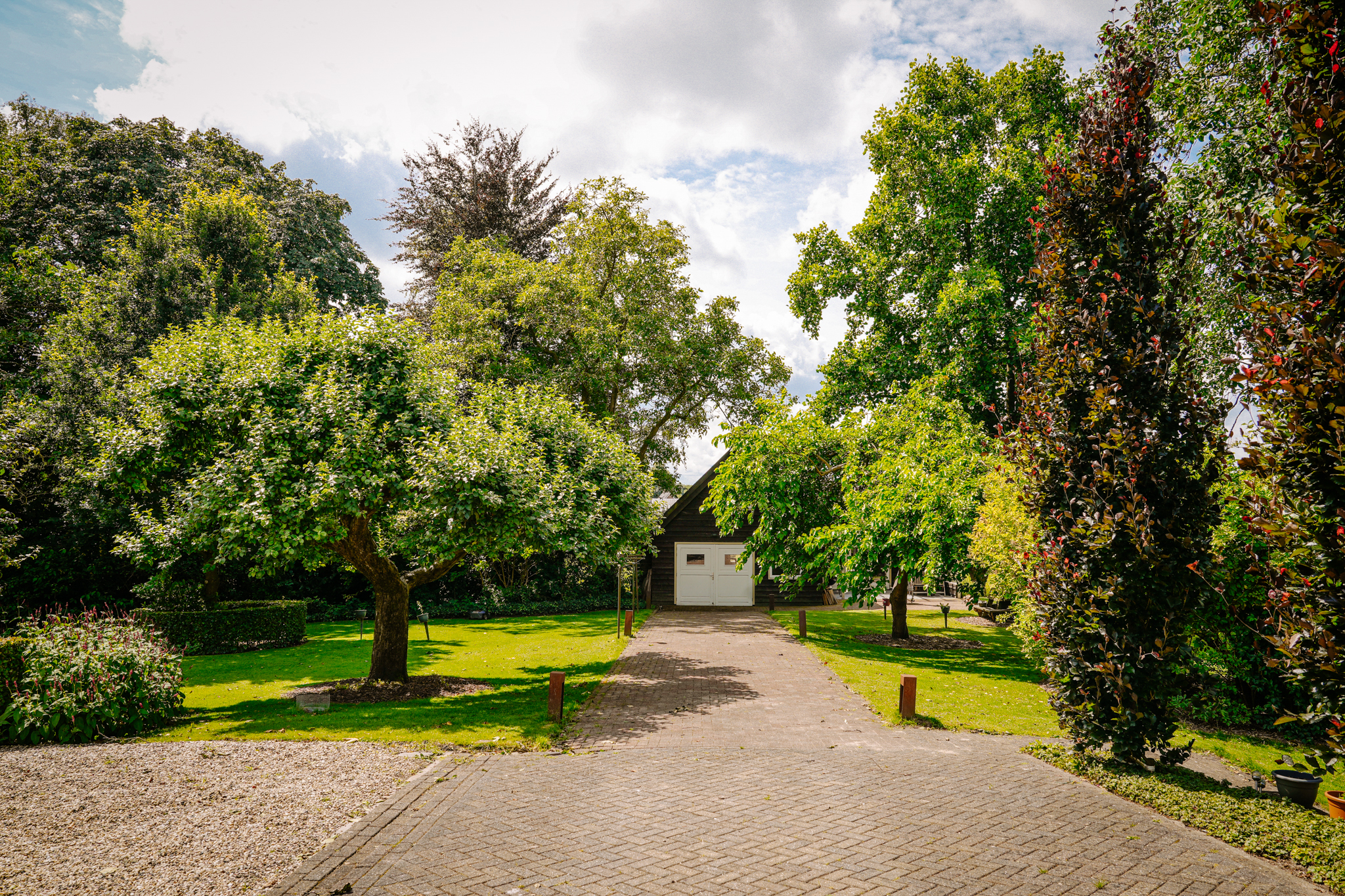T-farmhouse with a detached outbuilding and a beautifully landscaped landscape garden with mature (fruit) trees facing south.