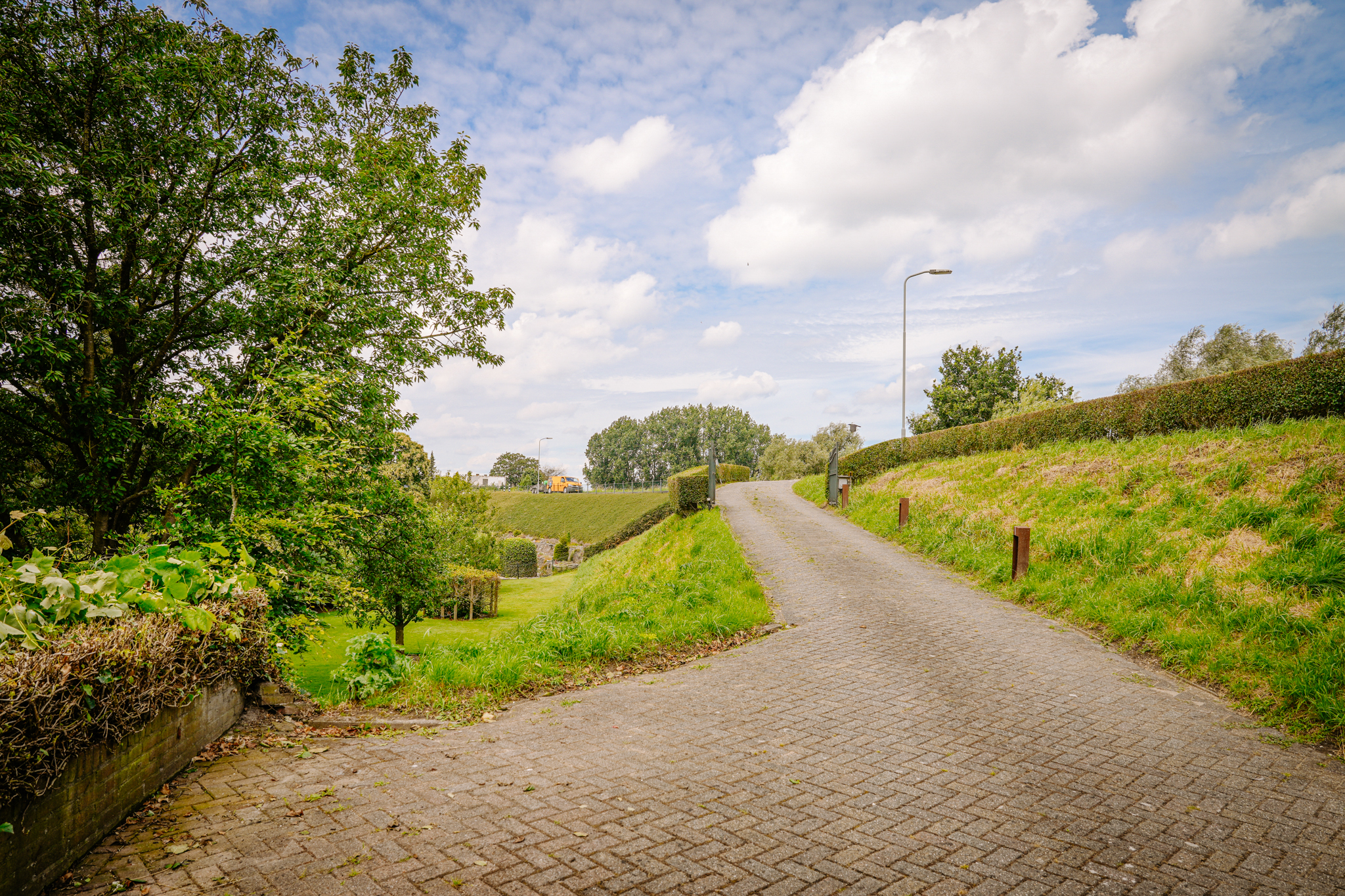 The paved driveway with electric gate and lighting leads to the farmhouse and outbuilding. The south-facing landscape garden is bordered on the ditch side by pollard willows. There is a lawn, mature trees, and standard fruit. On the other side of the farmhouse is a walking/cycling dike from where you have beautiful views of the river Waal and its floodplains.