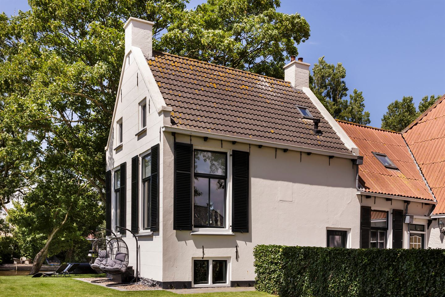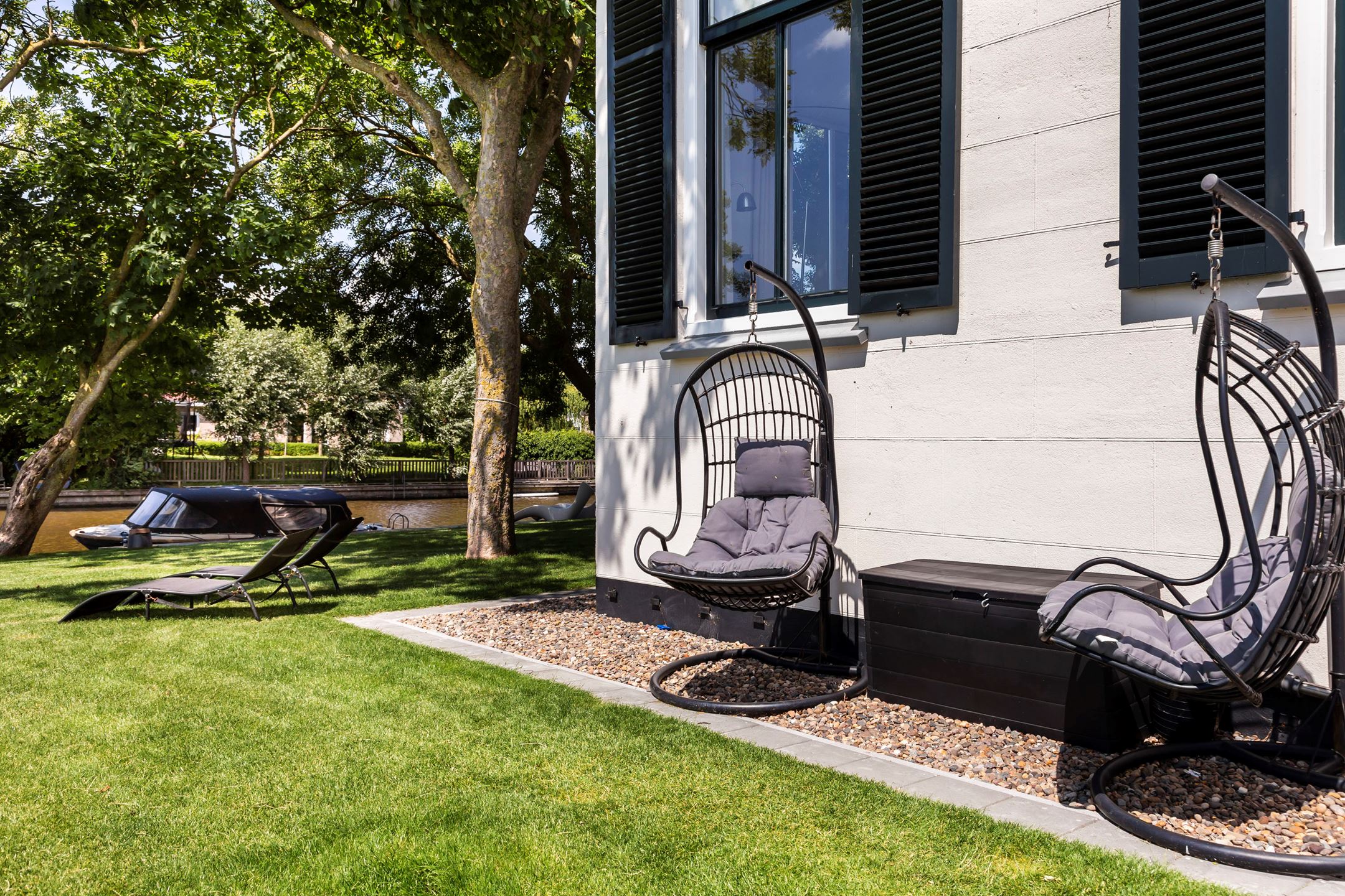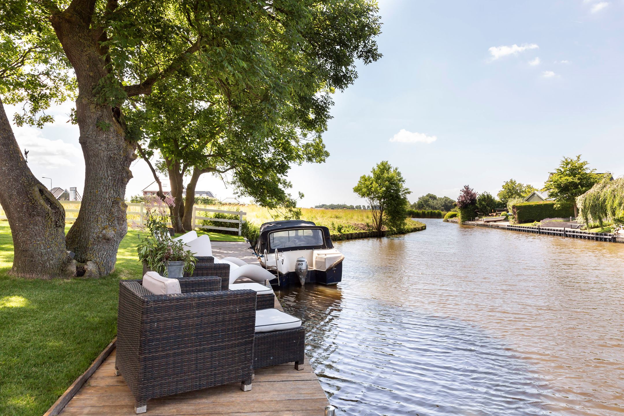 The farmhouse is situated on an island, it is bordered by water with the Elfsteden Harlingervaart on the south side of the plot. The beautiful trees and weeping willows along the jetties and canoe/boat ramp emphasize the maritime environment. The hardwood jetties provide ample mooring for numerous boats.