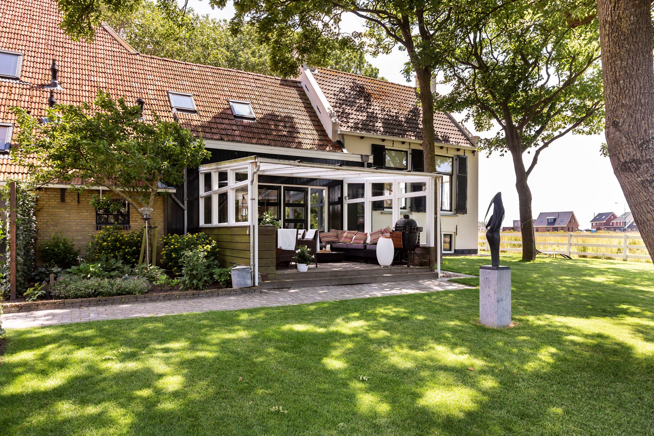 The meadow with crisp white fencing is located in front of the home and is suitable for keeping small livestock or horses. The well-kept and beautifully landscaped garden has several sun and shade terraces, borders, various types of trees including even a small orchard. There is ample parking space with electric charging stations.