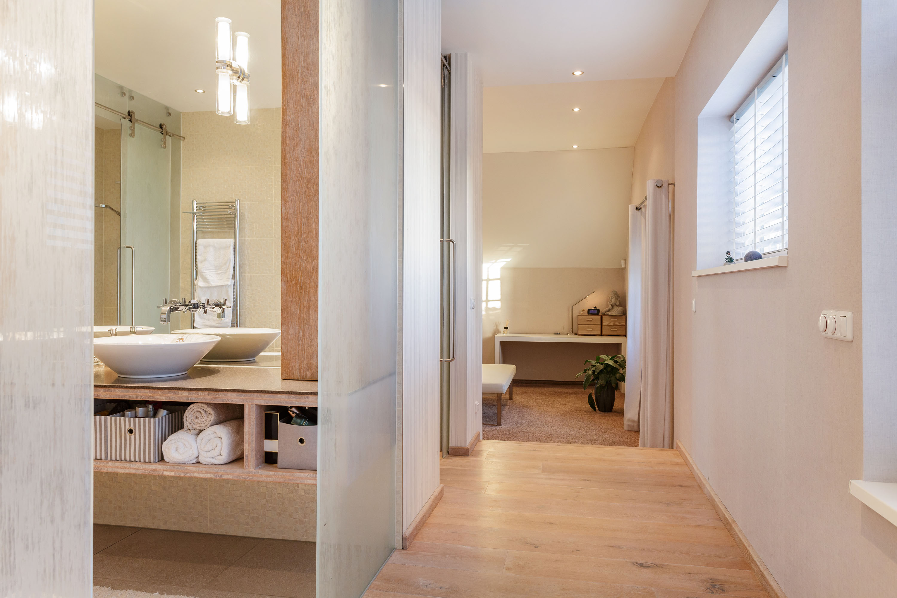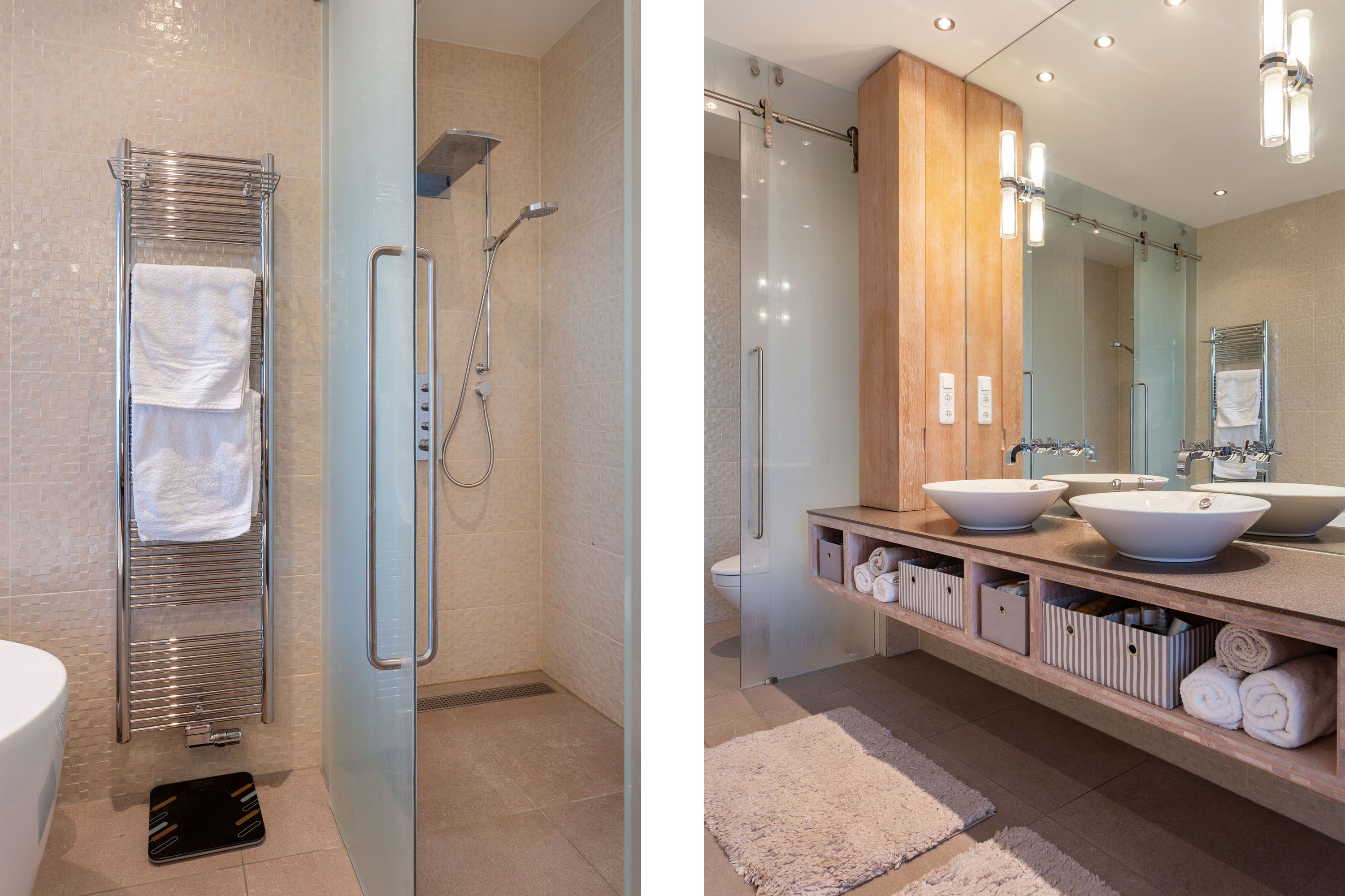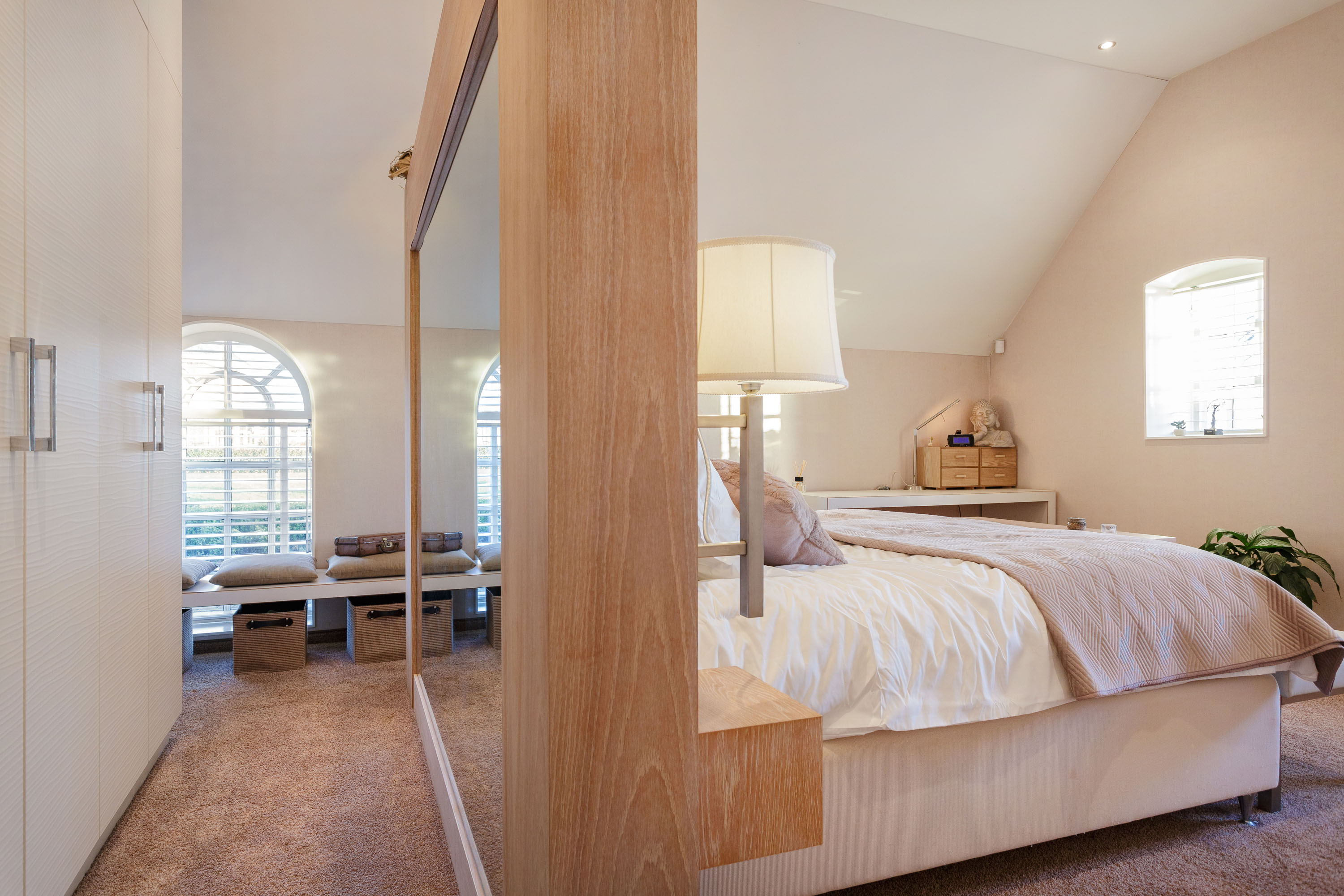 The hall gives access to the master bedroom equipped with a stylish en-suite bathroom with freestanding bathtub, separate toilet, walk-in rain shower and double washbasins. Between the bathroom and bedroom a generous walk-in closet with frosted-glass doors is situated. The master bedroom has a door to the south terrace and insulated characteristic stable windows. The bed with an electrically integrated recessed TV cabinet stands prominently in the room with behind it a large fixed cabinet wall as "dressing room". These rooms all have underfloor heating.