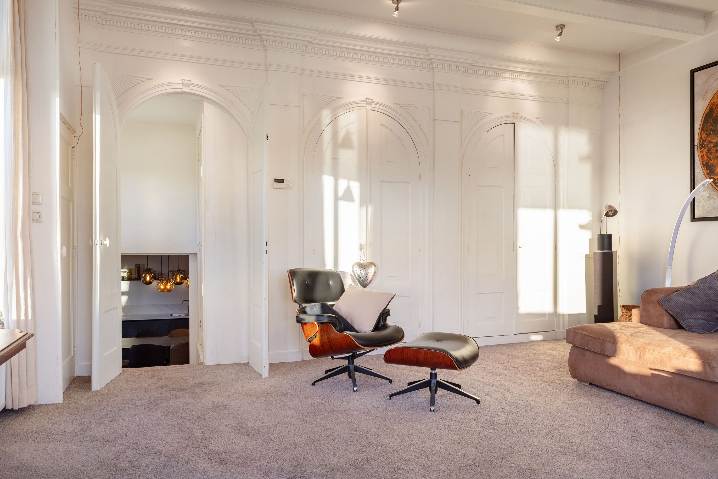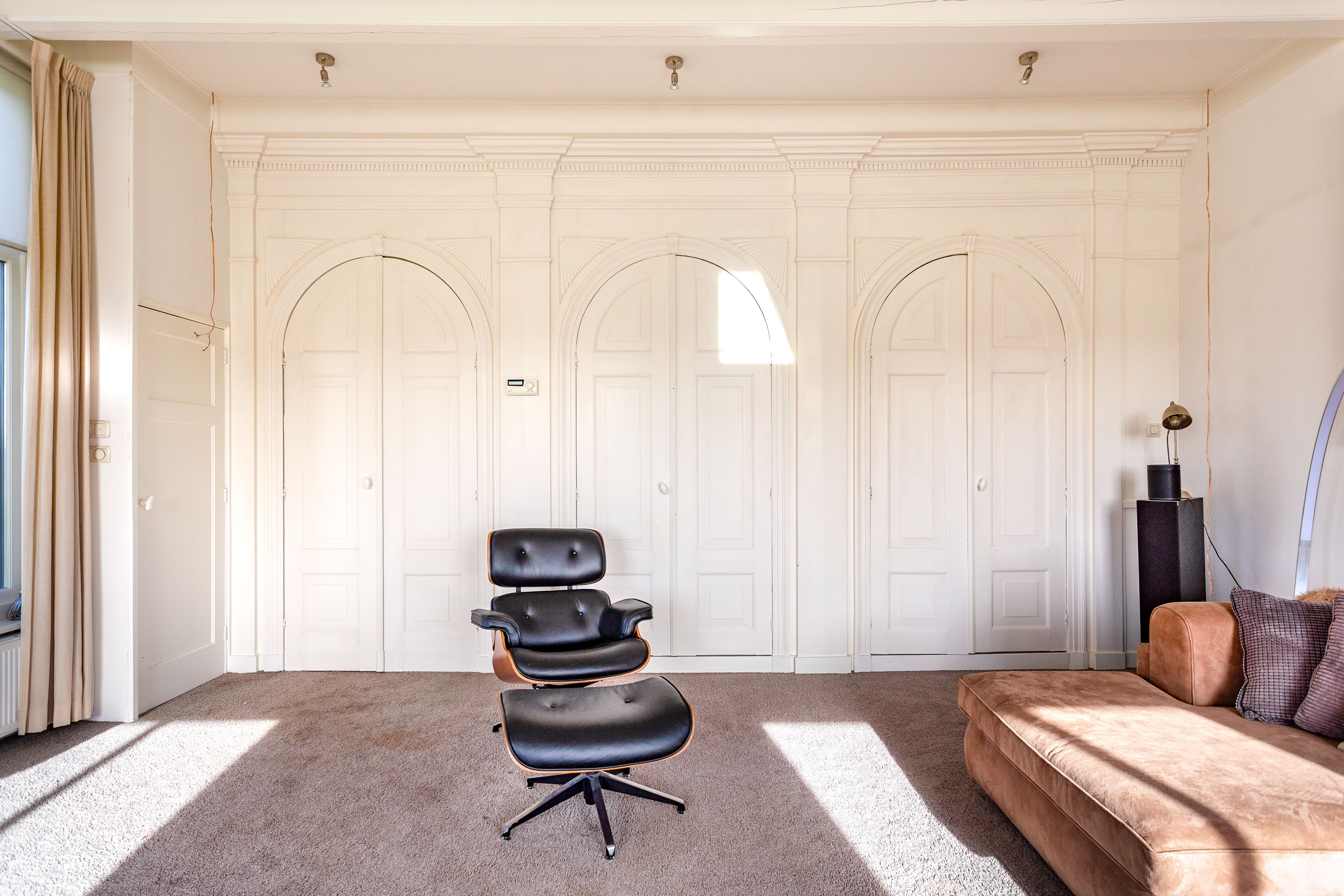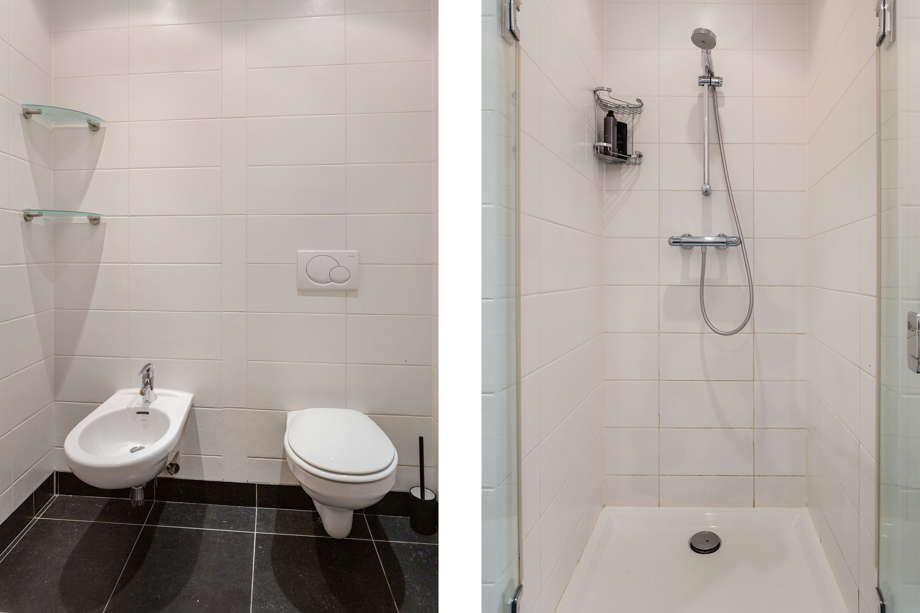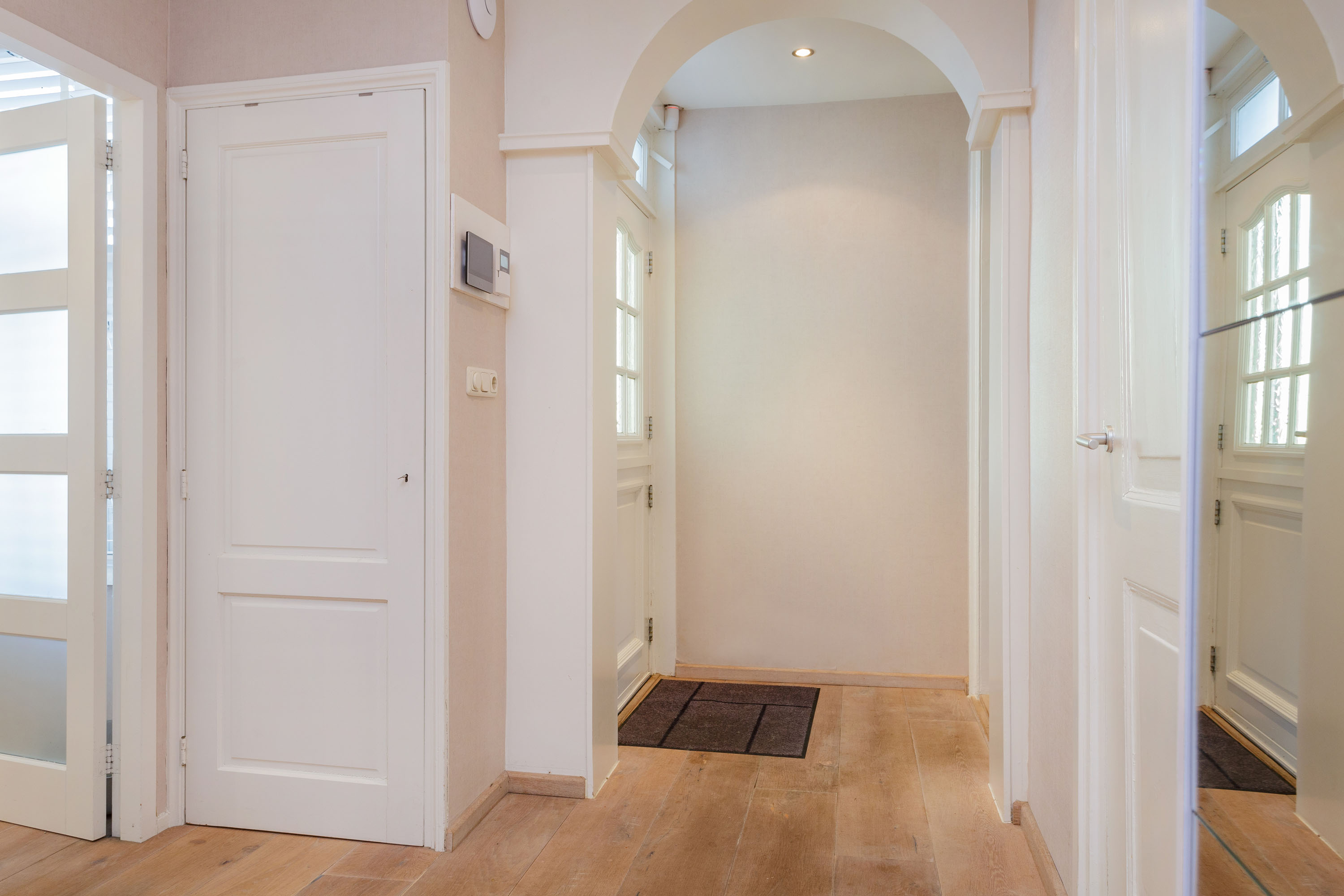 The hall gives access to the master bedroom equipped with a stylish en-suite bathroom with freestanding bathtub, separate toilet, walk-in rain shower and double washbasins. Between the bathroom and bedroom a generous walk-in closet with frosted-glass doors is situated. The master bedroom has a door to the south terrace and insulated characteristic stable windows. The bed with an electrically integrated recessed TV cabinet stands prominently in the room with behind it a large fixed cabinet wall as "dressing room". These rooms all have underfloor heating.
