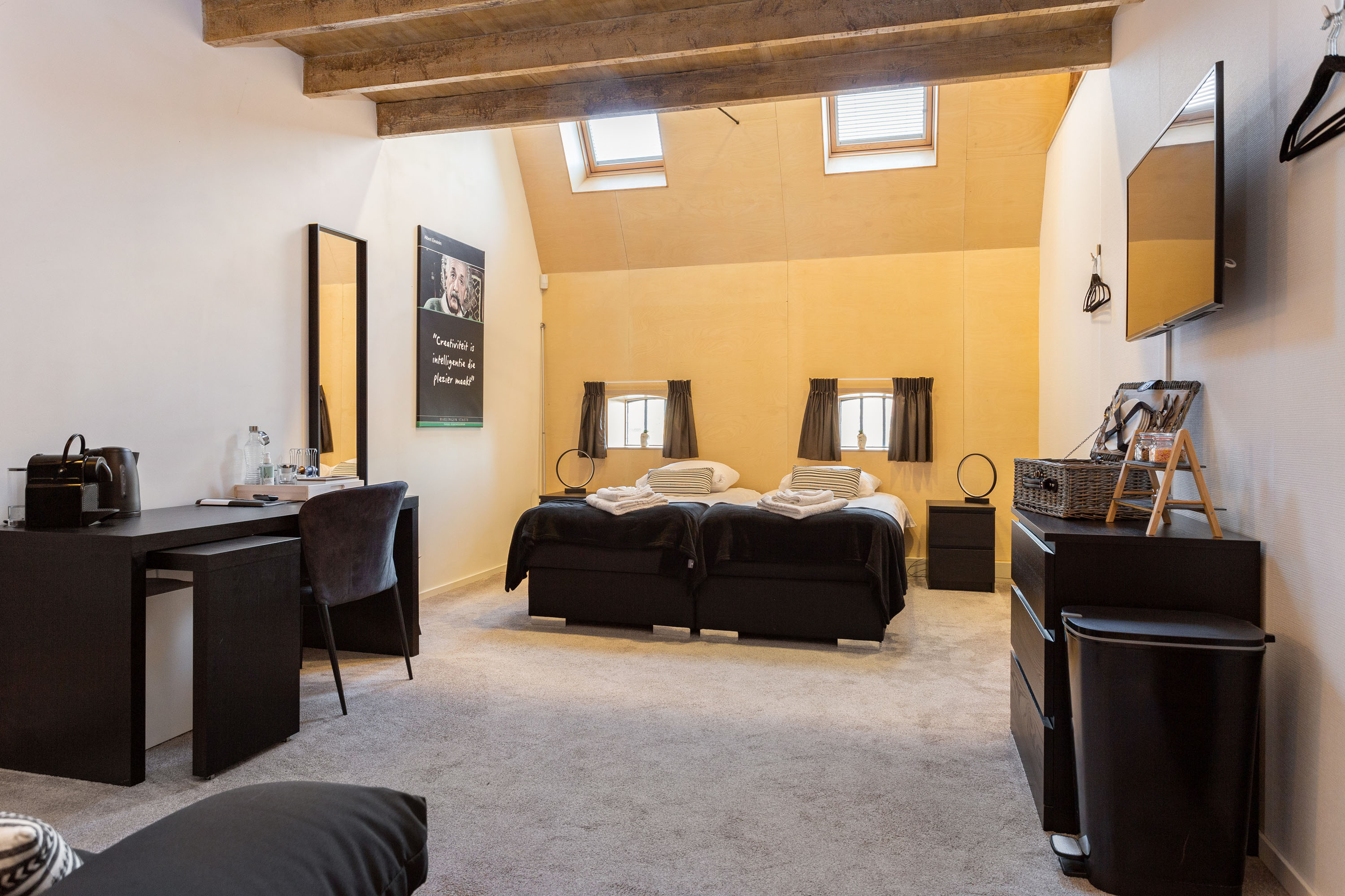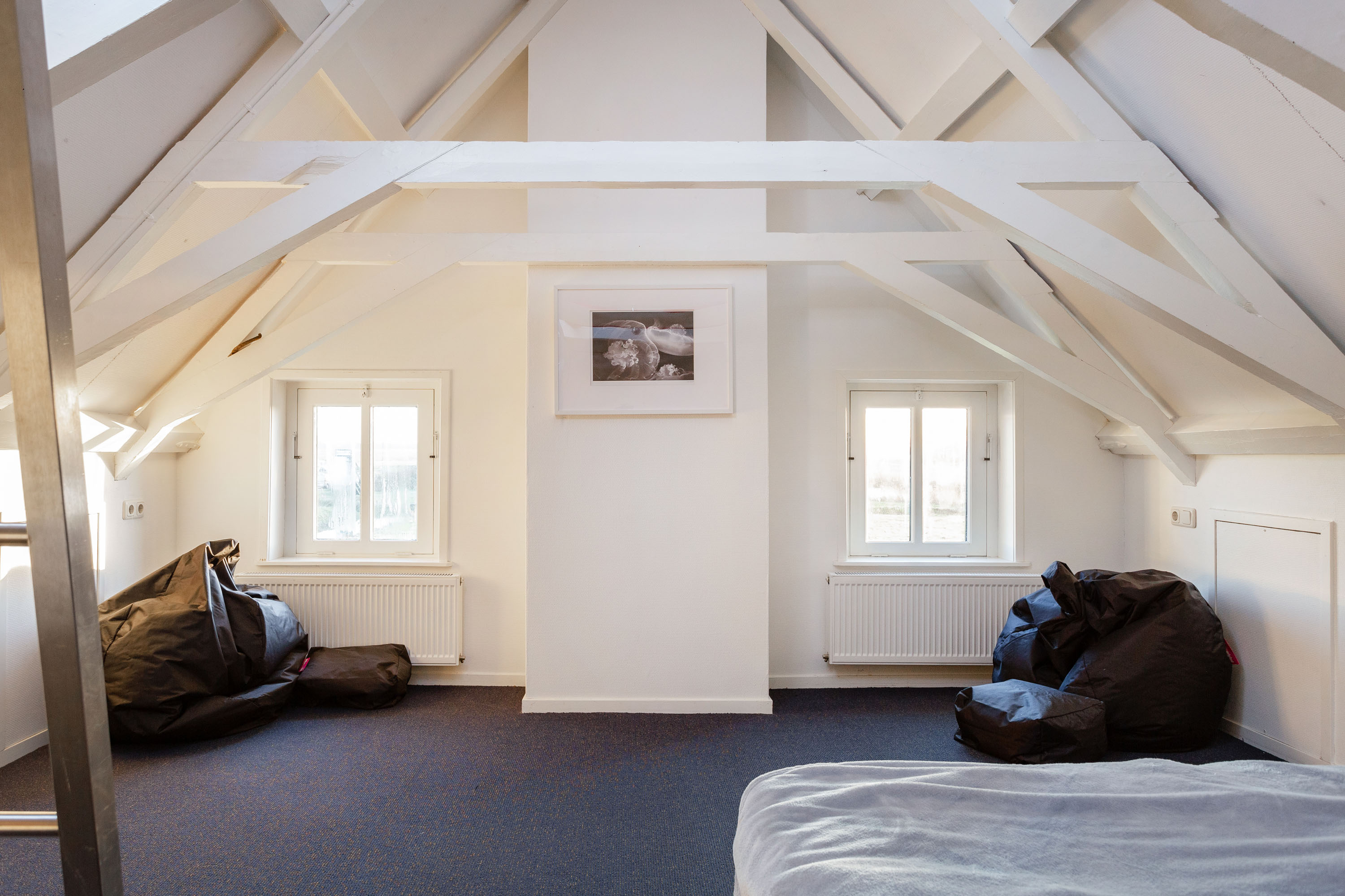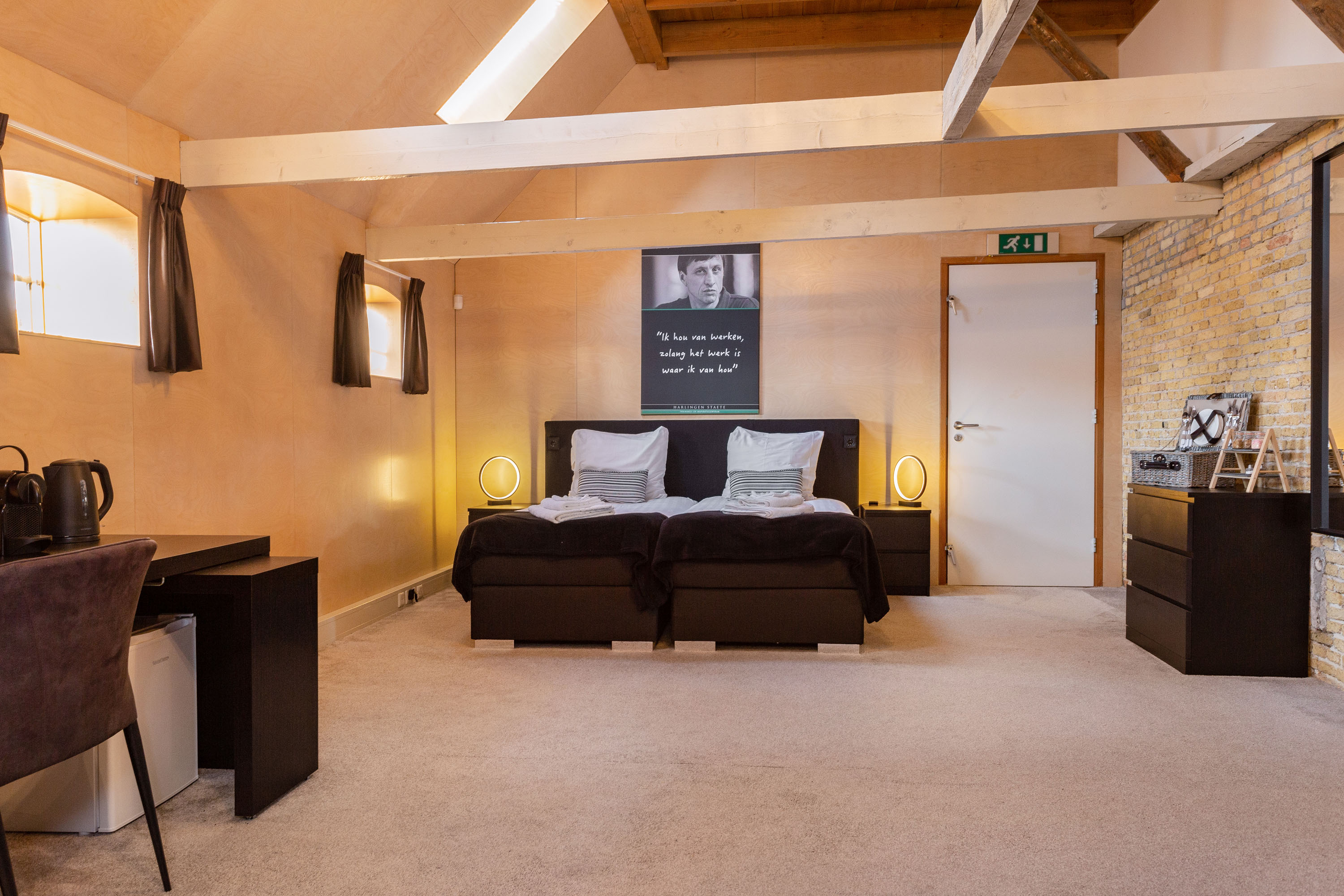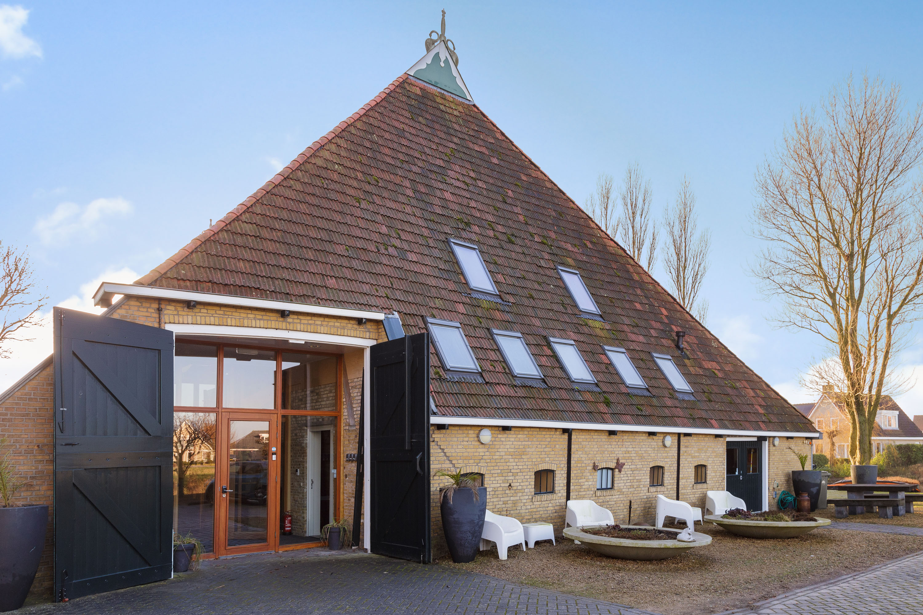 The former barn has been professionally renovated and completely modernized. Imposing open stable doors with glass entrance, is a striking feature upon arrival at Harlingen Staete. There are now 4 beautiful fully furnished rooms with en-suite bathroom. Furthermore, downstairs are 3 spacious multifunctional rooms situated around a large open-plan hall with a view of the imposing ridge in the middle of the barn. All rooms are light and atmospheric due to the use of a lot of glass, the preservation of the old stable windows and the beautiful old beams of the 6-sided part of the barn in sight. It goes without saying that all high-tech connections/wiring for internet, light, presentations etc. are present as well as a pantry and separate toilet groups.