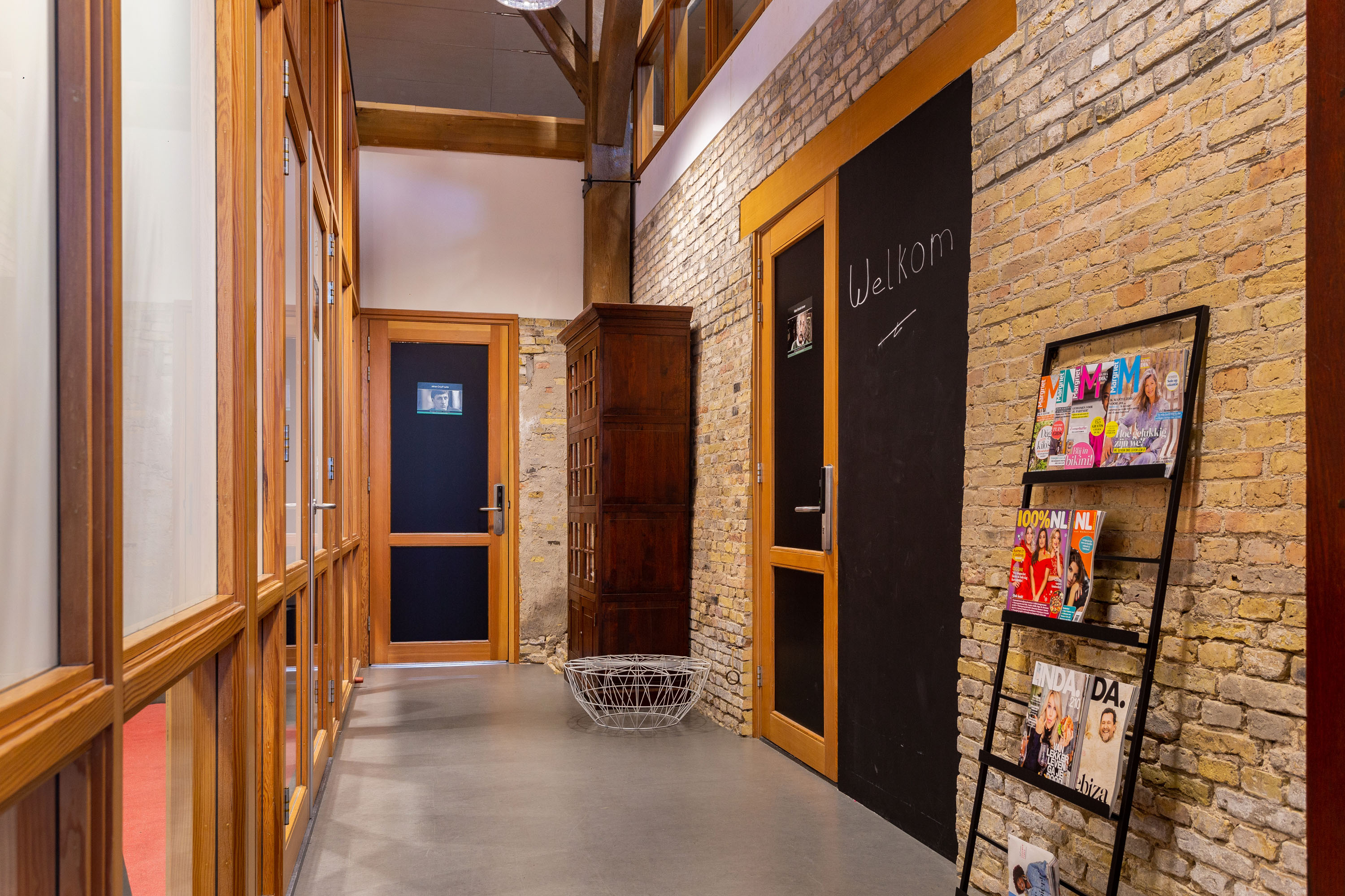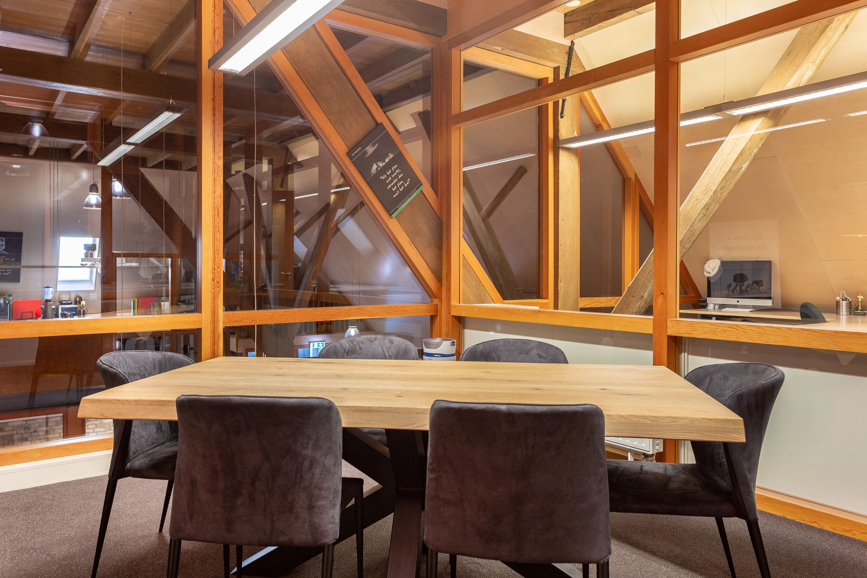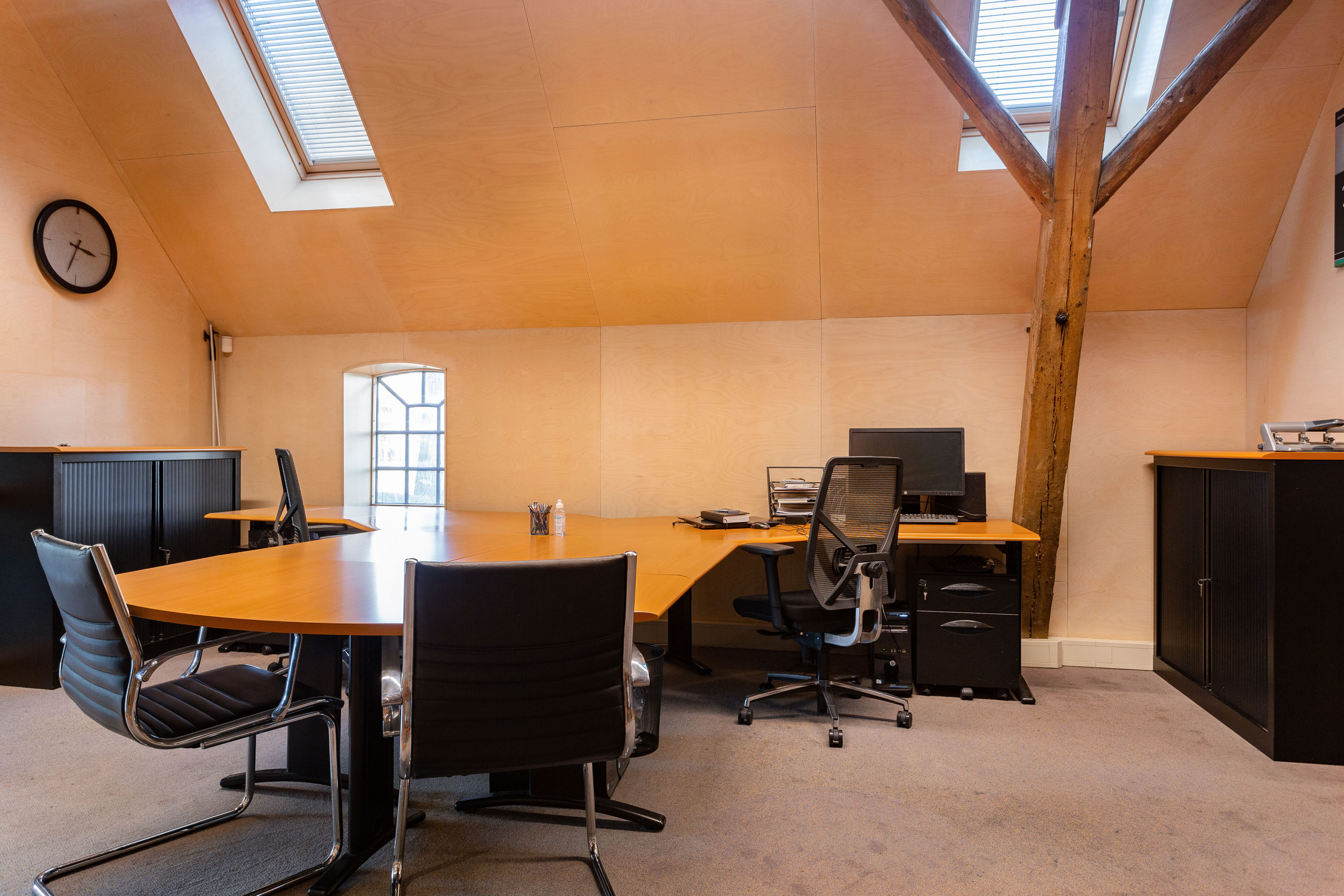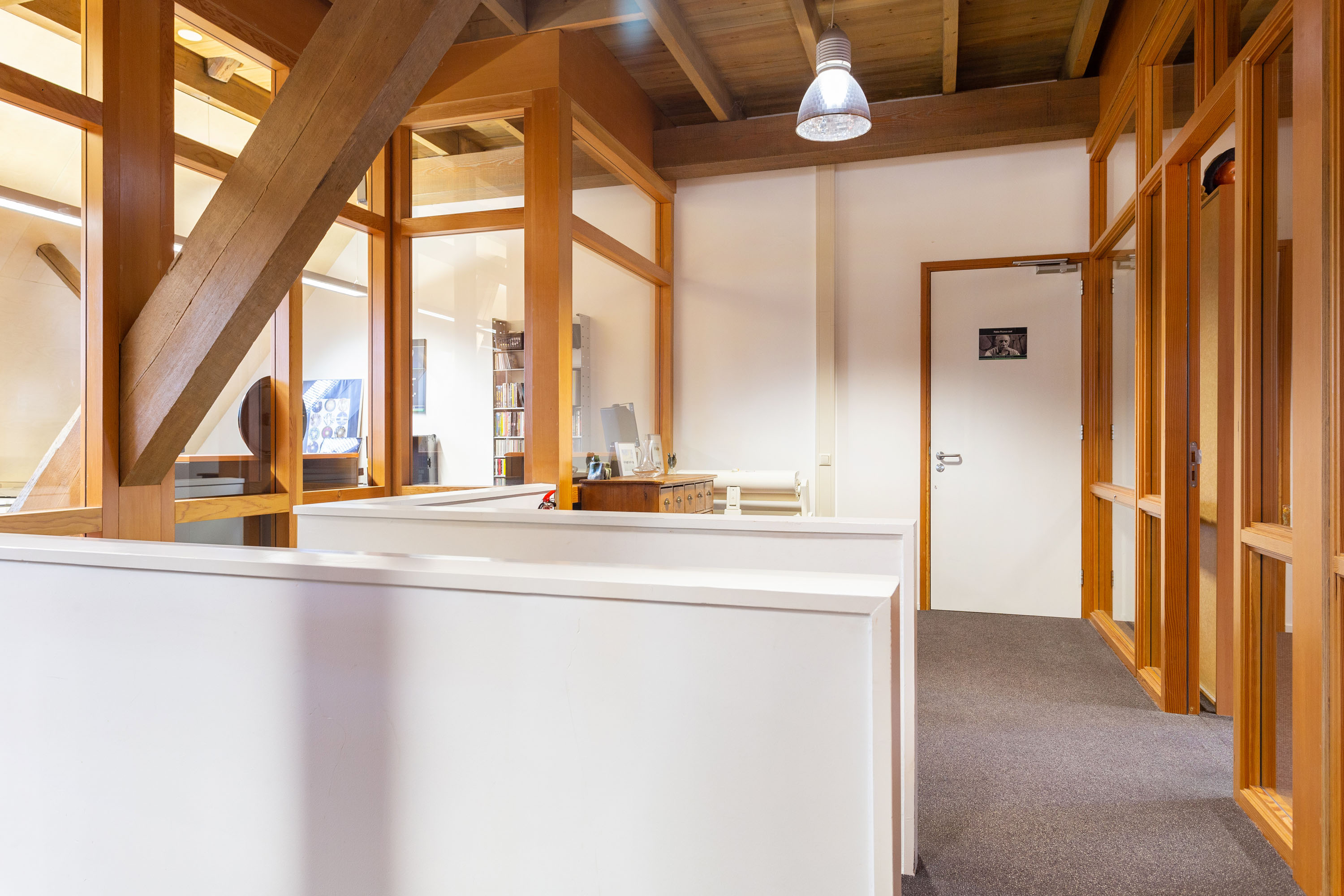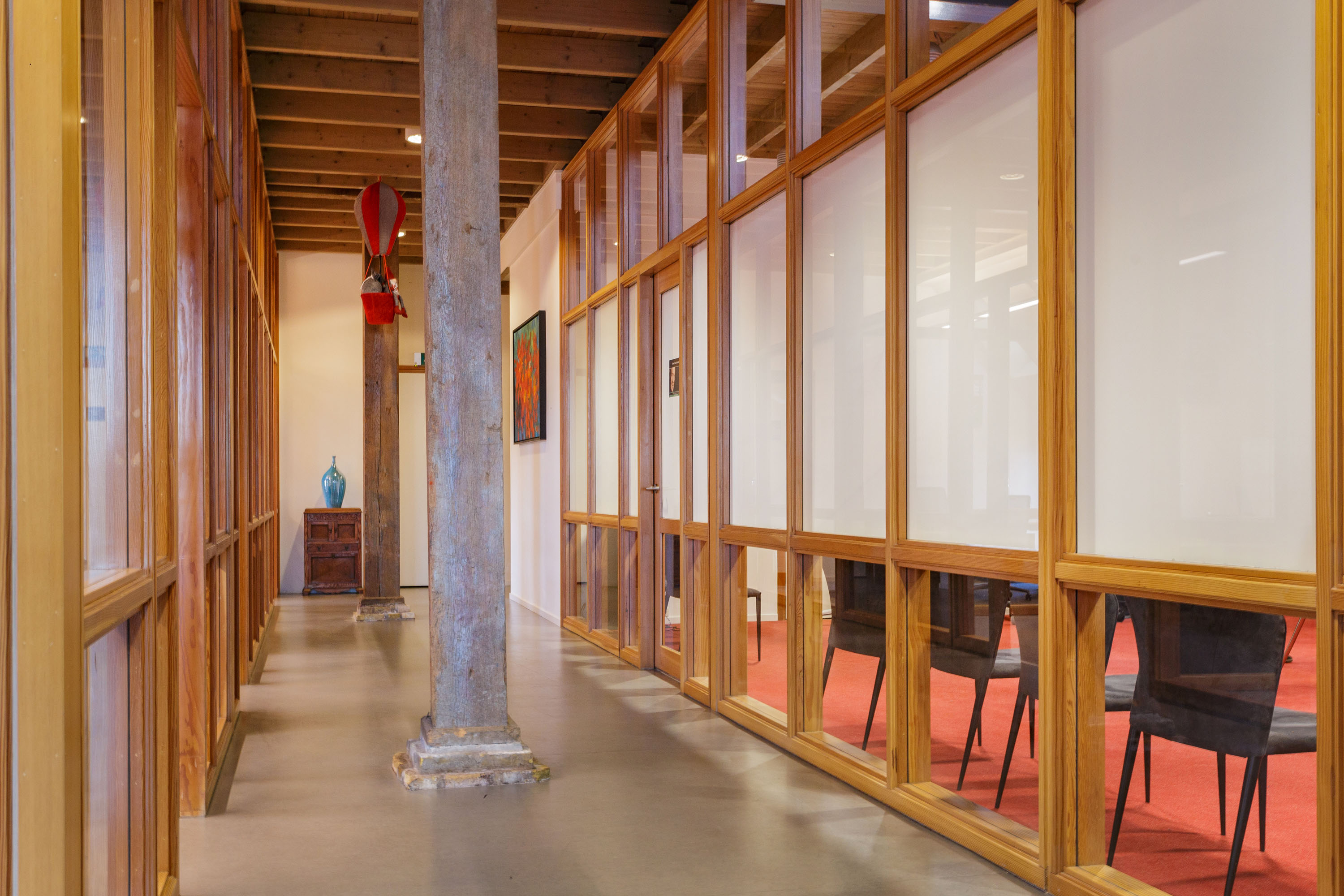 The imposing wooden former stable doors immediately indicate where the entrance is located. As you enter through these doors into the glass front porch you will discover 3 modern rooms that are set up as offices, but can be used for a variety of purposes. The open center of the large section can be used as a living room, fitness or meeting room. All rooms look light and attractive because of the glass walls and the impressive old beams and trusses left in sight up to the ridge. The spacious pantry and separate toilets are located at the rear of the former barn.