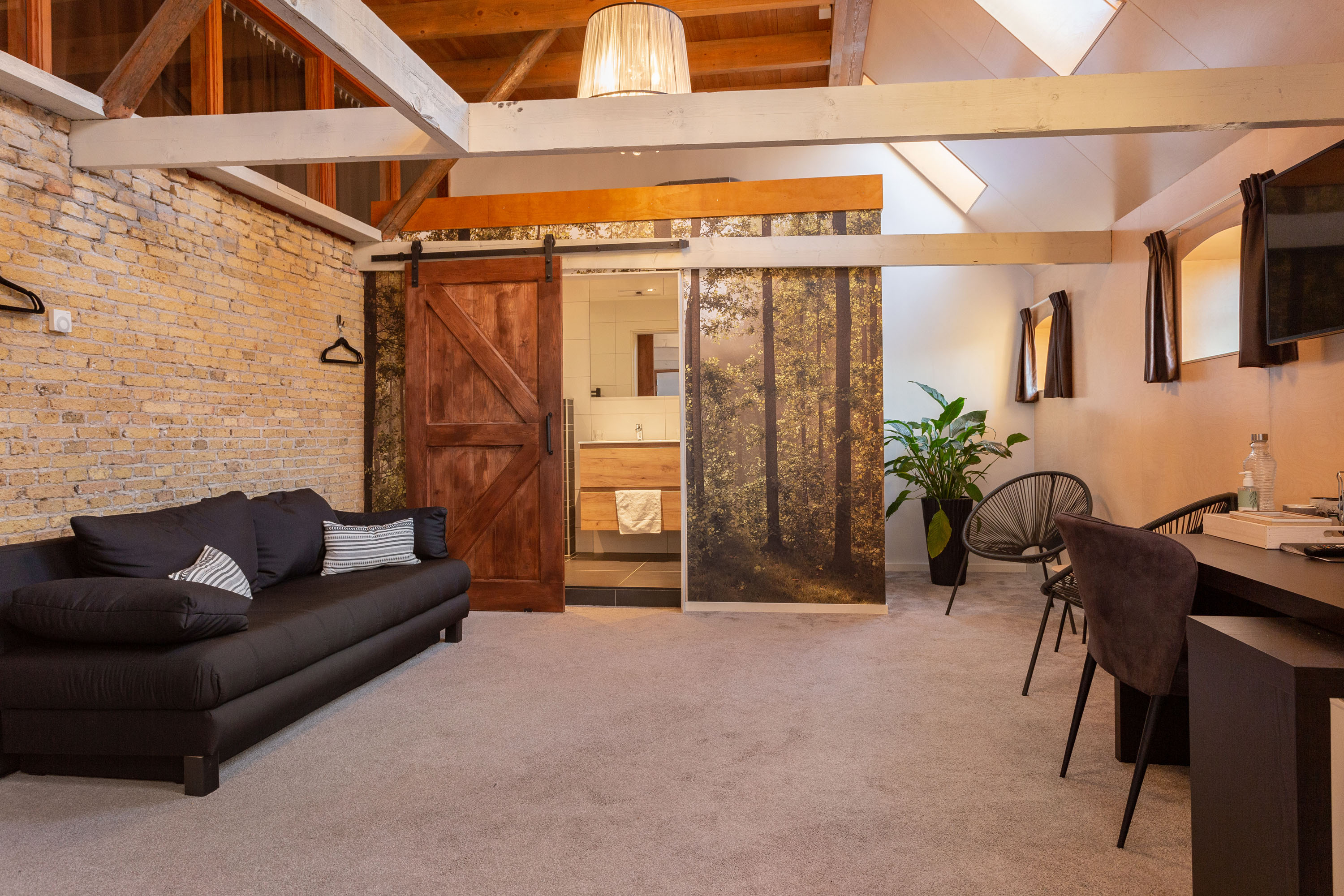On the right side of the barn downstairs, 4 modern rooms with en-suite bathrooms have been created. The rustic atmosphere and feeling of outdoor living has been retained. Each room has its own entrance.