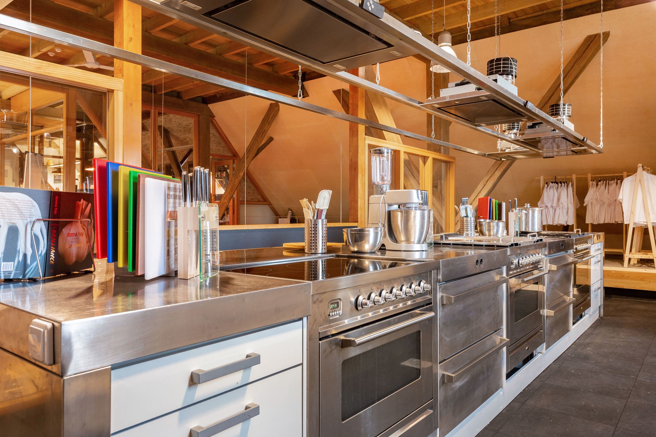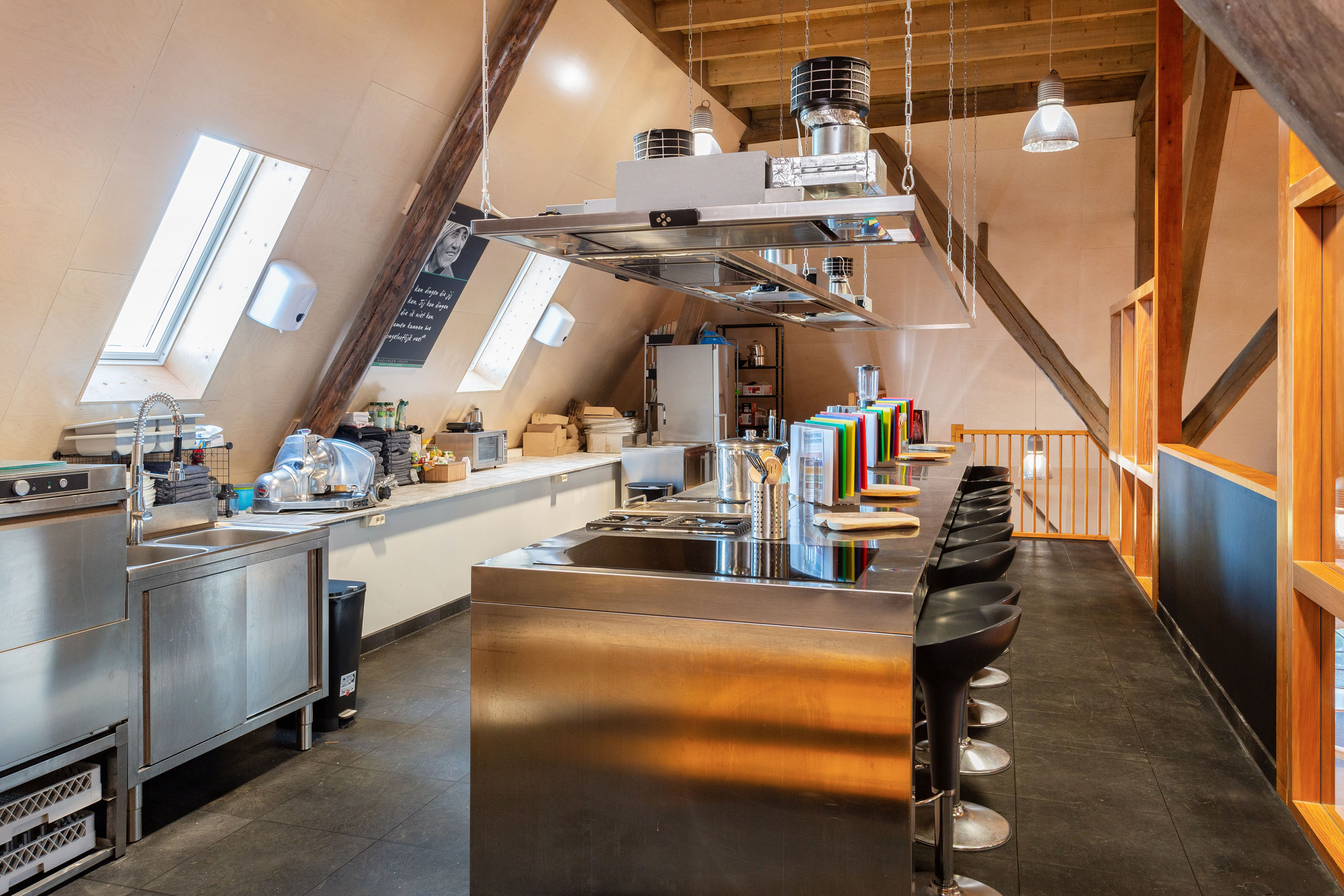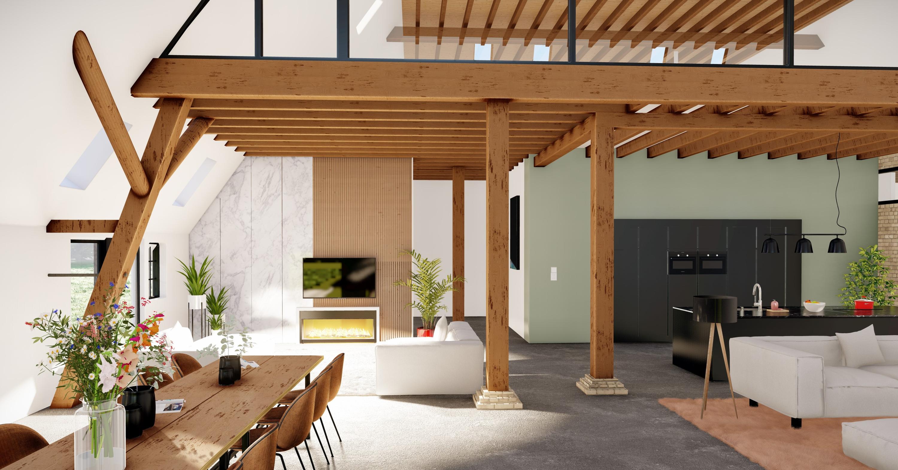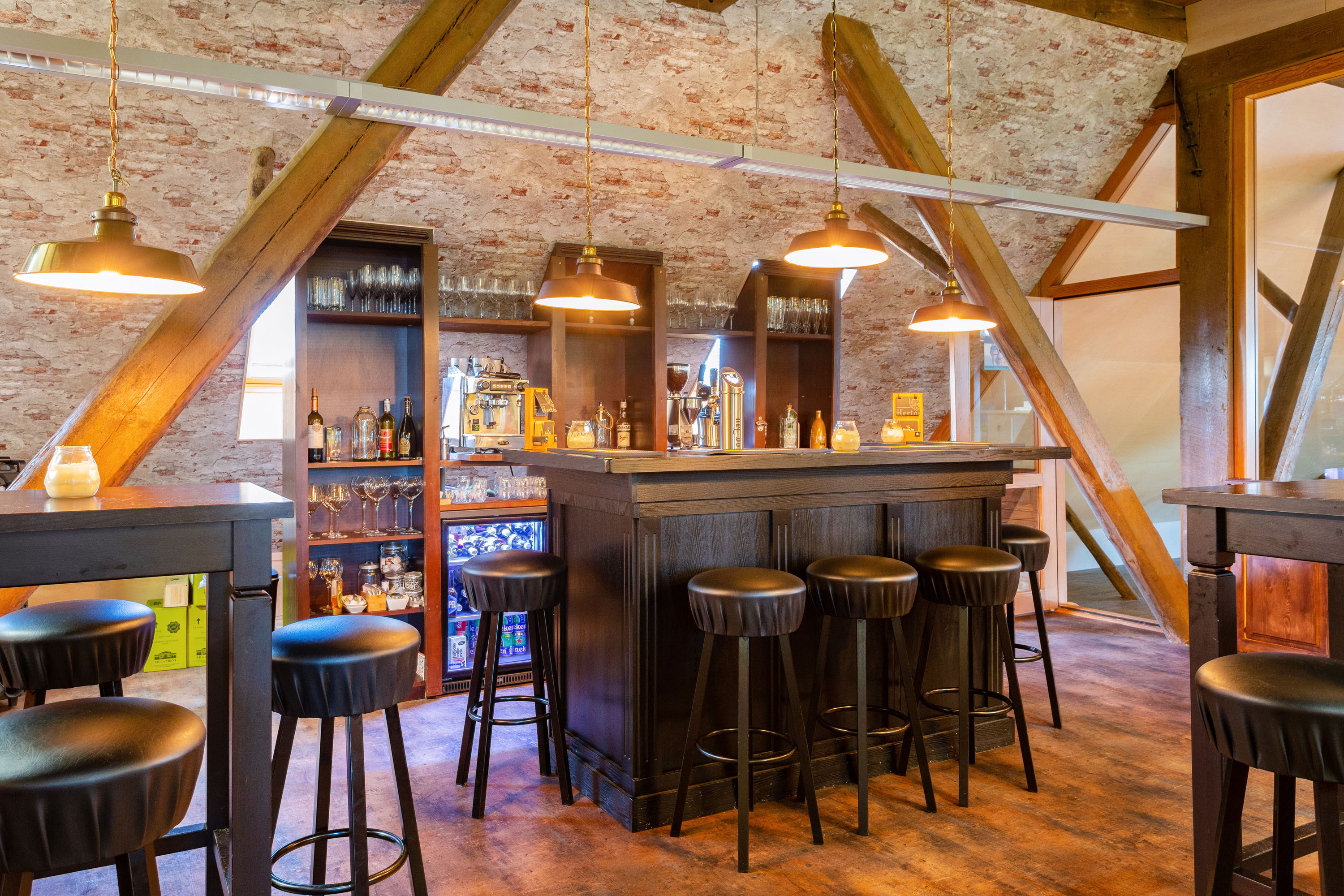 The spacious upper floor of the barn has 3 more beautiful multi-functional rooms plus a huge hobby or entertainment room, a large storage attic, a cozy bar and a fully equipped cooking studio. All in a modern look while retaining old details. The impressive roof of the barn has been beautifully renovated and panelled.
