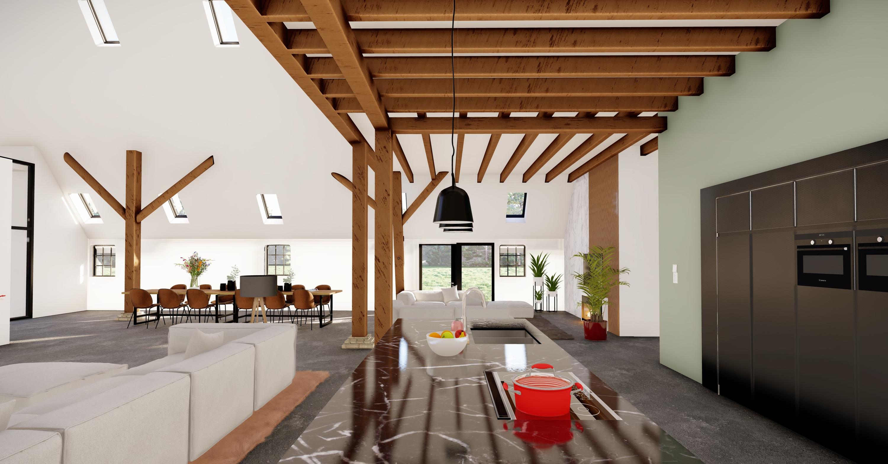 Via two staircases you can reach the 1st floor of the barn where you will also notice the beautiful old wooden trusses and the modern and attractively panelled ridge. This floor has 3 large multifunctional rooms, a large entertainment room with loft, a cozy bar and a professional cooking studio.