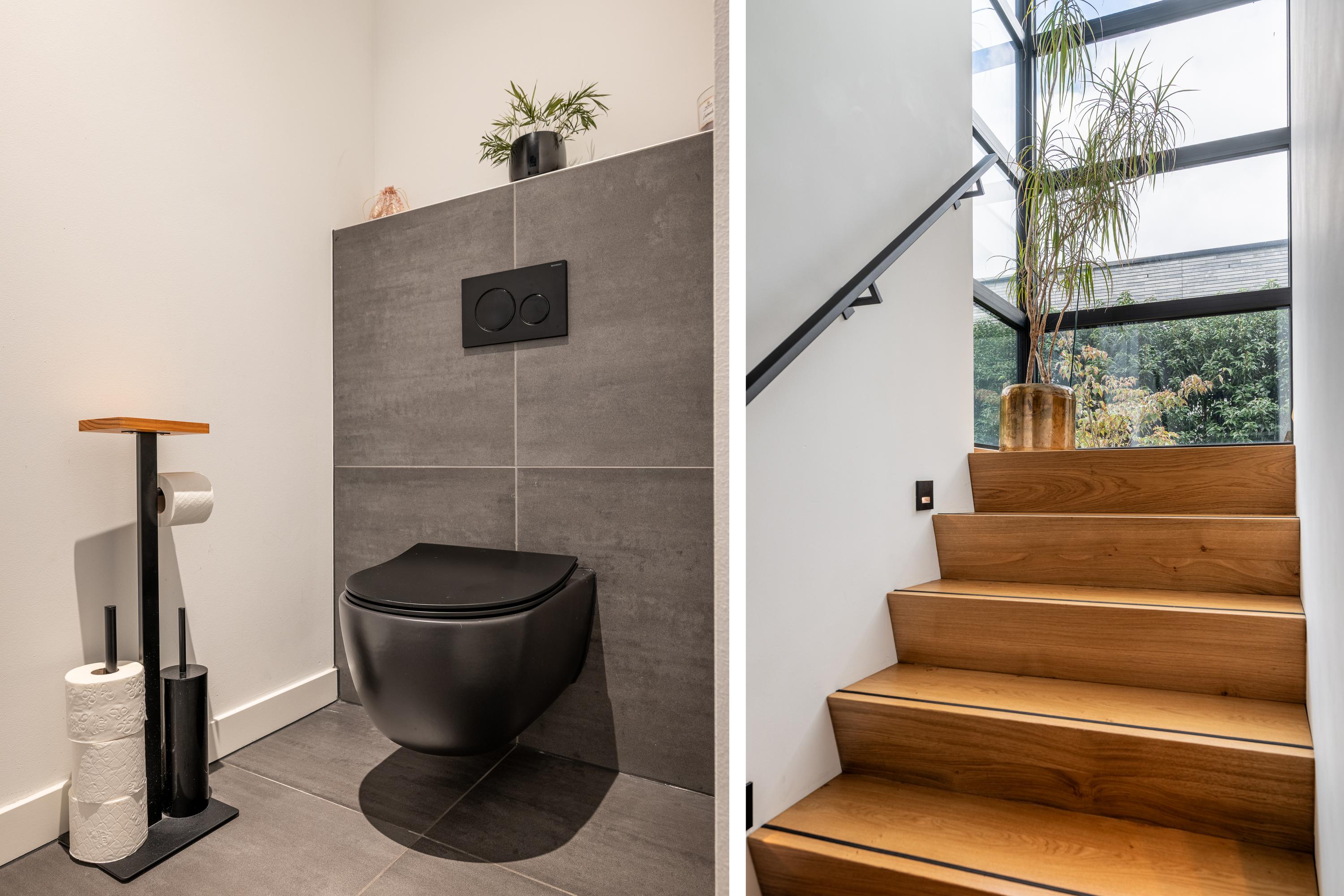 The spacious entrance hall features two aluminum pivot doors that provide access to the living area and the loft with large windows. The hall also provides access to the toilet with a floating toilet and sink. There is also access to the office space on the ground floor. Ideal for people who want to create a home office or a bedroom on the ground floor for lifetime living.
