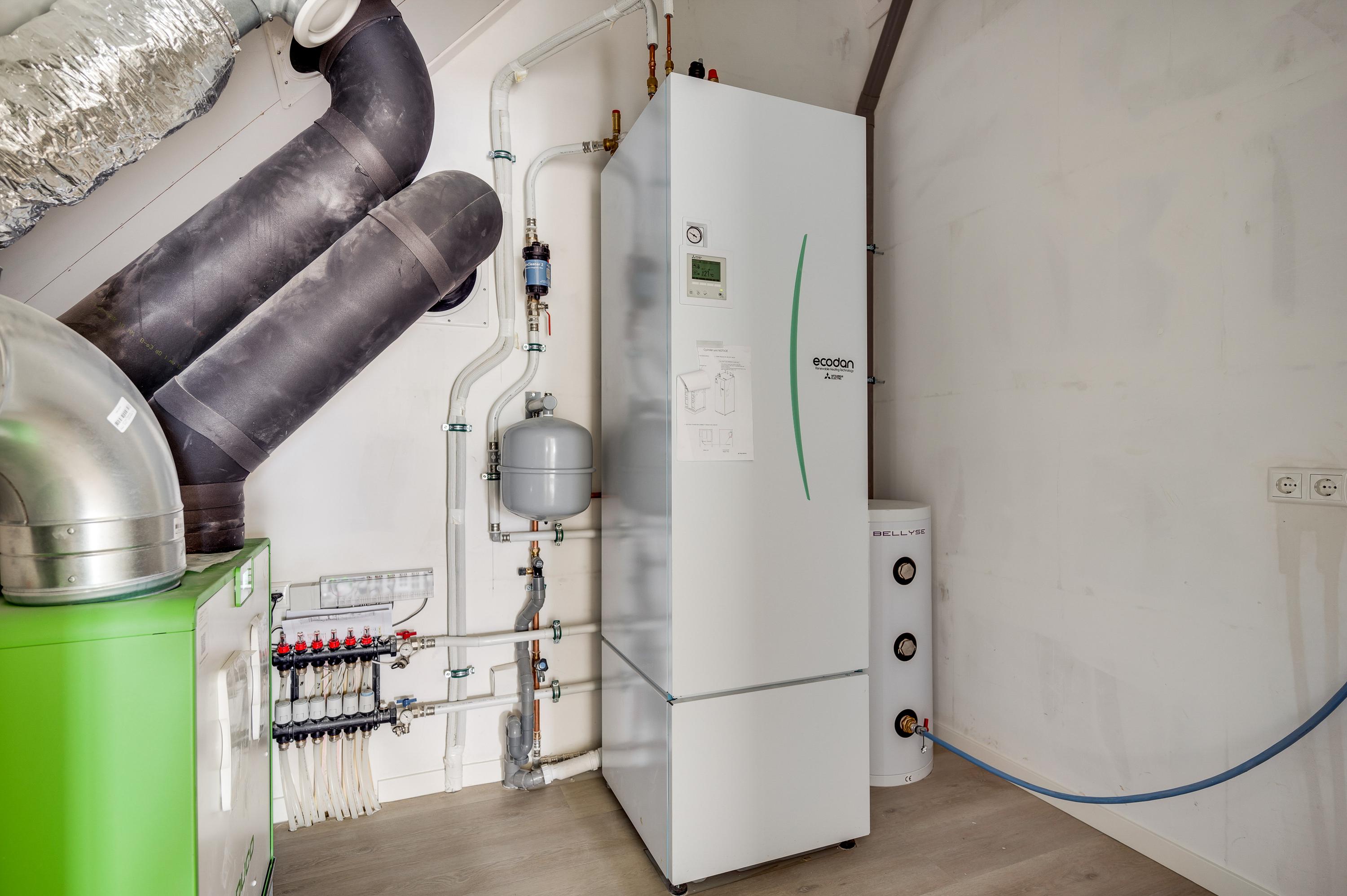 A bar has been created at the end of the island. Here you can enjoy a cup of coffee and the newspaper in the morning or the children can do their homework while you are cooking. All conveniences have been considered, such as a Quooker with hot and cold water, a Bora induction hob, a dishwasher, fridge, freezer and wine climate cabinet from Miele and an oven and microwave from AEG. The utility room is equipped with the white goods connections and has a door to the outside, so you don't have to go through the house with the groceries.
