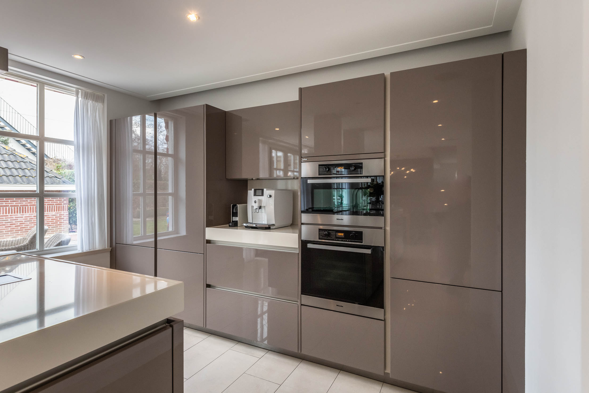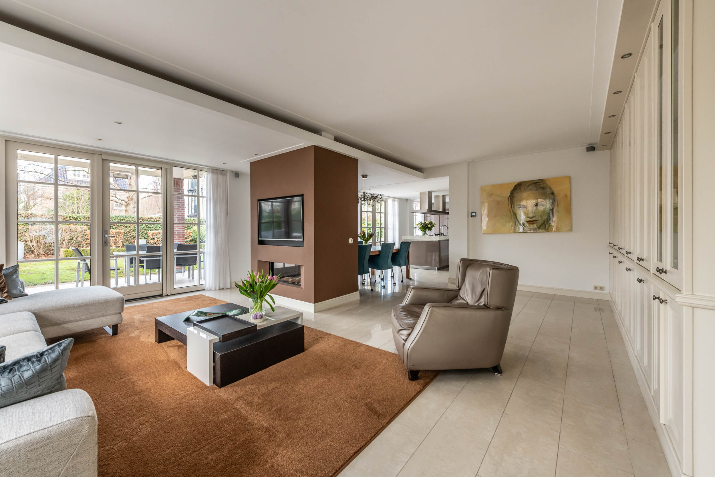 Ground floor: Entrance, large L-shaped hall with wardrobe and WC. From the hall, access is provided to the garage on the right and the living room on the left. At the front of the house are the dining room and a dedicated office space. Through the sliding doors of the dining room, you enter the rear of the house, where a cosy sitting room features a gas fireplace, a wide wall of built-in cupboards, and double doors opening onto the backyard. The spacious, modern SieMatic kitchen is open to the living room and features a large cooking island equipped with a built-in teppanyaki plate and an induction wok, along with additional features. One wall is fitted with a range of modern kitchen appliances. The utility room, accessible from both the garage and the kitchen, is equipped with a washing machine connection and a kitchen unit with a sink. The double French doors open onto a beautiful, spacious garden featuring a partially covered terrace, multiple seating areas, and a stylish garden shed.
