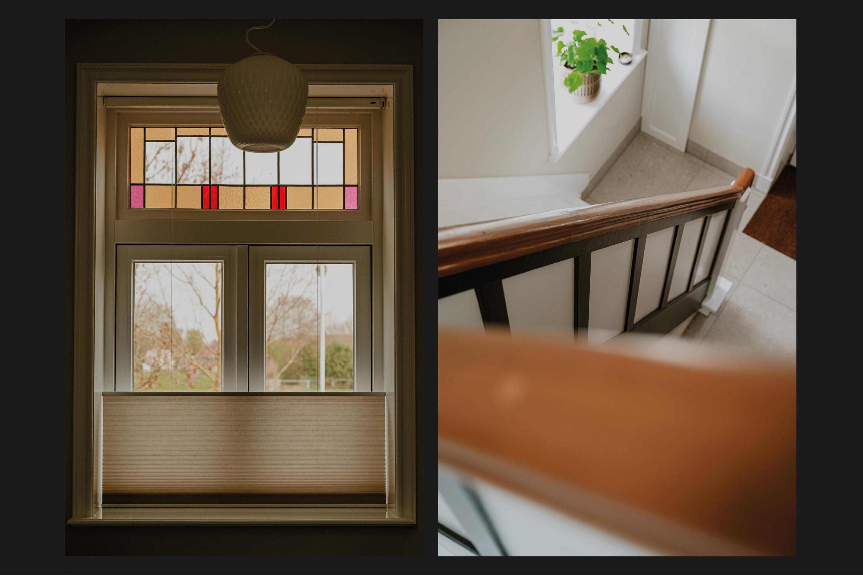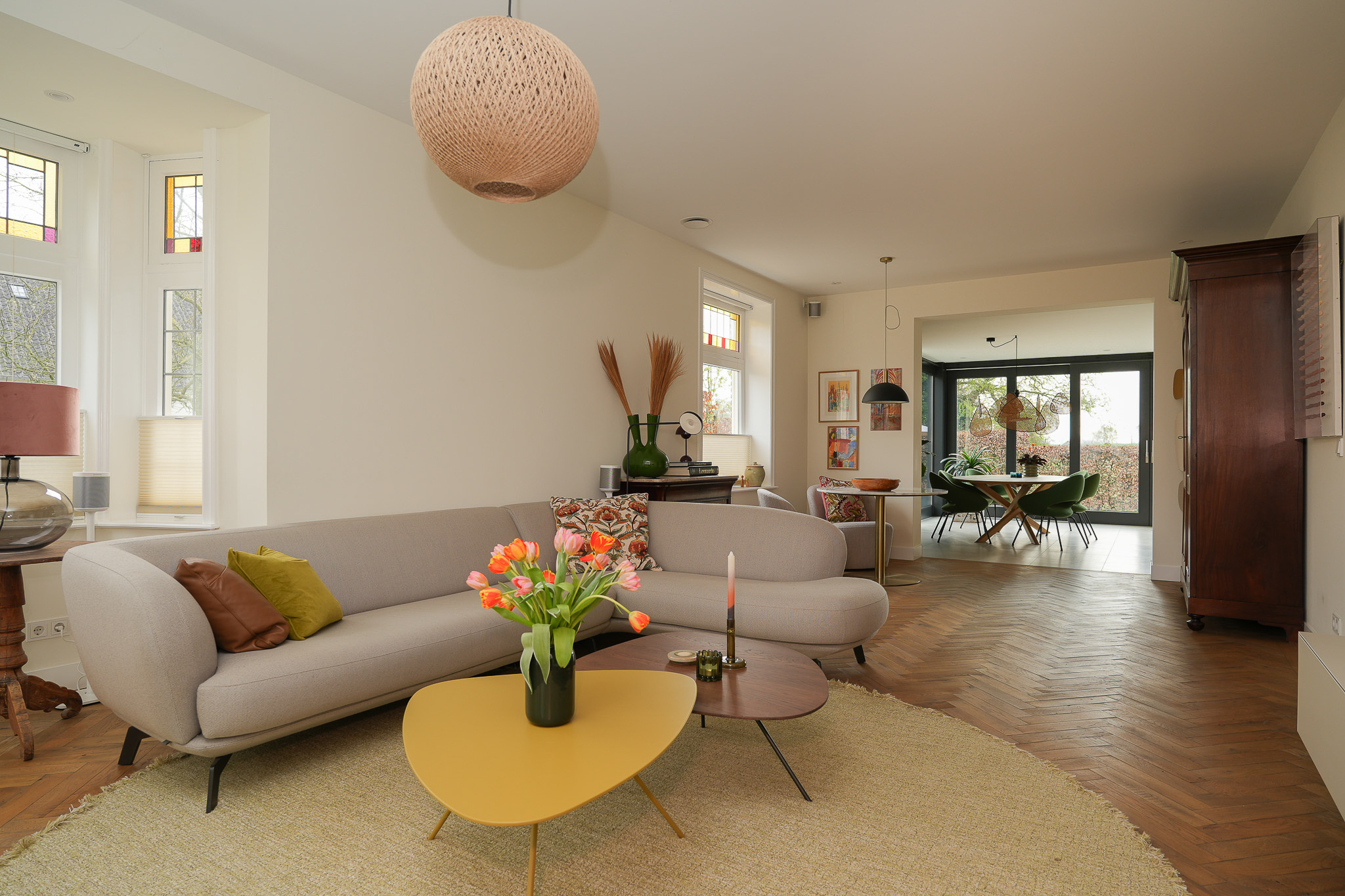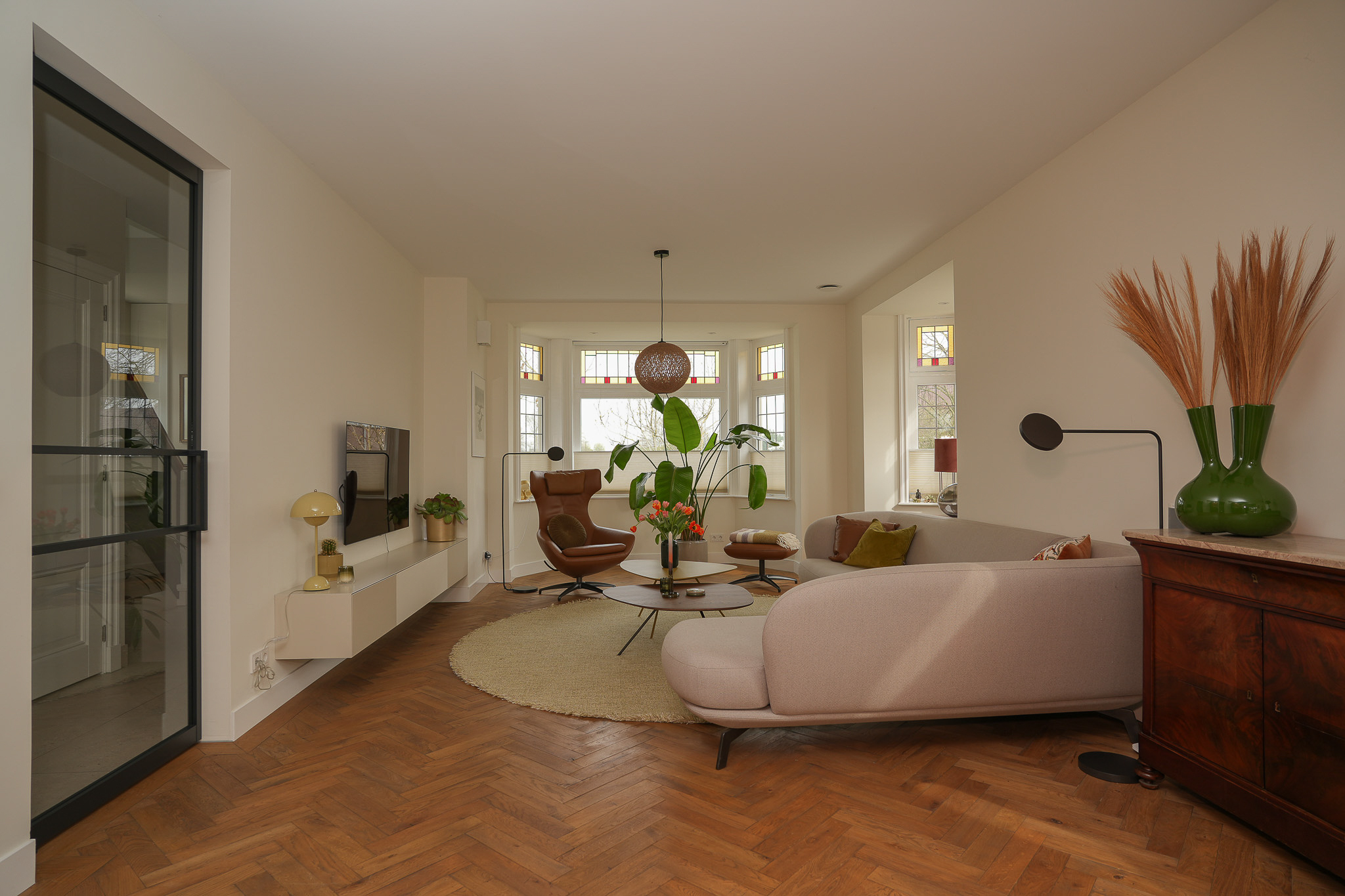 A steel pivot door leads into the living room at the front. Here, character and comfort come together naturally. The bay windows, stained glass details and herringbone parquet flooring give the space a warm and inviting atmosphere that perfectly complements the home’s overall appearance.