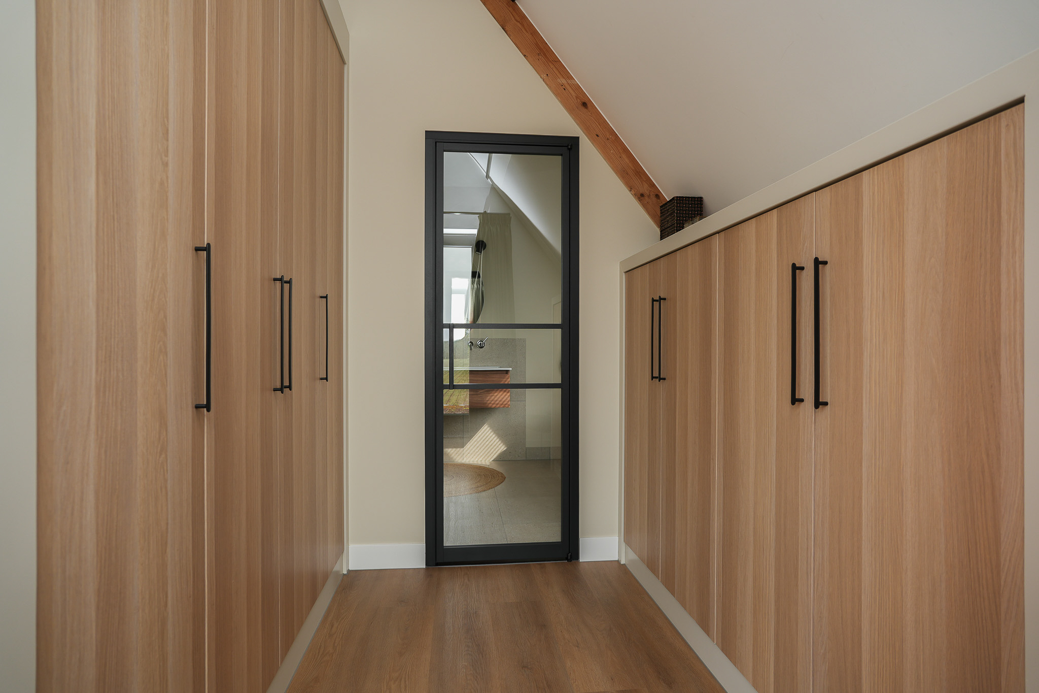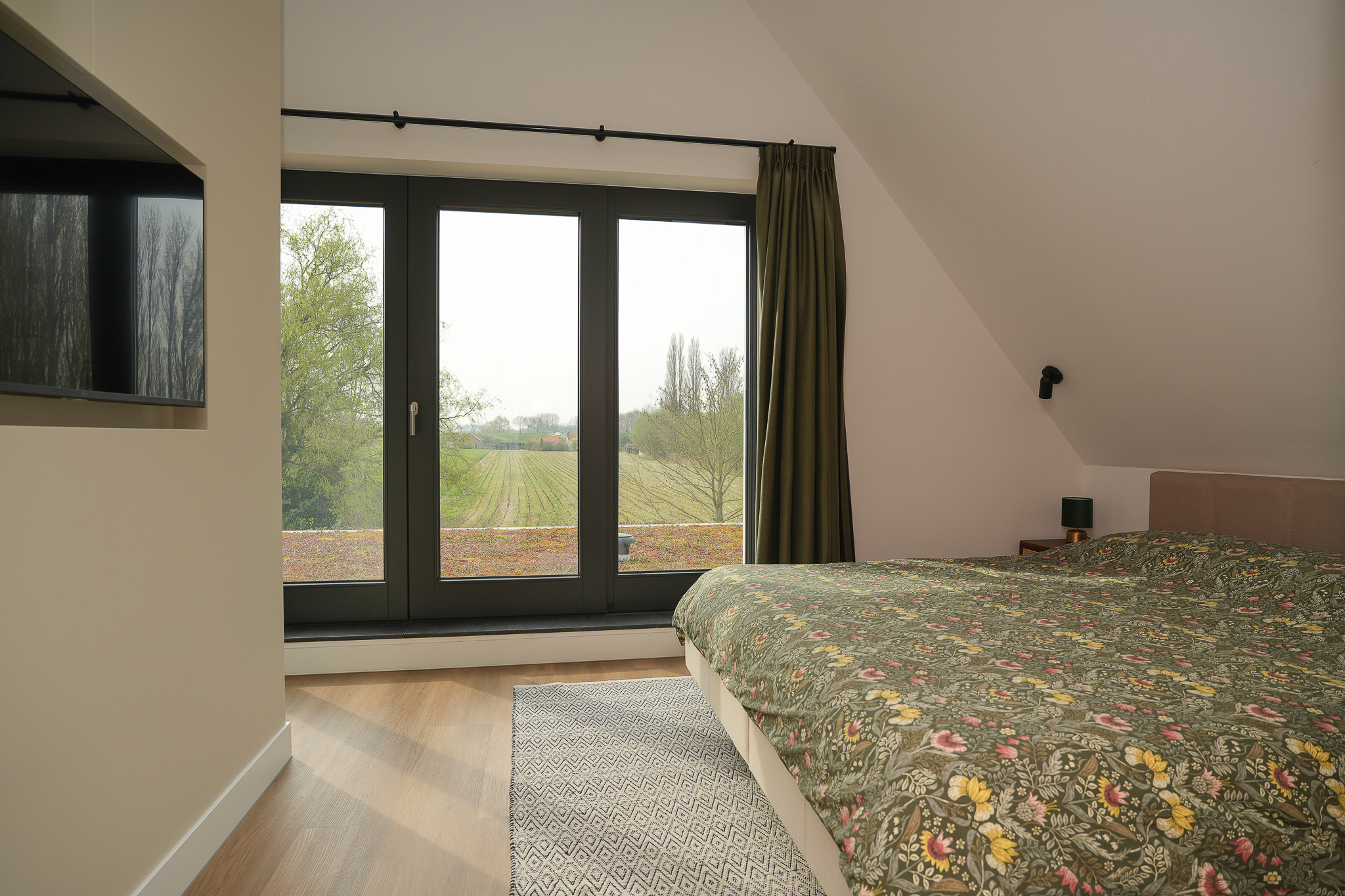 At the rear is the main bedroom, a calm and light-filled space with unobstructed views over the surrounding fields and the dike. Adjacent is the walk-in closet, fitted with custom cabinetry. From here, a black steel door leads into the bathroom. In addition, the bedroom provides access to the sedum-covered flat roof of the kitchen extension, where a terrace has been created — a sheltered spot with open views over the greenery.