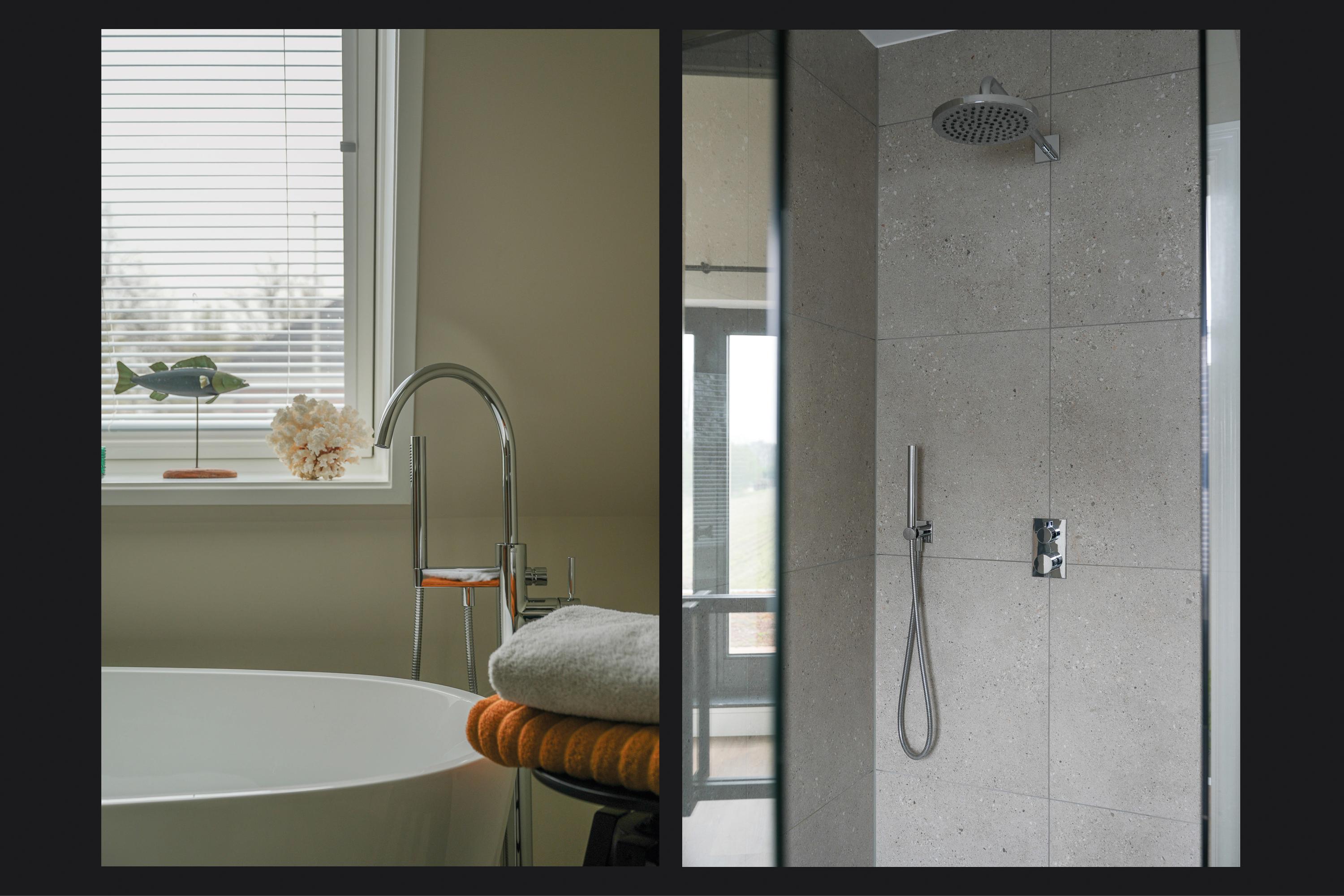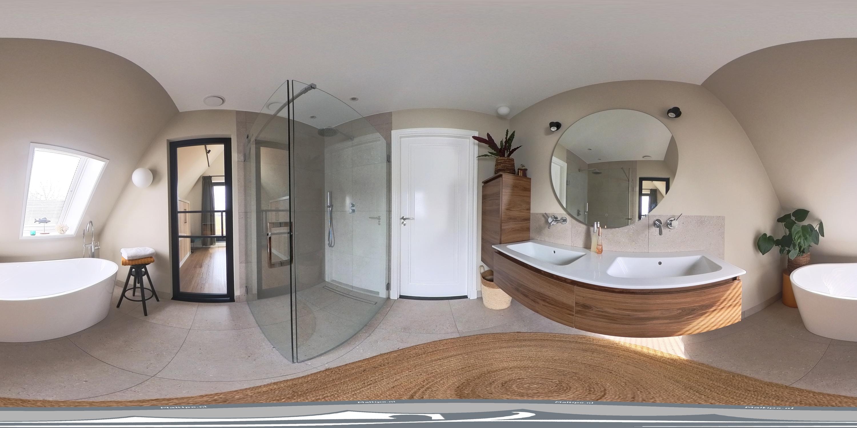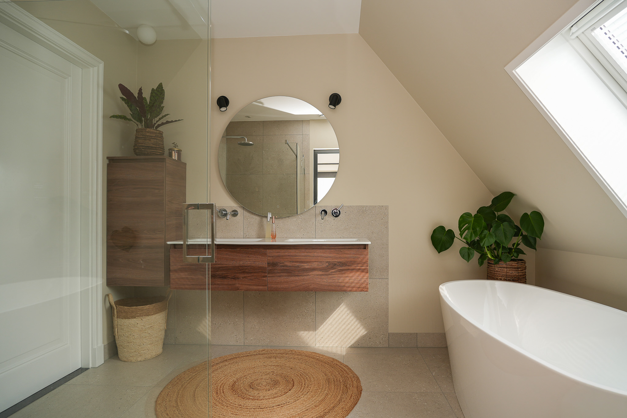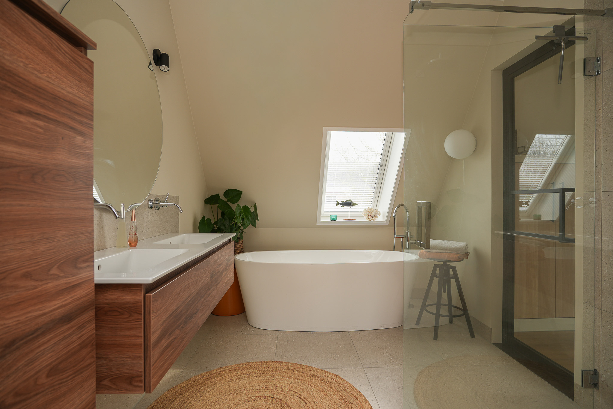 The bathroom is also accessible from the landing and is finished in a timeless style with large wall and floor tiles and refined sanitary fittings. It features a freestanding bathtub, a walk-in shower with rain shower and a double vanity unit.
