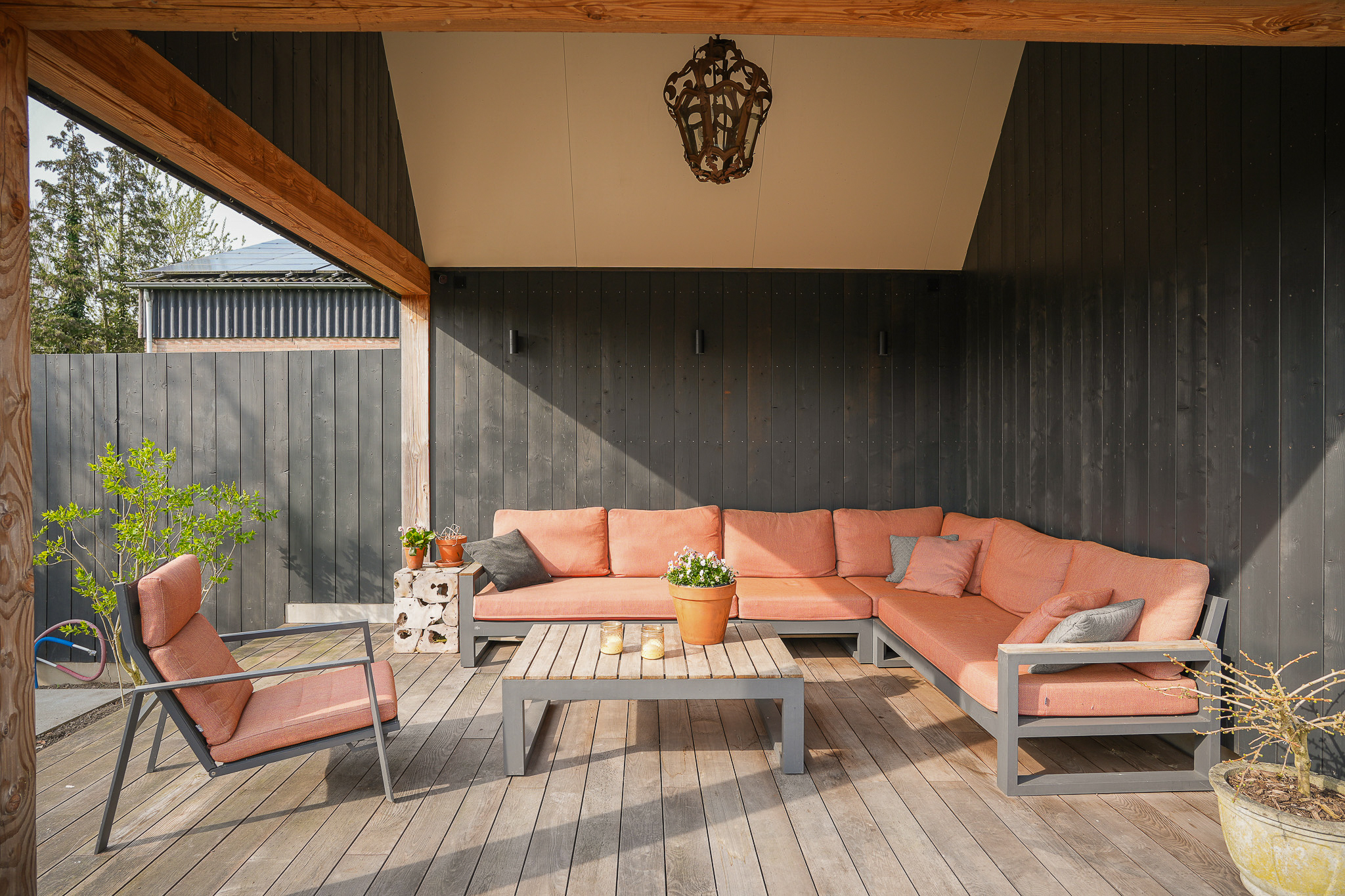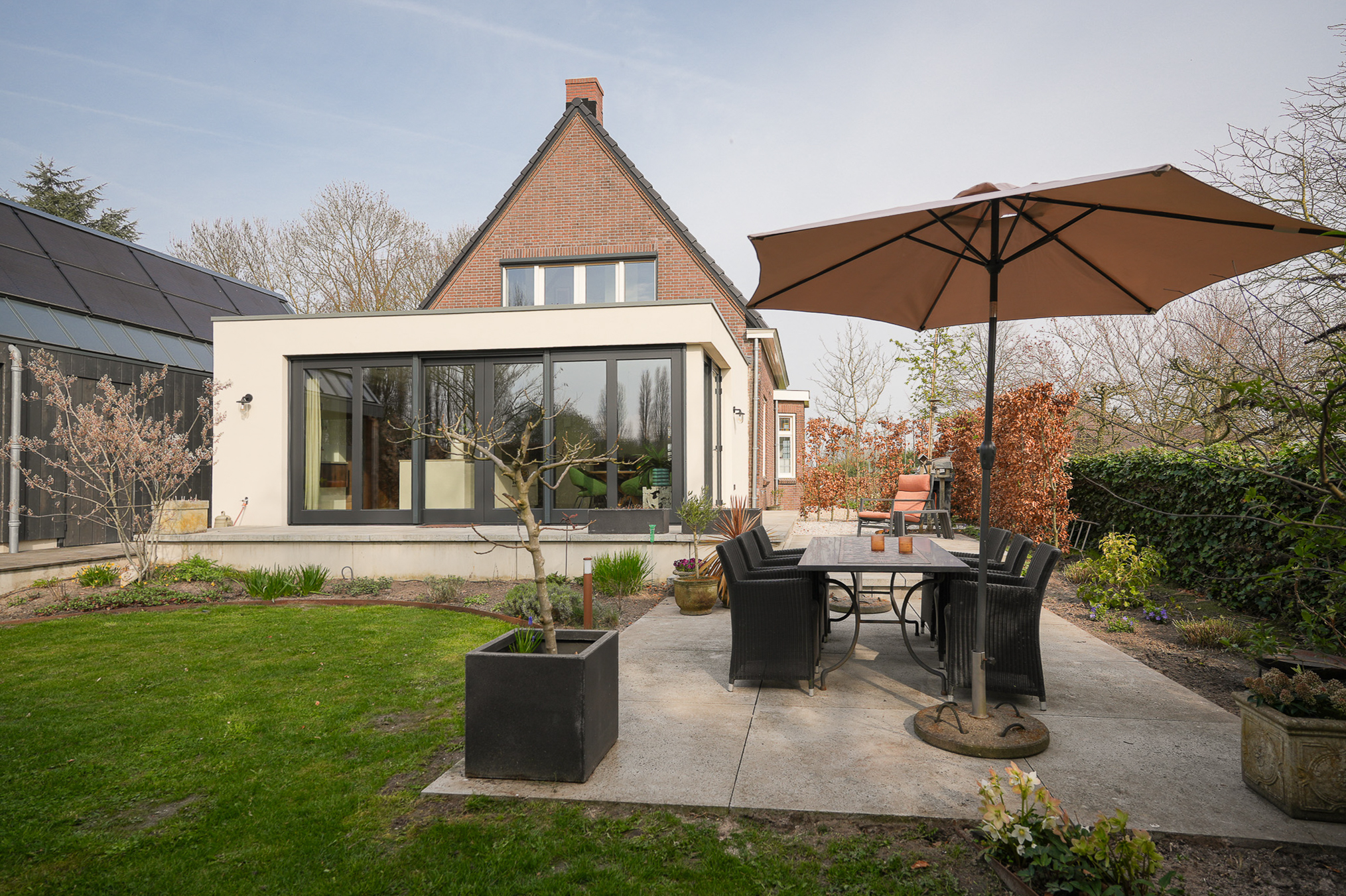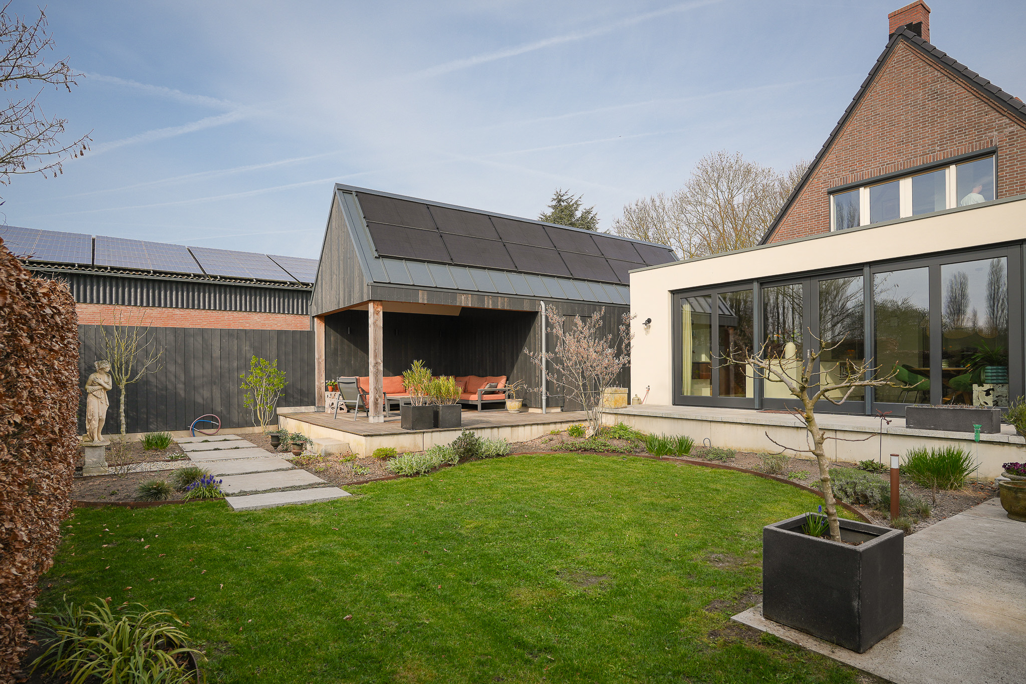 Next to the house is the outbuilding, which extends along the length of the garden and forms a natural part of the overall layout. On the garden side, it features a veranda currently arranged as a comfortable lounge area.
