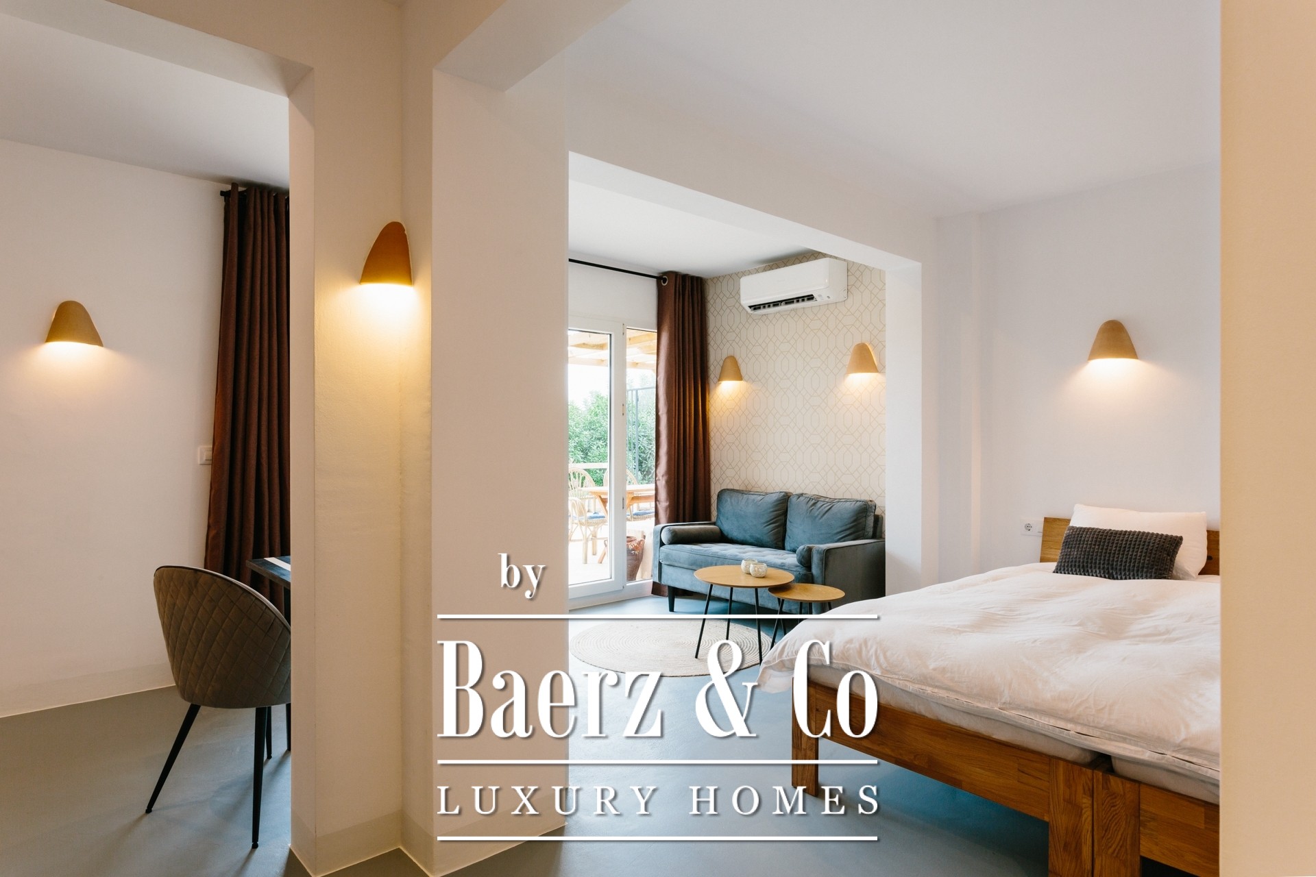 A staircase leads to the lower level of the property, where the 4 independent studio apartments are located — each designed to a high standard. All offer a private kitchenette, an en-suite bathroom and access to individual terraces that connect seamlessly to the landscaped garden.