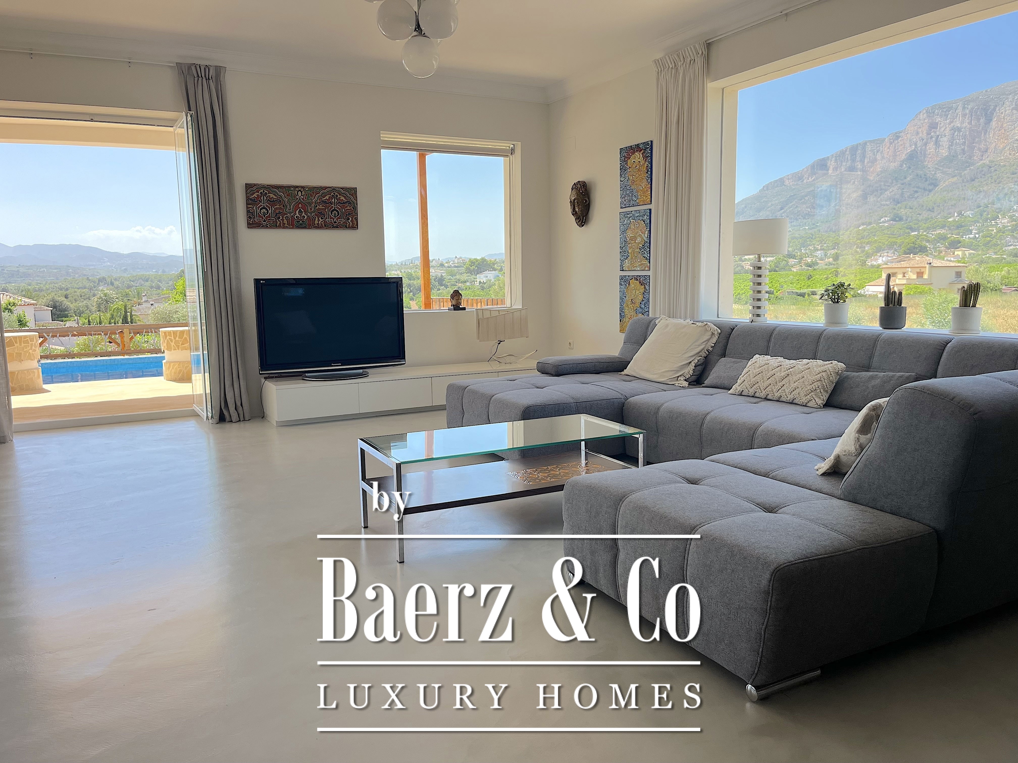 The spacious living room features expansive views of the Montgó, while the large, practical kitchen includes a walk-in pantry and separate utility room. Both the kitchen and living room open directly onto several covered terraces that surround a spectacular 10 x 5 metre swimming pool.