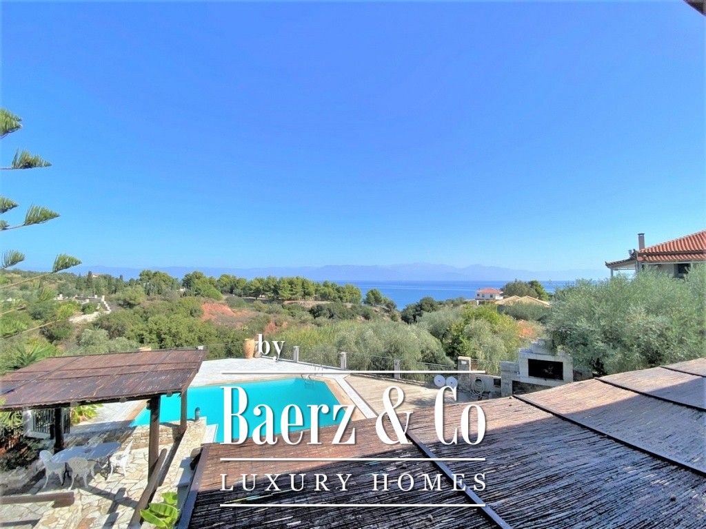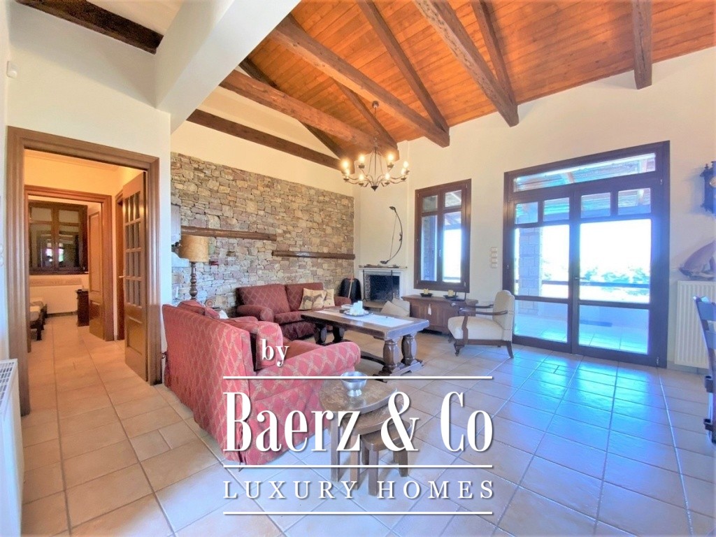 Country house. In the settlement of Kalamaki, just 200 meters from the local beach, a unique two-level house is for sale. The area of the building is 320 sq.m., it is located on a plot of 2.000 sq.m., it is divided into three different apartments and due to the slope of the ground it is formed in two partitions. The main house, which is located on the highest floor, is approached from a paved courtyard beautifully landscaped with lawns and ornamental trees around. In it we will find the living room which is open plan with the kitchen. From this area we have