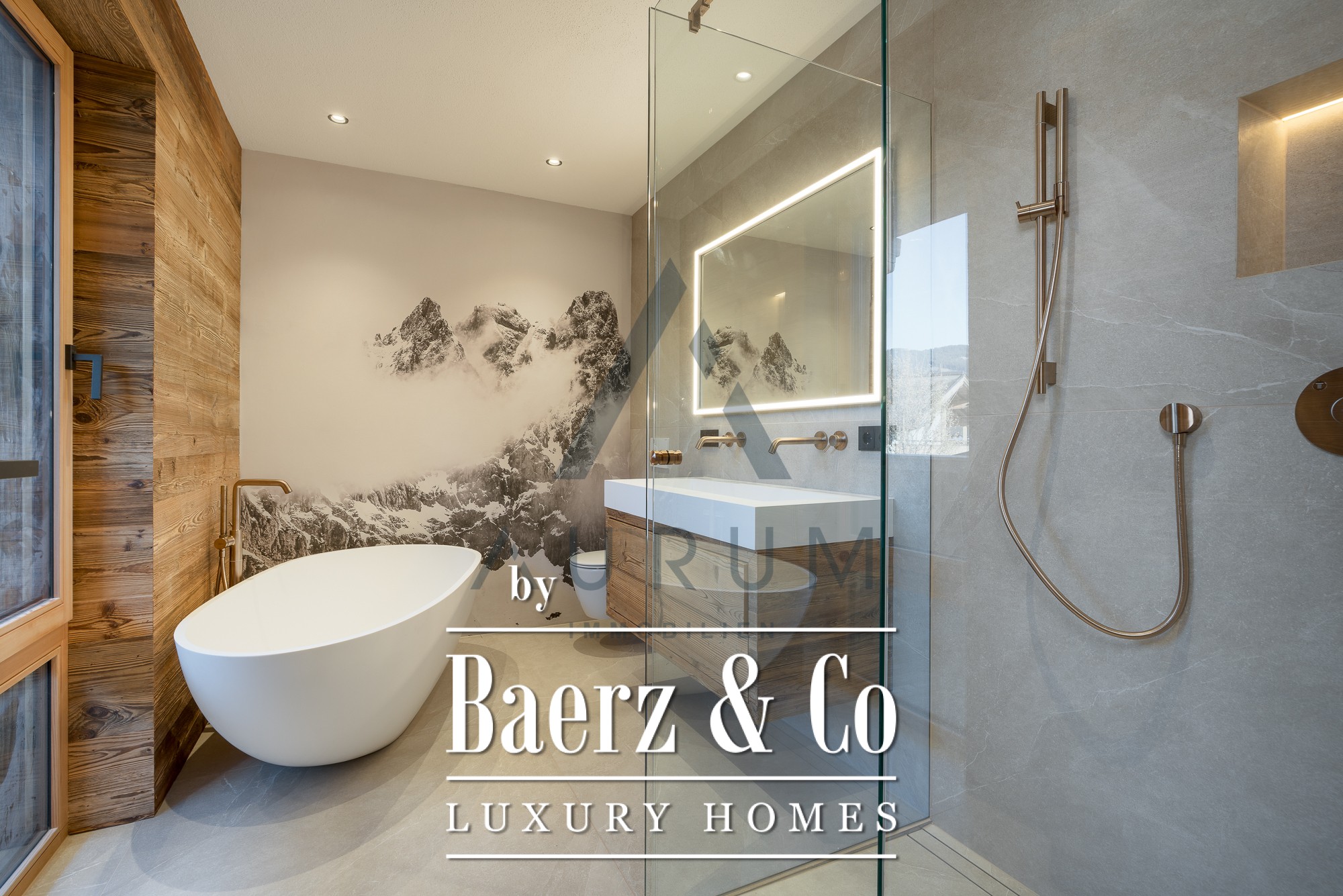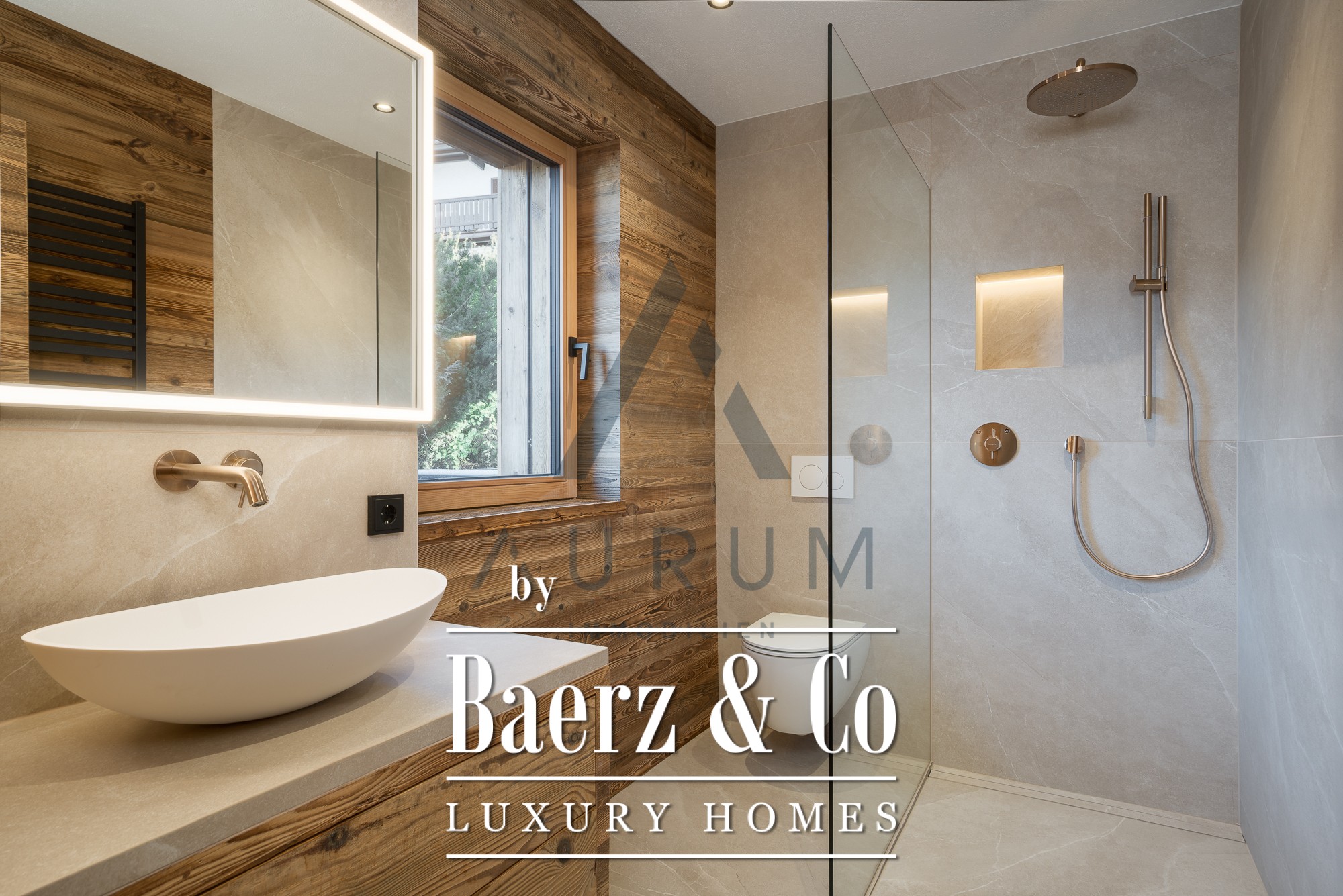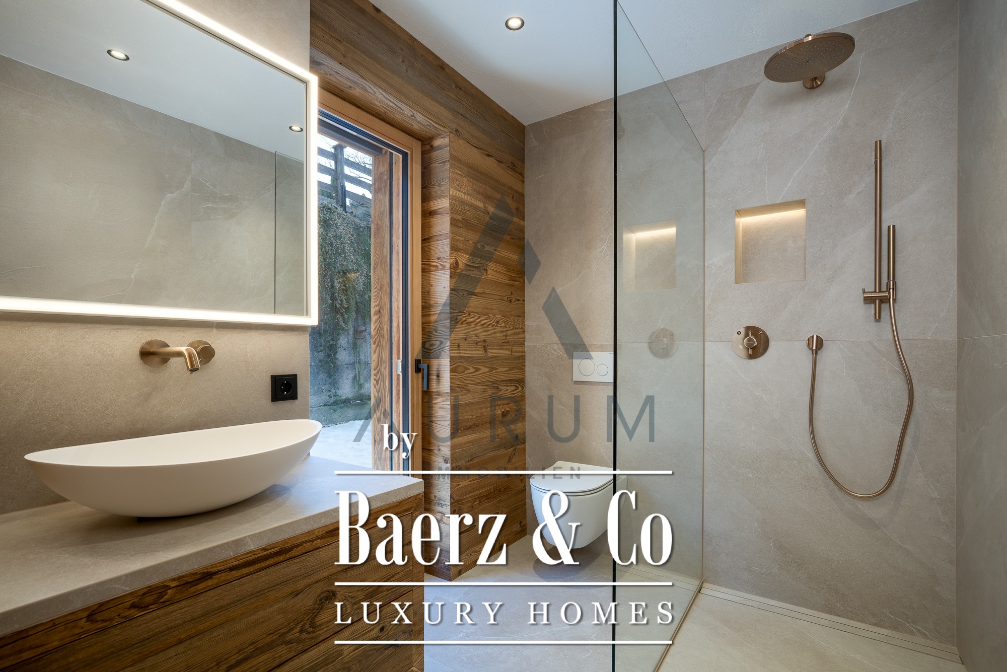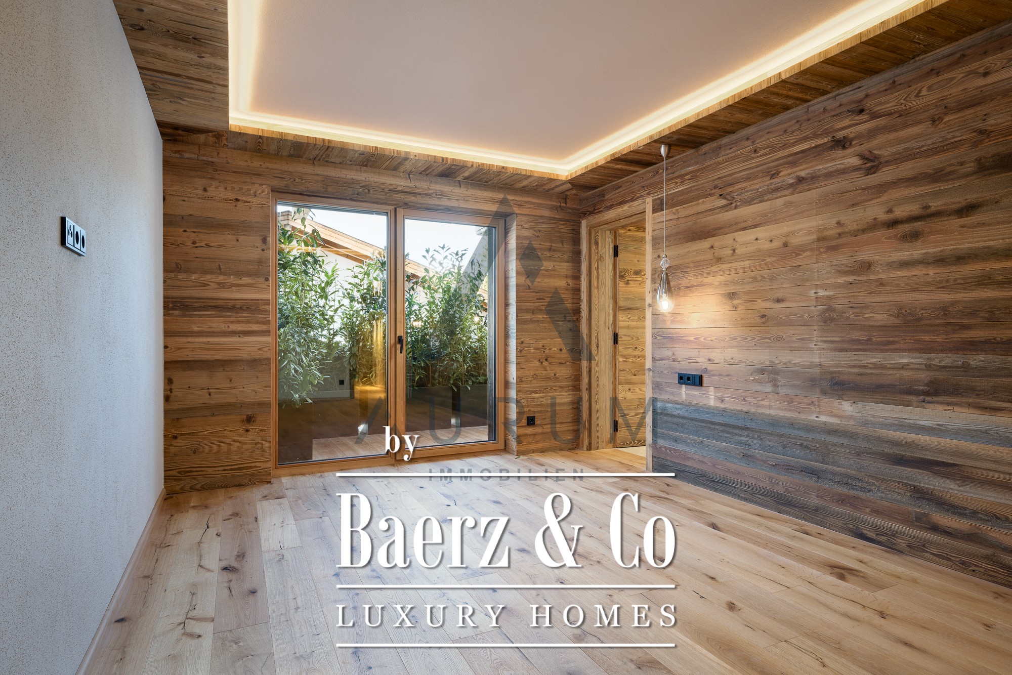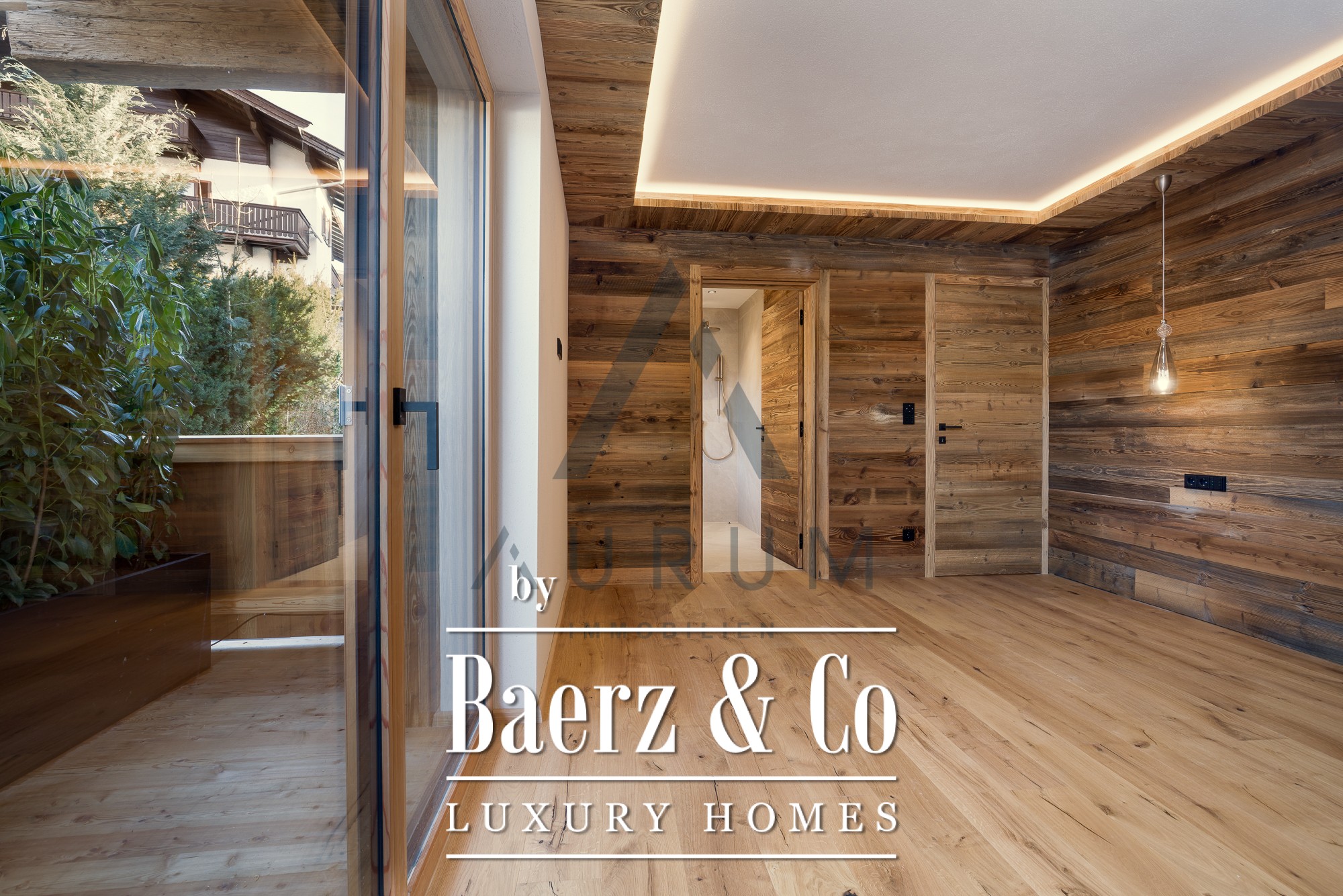 A grand staircase or private elevator ushers you into 200 m² of living space, where reclaimed wood, natural stone, and glass compose a facade attuned to Kitzbühel's modern vernacular. Inside, the first level’s three fully furnished bedrooms each offer bespoke carpentry, built-in wardrobes, and en-suite bathrooms, all connected by a thoughtfully proportioned hall. The master bedroom leads directly to a sun-bathed balcony, lending a distinct sense of retreat.