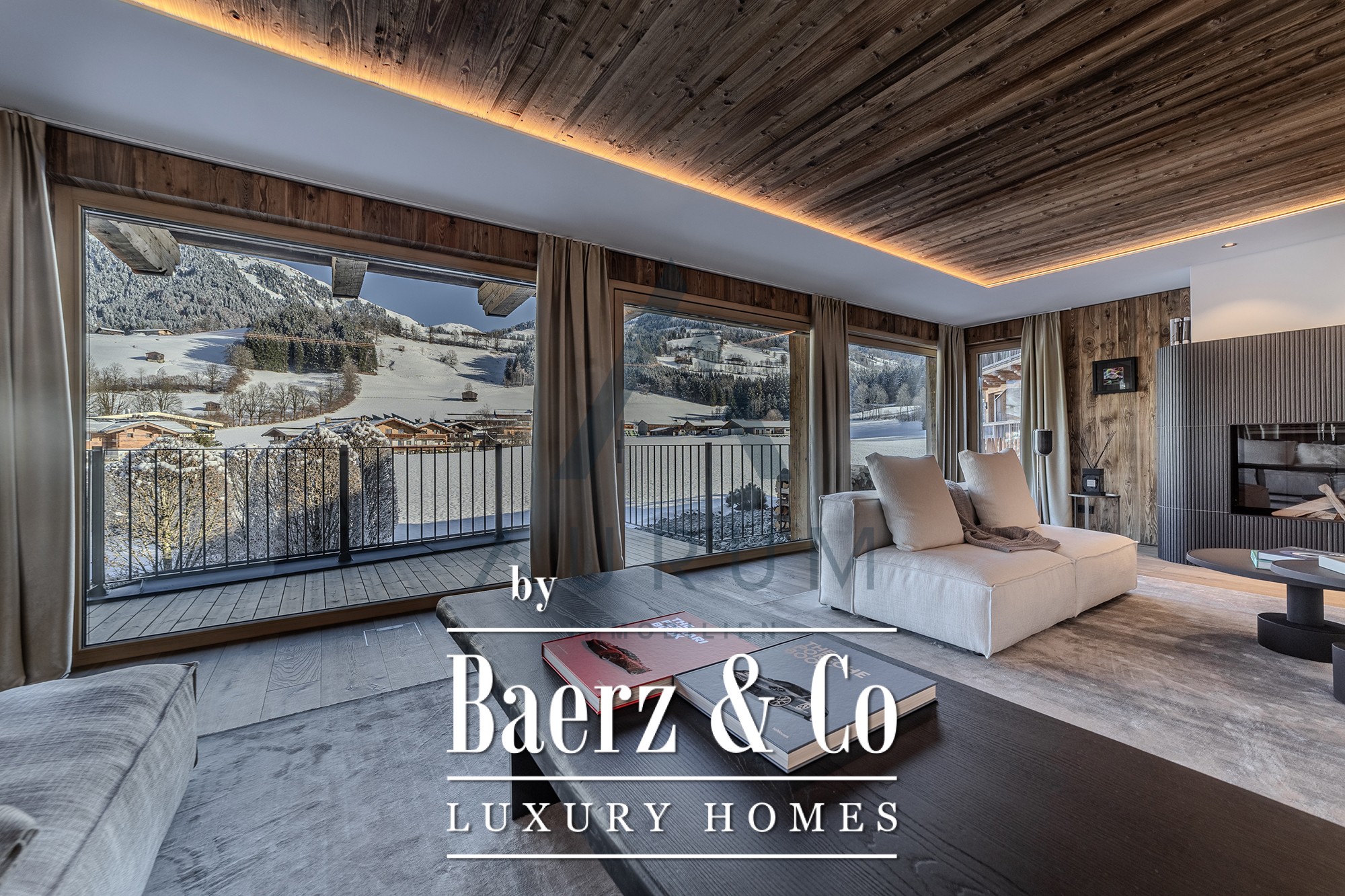 This garden apartment Kitzbühel presents 279 m² of considered living space at the foot of the Bichlalm, framed by Alpine light and panoramic mountain views. The open-plan living, dining, and kitchen area is anchored by a fireplace and high-end finishes throughout, while full-height glass connects the space to the garden and terrace, inviting both views and quiet rhythm into daily life.