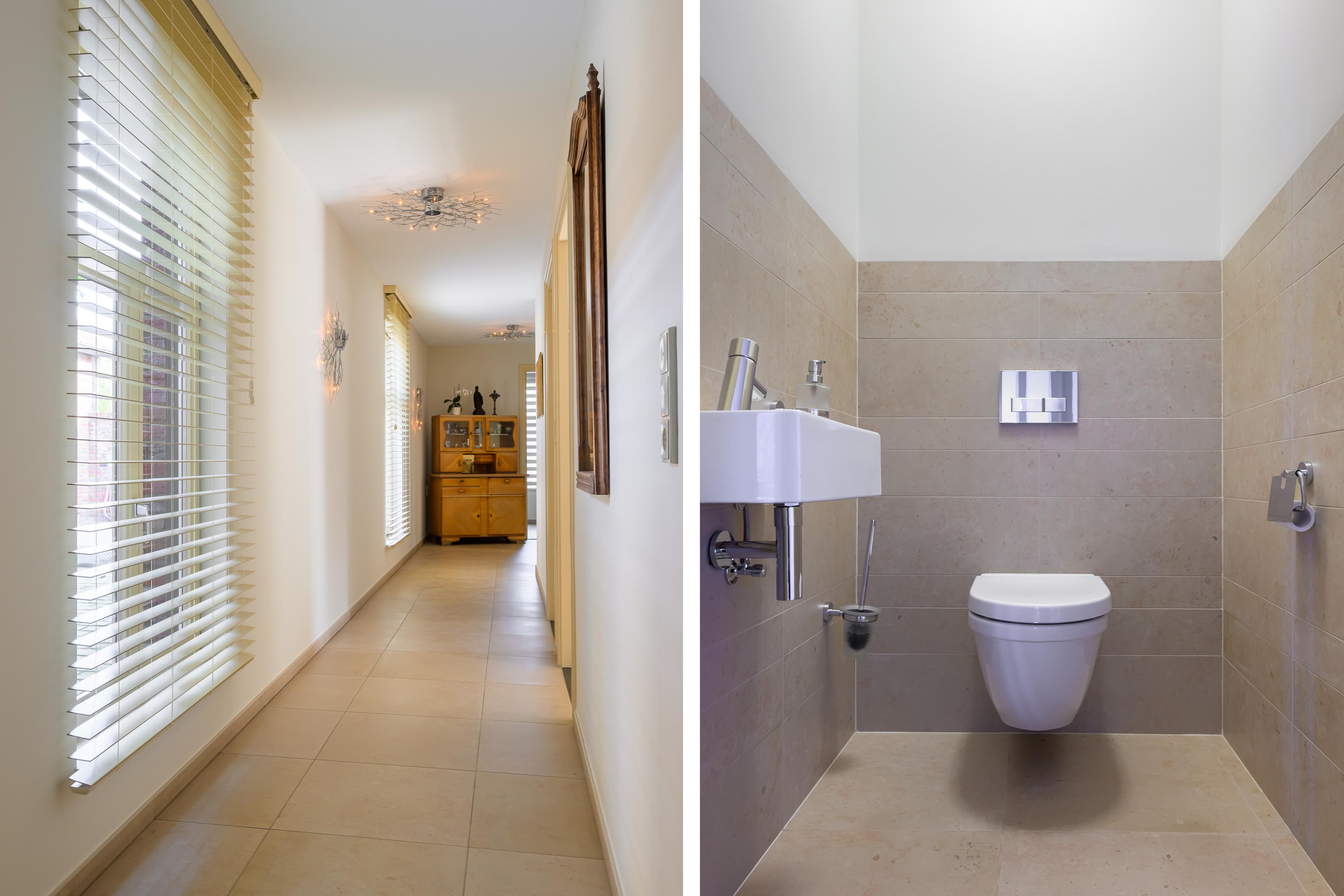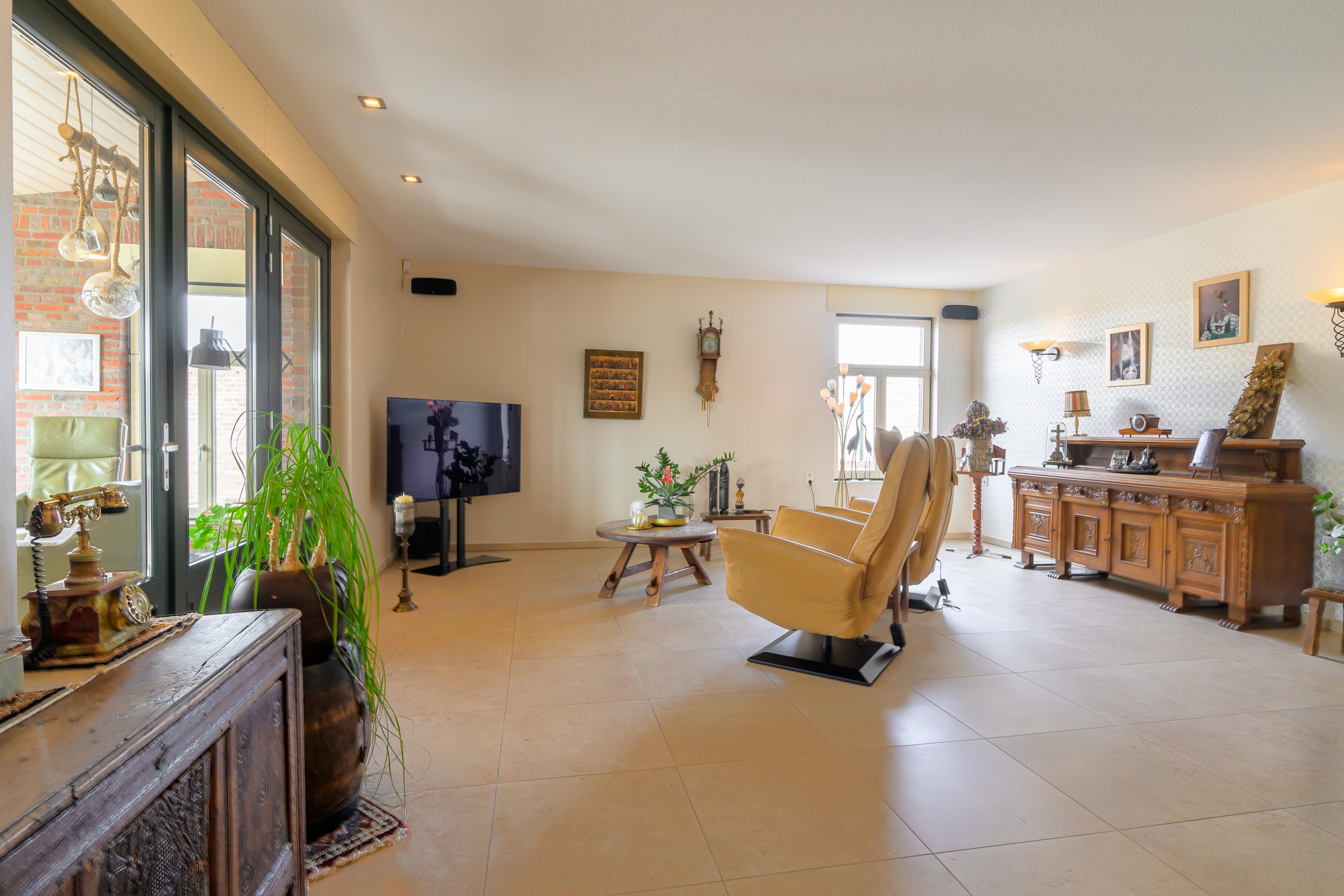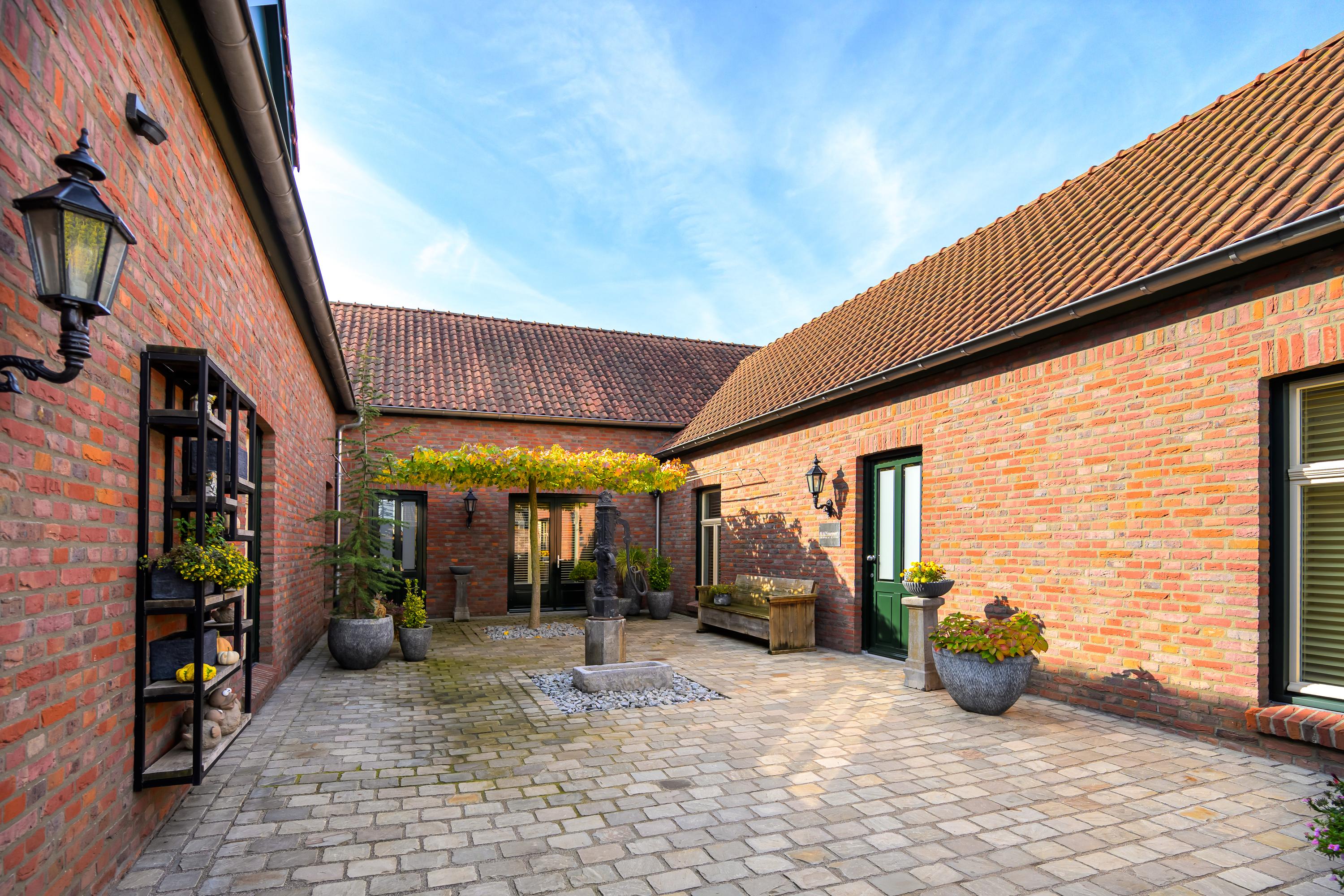 Deze luxe afgewerkte woning is gebouwd in een U-vorm met een sfeervolle binnenplaats. Aan de linkerzijde ligt het woongedeelte. Bij binnenkomst in de royale hal valt direct de prachtige plavuizenvloer op, samen met de meterkast, trapopgang naar de eerste verdieping en een stijlvol toilet met fonteintje. Vanuit de hal komen we in de ruime woonkamer, gekenmerkt door strak gestucte wanden, inbouwspots en openslaande tuindeuren naar de binnenplaats. Warme kleuren, zachte stoffen en naturel materialen; allemaal ingrediënten die bijdragen aan een huiselijk 'ik kom thuis'-gevoel. Dit alles vind je zeker terug in deze prachtige woonkamer. Alles is netjes, maar vooral sfeervol en luxe afgewerkt.