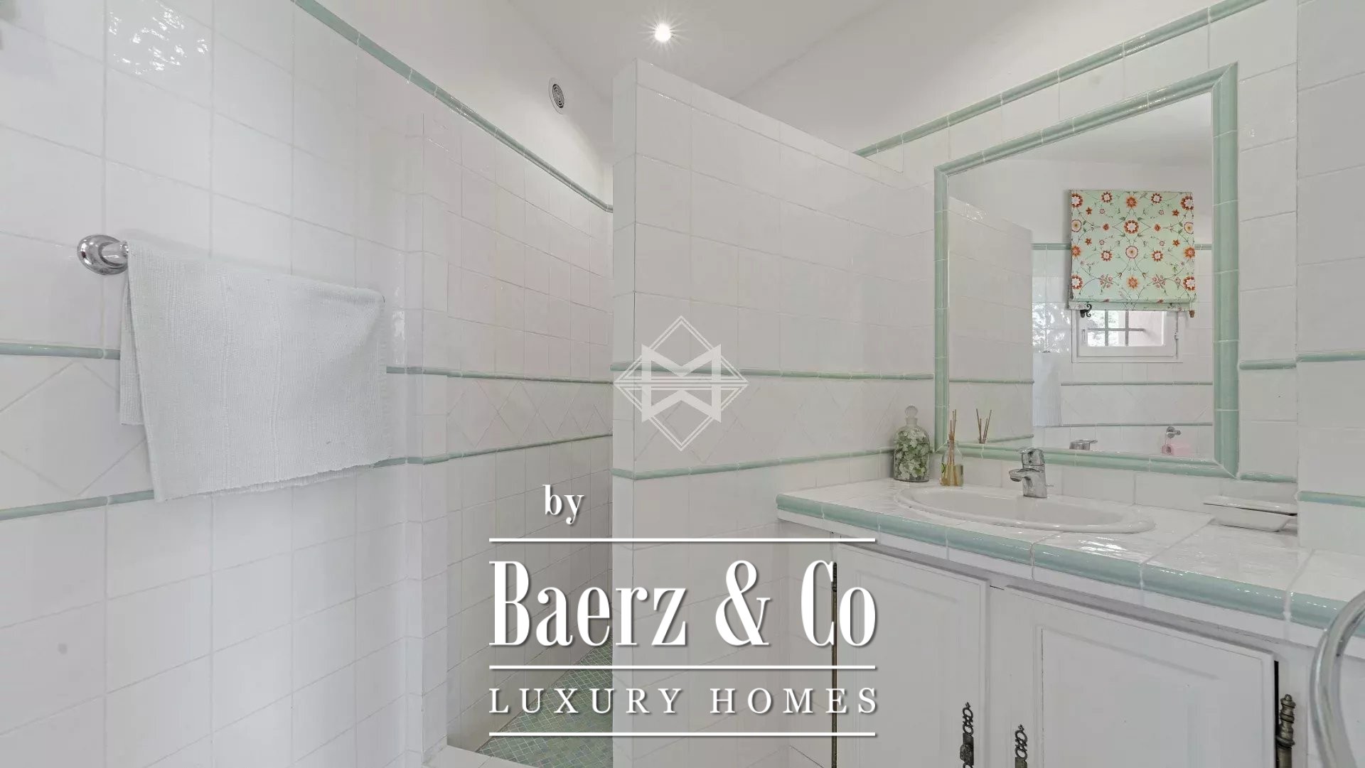 On the garden level, three bedrooms and two shower rooms open onto a spacious, private terrace. An independent apartment includes a kitchen and living room, both opening onto the large terrace and the garden, which features tastefully landscaped terraced grounds.