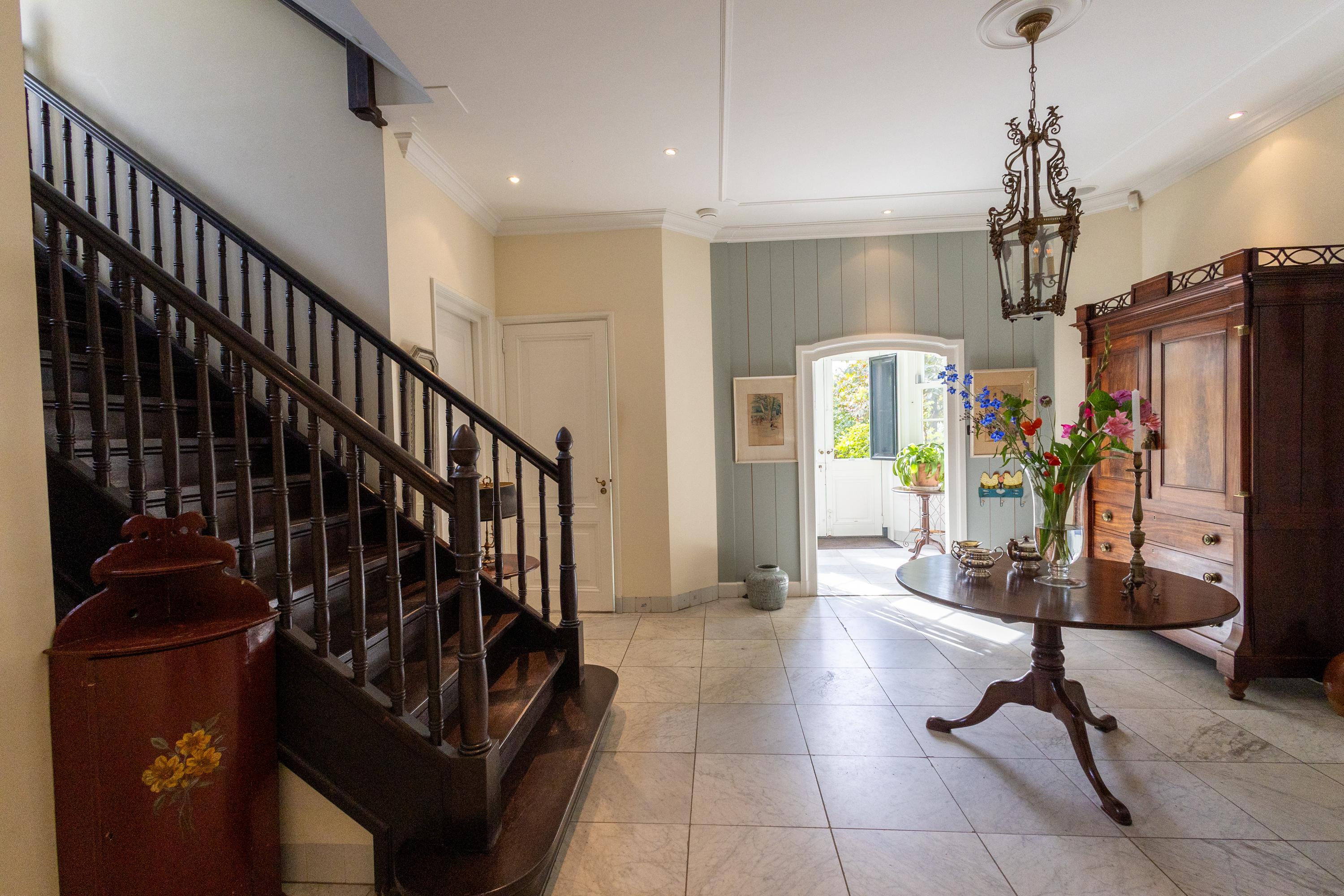 Inside, the villa is as surprising as it is enchanting. With a living area of approximately 350 m² and an additional 150 m² in the basement, the house offers an abundance of space. The ceilings on the ground floor reach nearly three meters high, giving every room a sense of airy openness. The stately entrance hall, with its fireplace and sweeping staircase, feels like a promise of what’s to come.