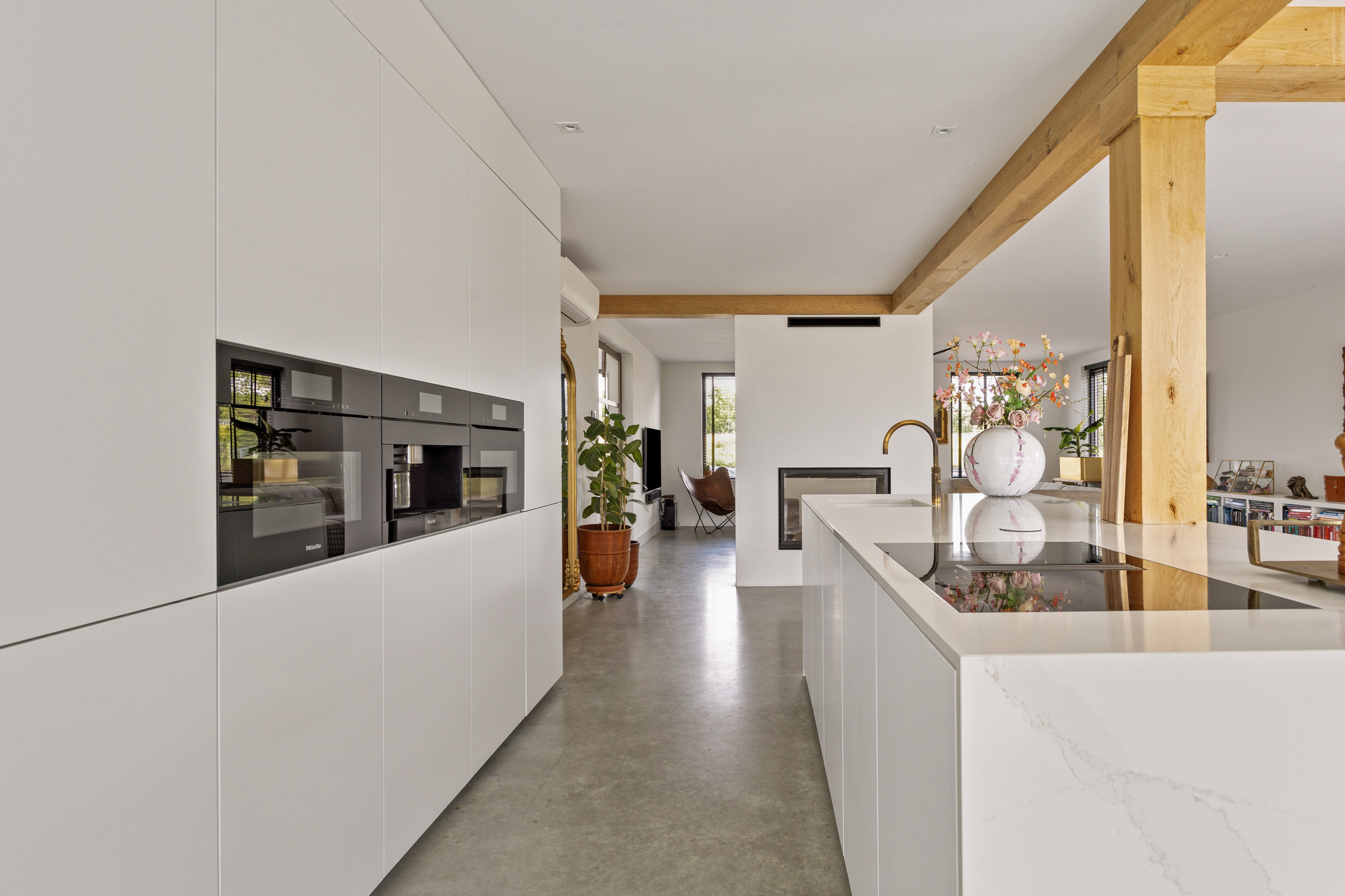 The open-plan kitchen is sleek and modern, equipped with a cooking island and built-in appliances. With ample storage and high-quality appliances, including Miele built-ins, a Quooker tap, and Hotbath Cobber faucets, it’s designed for culinary enthusiasts. The dining area at the rear of the house is ideal for a large family table, offering stunning views of the pool and surrounding meadows.