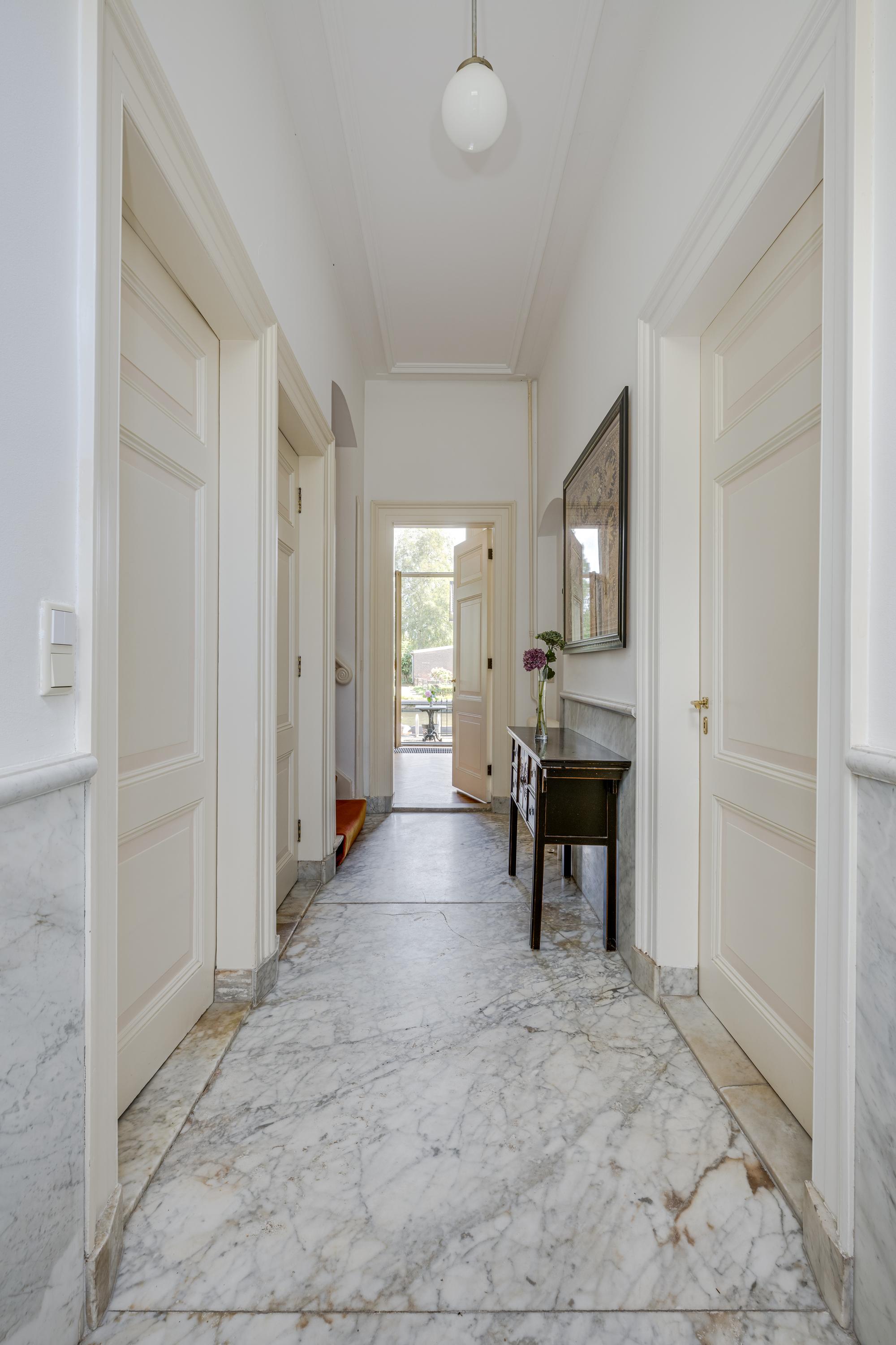 The main building from 1820 is characterised by the classic style elements from that period: a central entrance with two windows with shutters on either side and on the first floor the beginning of the roof with a central facade with three windows with shutters. The characteristics characteristic of this construction period are also present inside; high stately ceilings and windows on all sides provide beautiful light at any time of the day. On the ground floor there is an L-shaped living room en suite, fireplace with a conservatory on the garden side and a view of the Rhine on the water side. The central hall runs from front to back and has French doors to the garden with terrace on the water side. On the left side of the hall are the kitchen with utility room with a passage to the barn, the spacious basement and the formal dining room with again a beautiful view of the Rhine and the passing boats.