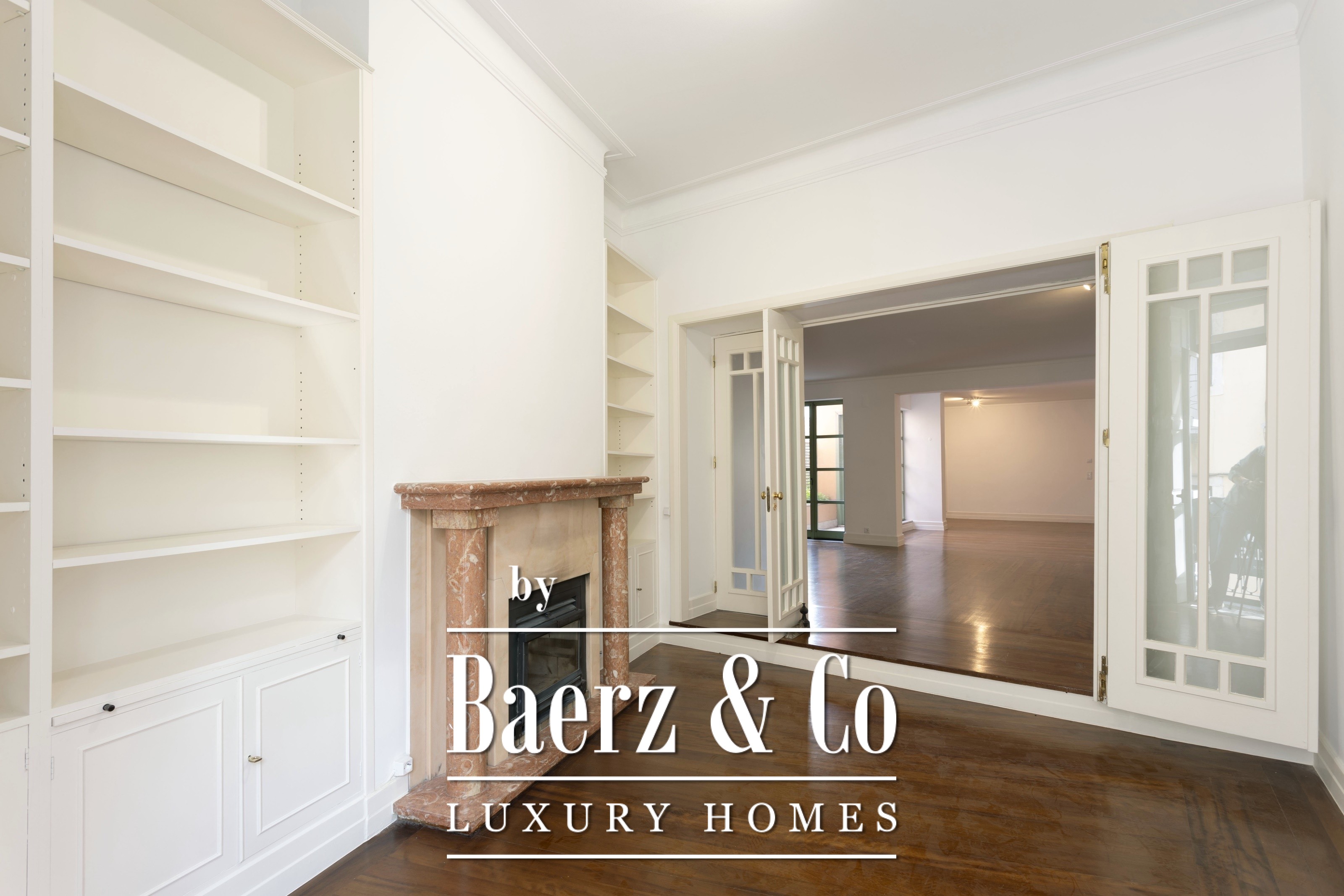 This duplex apartment Príncipe Real Lisbon occupies a tranquil position in one of the city’s most prestigious neighborhoods, where classic charm meets modern function. The 200 m² residence spans two levels, offering three bedrooms and a flexible layout that balances generous living spaces with private outdoor terraces. The main living and dining area features abundant natural light and direct access to a secluded patio, ideal for quiet mornings or intimate gatherings. A second room, adaptable as an office or lounge, centers around a fireplace and opens to a balcony window. The separate kitchen includes a pantry and dedicated laundry, while the master suite offers an en-suite bathroom and its own balcony window.