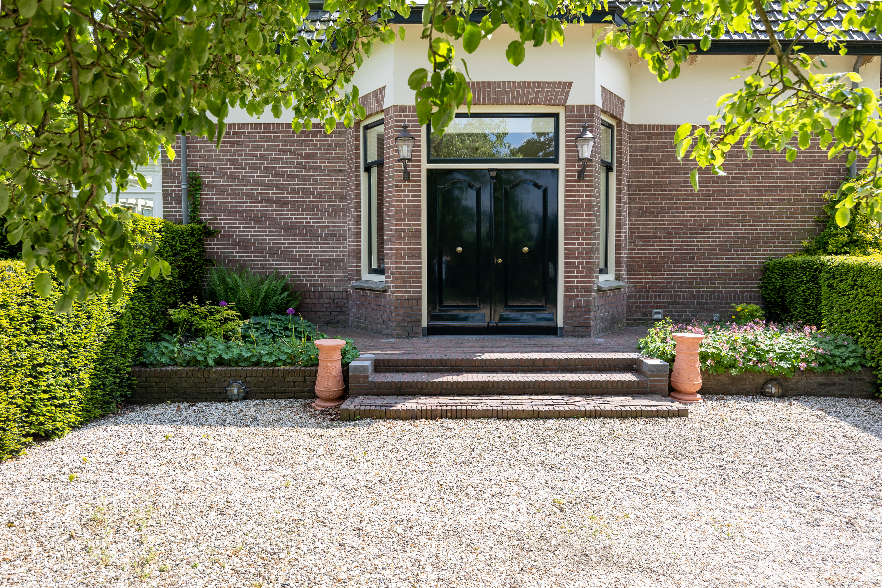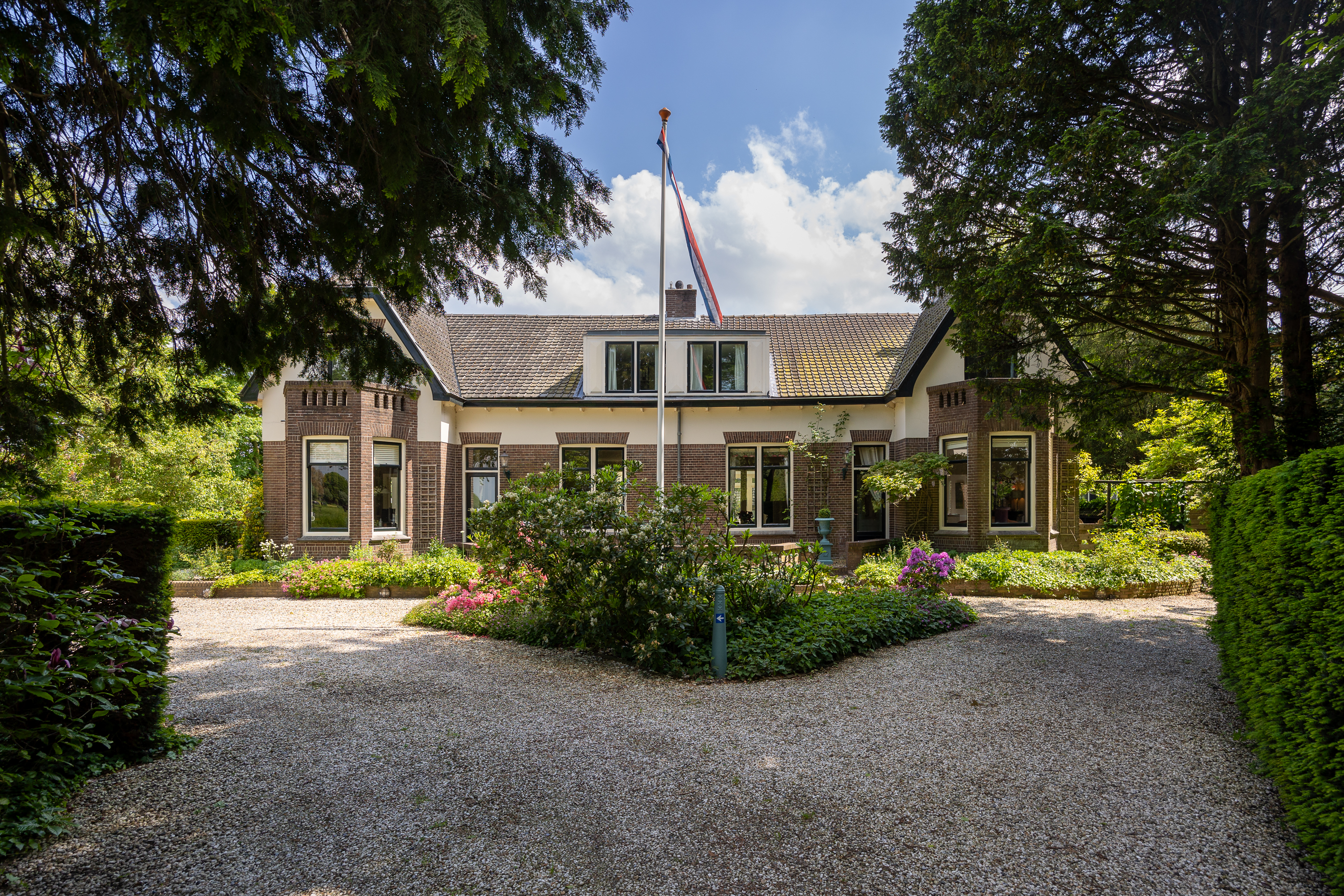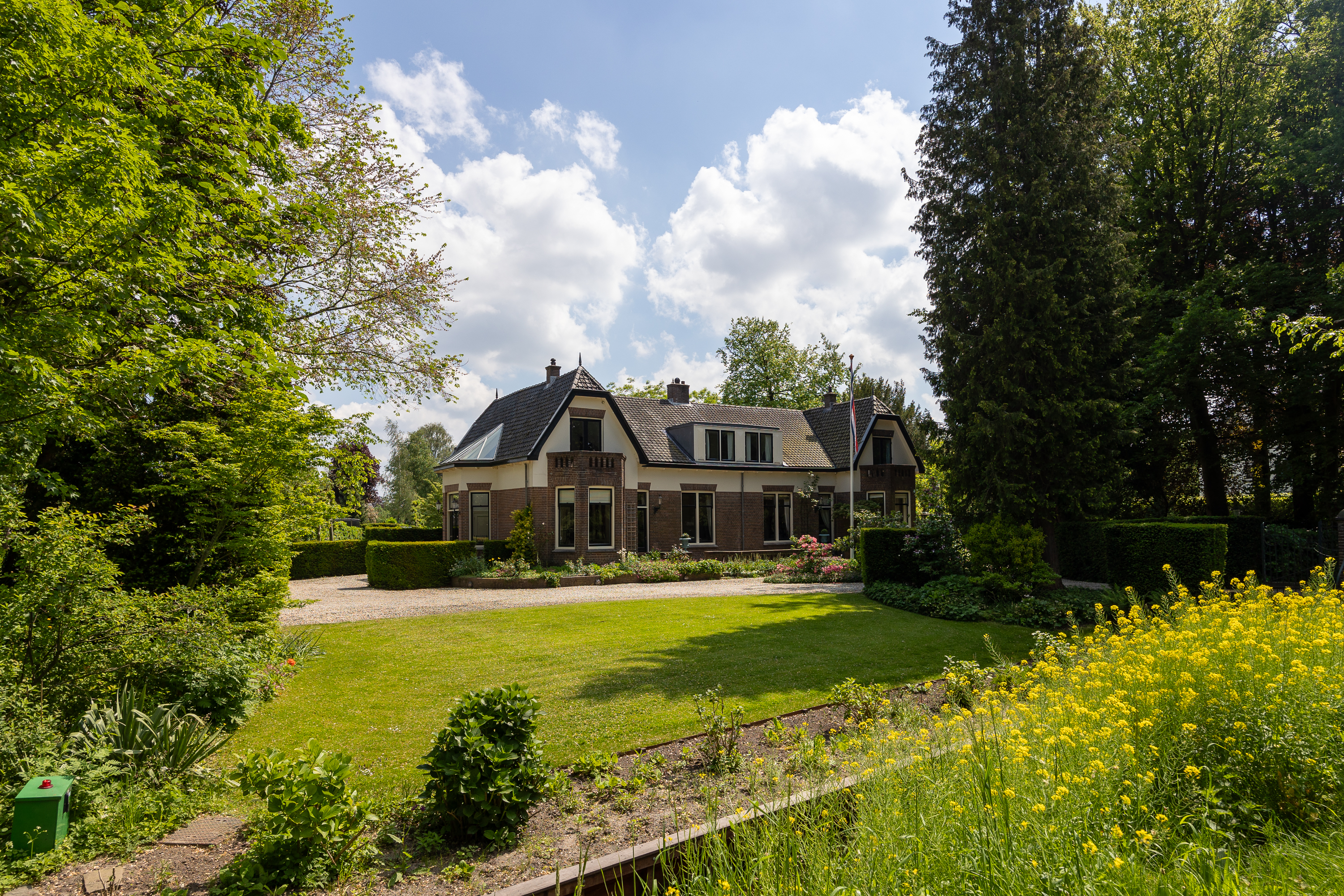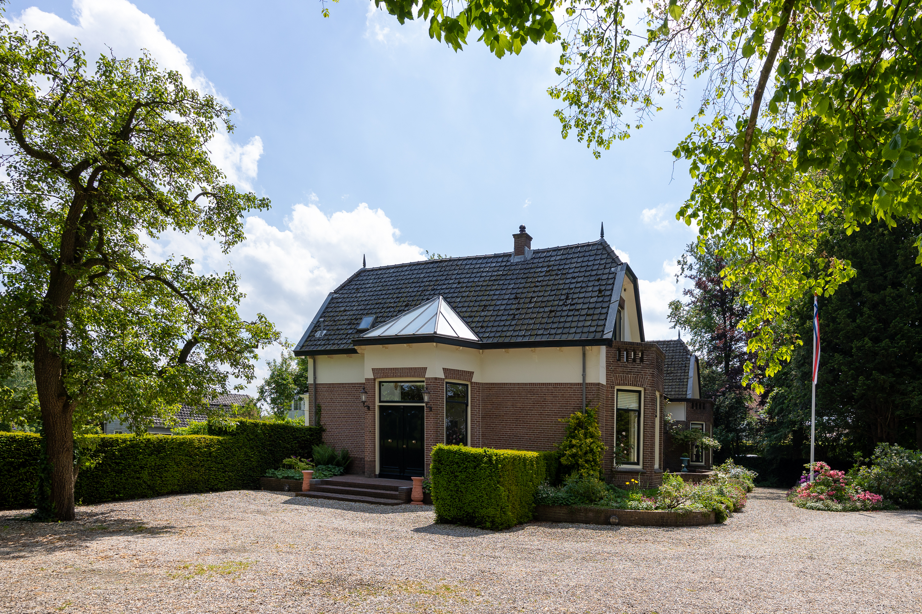 Main house: From the Straatweg in this rural area, you can see the main house between the trees. You reach the plot through a private dam with beautiful wrought iron fencing. The front garden is landscaped with bushes and parking space for cars on the right, also on the right rear is the outbuilding, in the style of the main house, which now serves as a guest house.