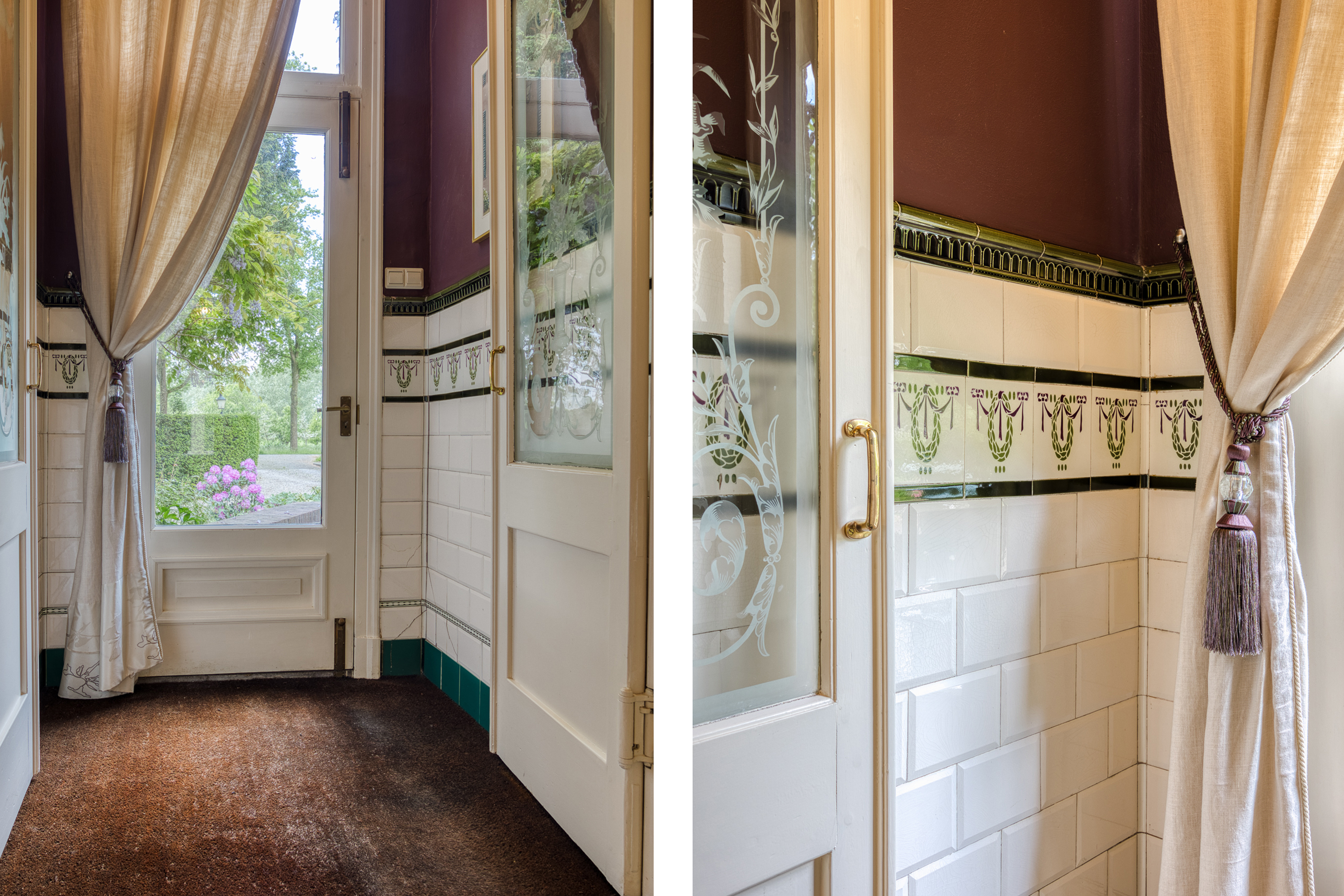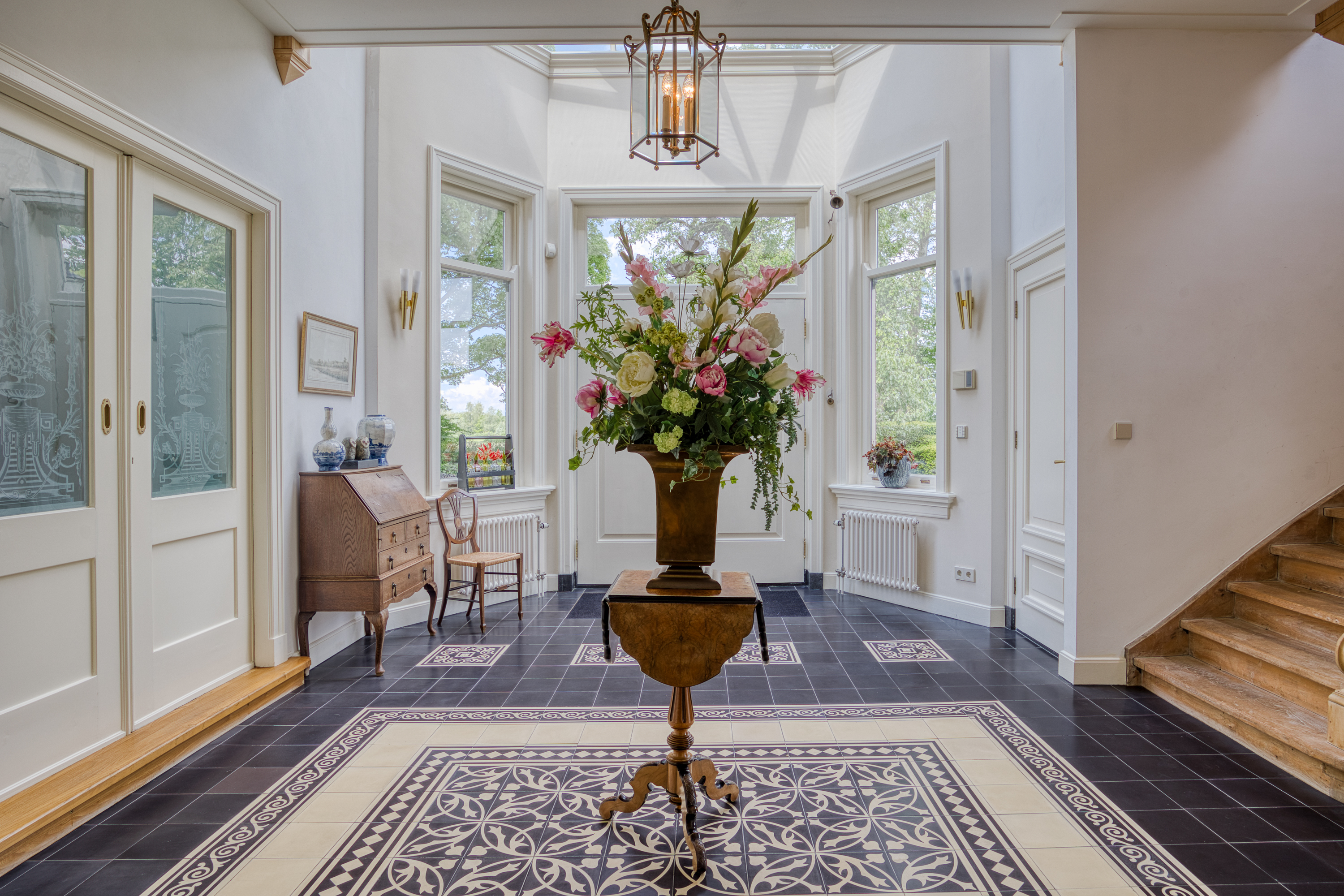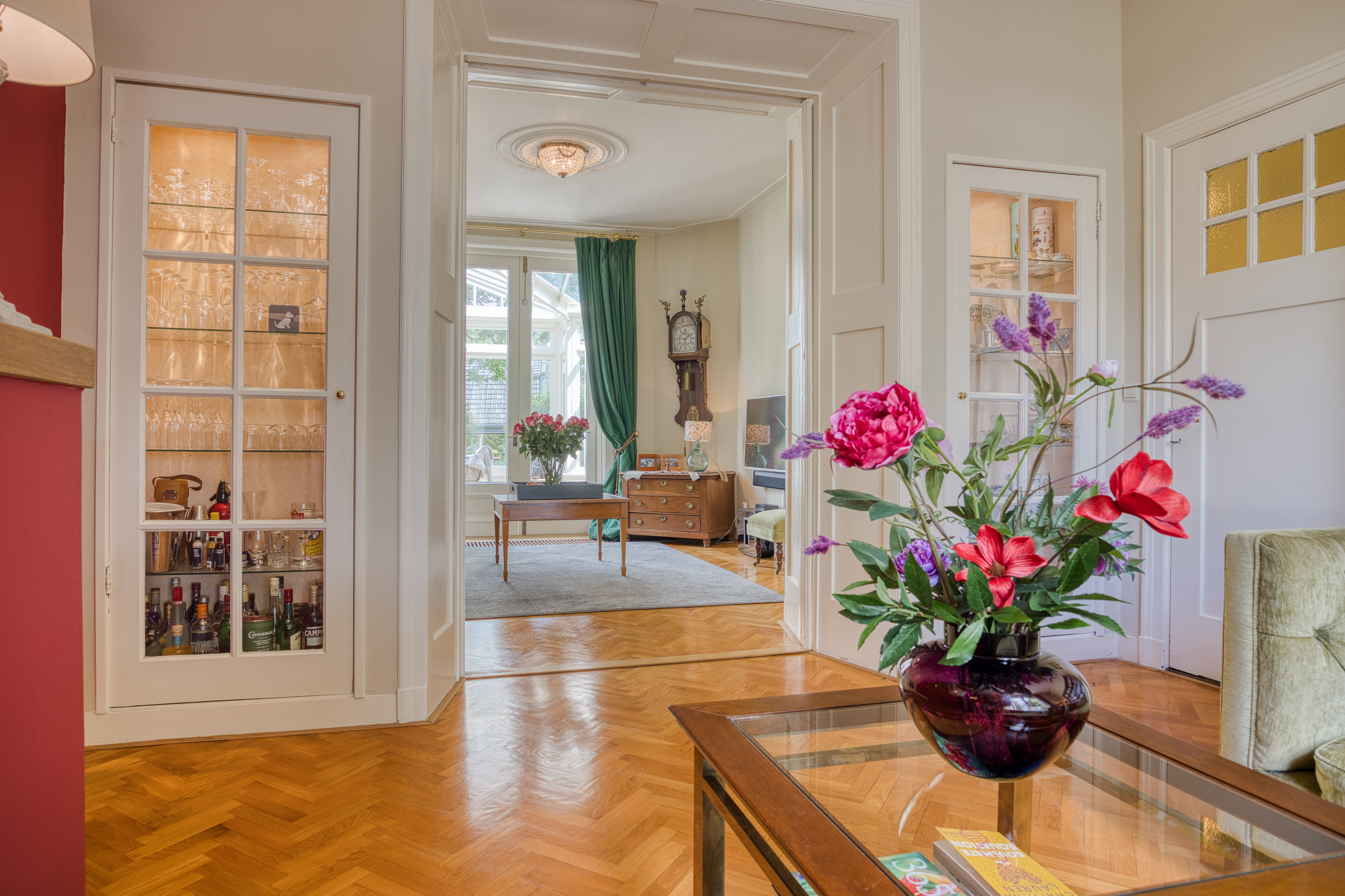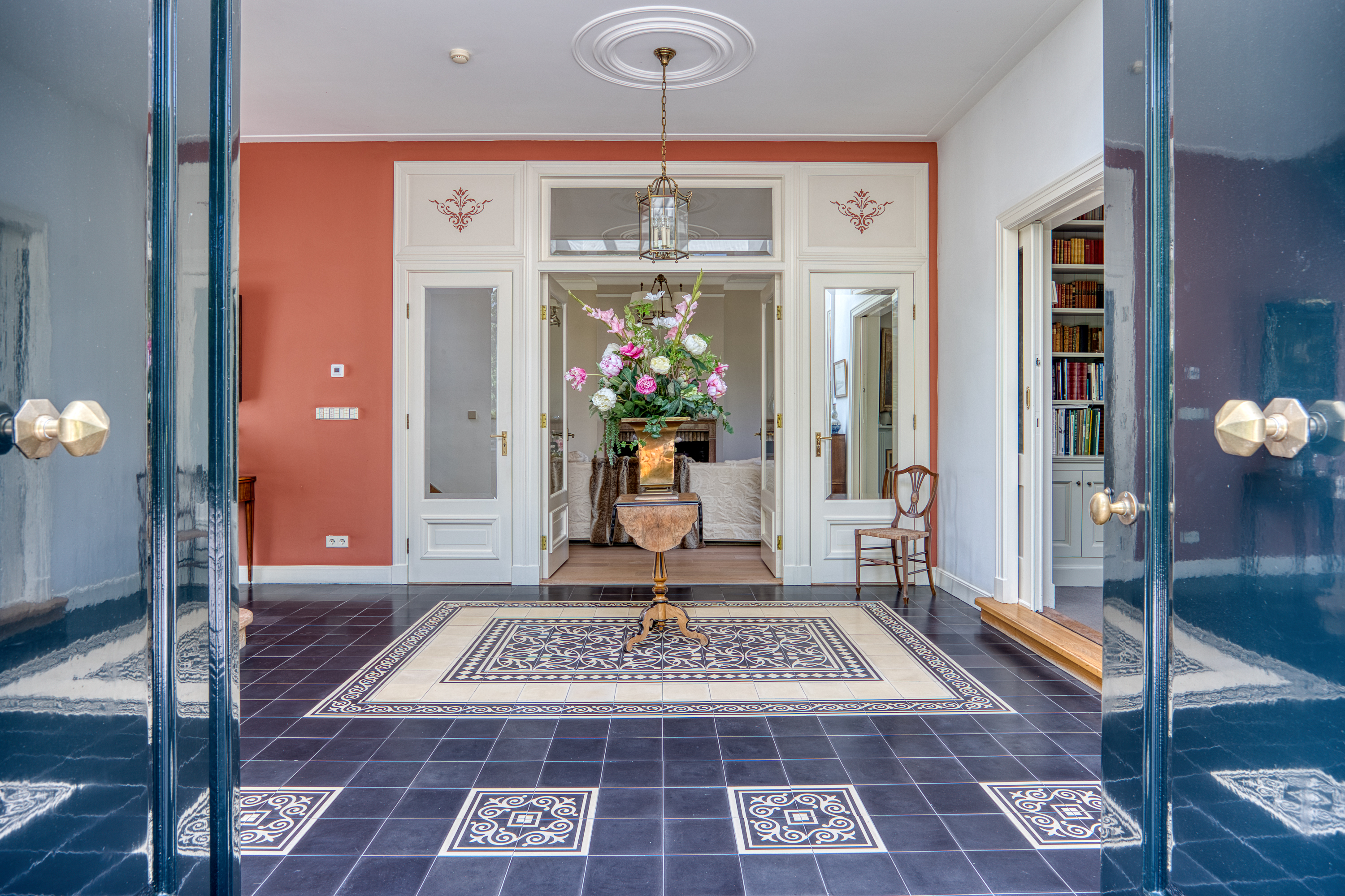 The main entrance of the house was moved to the left during the merger of the two houses. A stately and imposing entrance through two wide doors gives you a warm welcome in this villa. A monumental reception hall with loft immediately indicates the atmosphere of this lovely family home. Lots of light, beautiful materials and beautiful views predominate here. The spacious reception hall gives access to the office at the front.