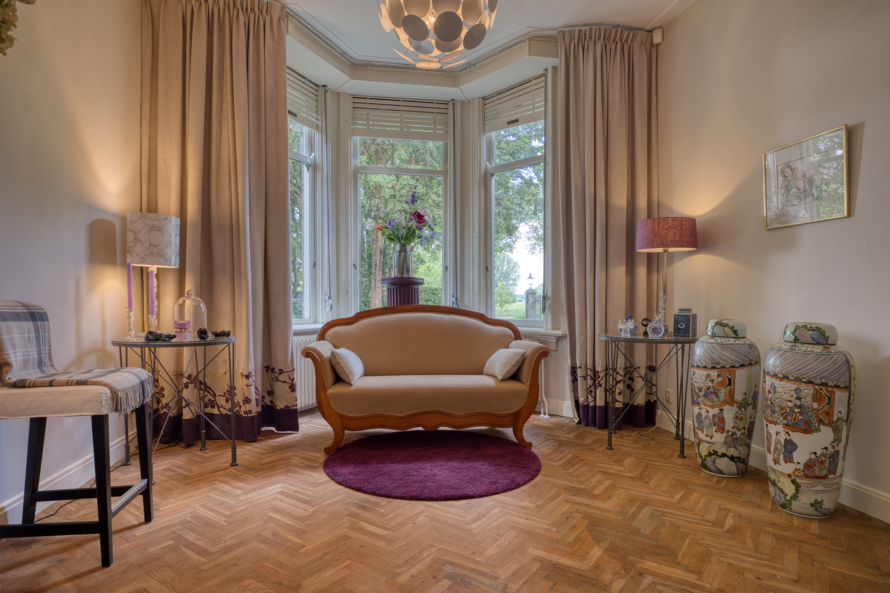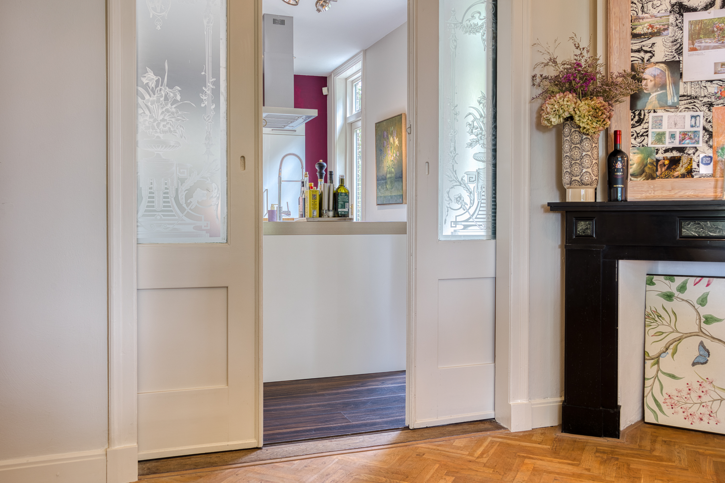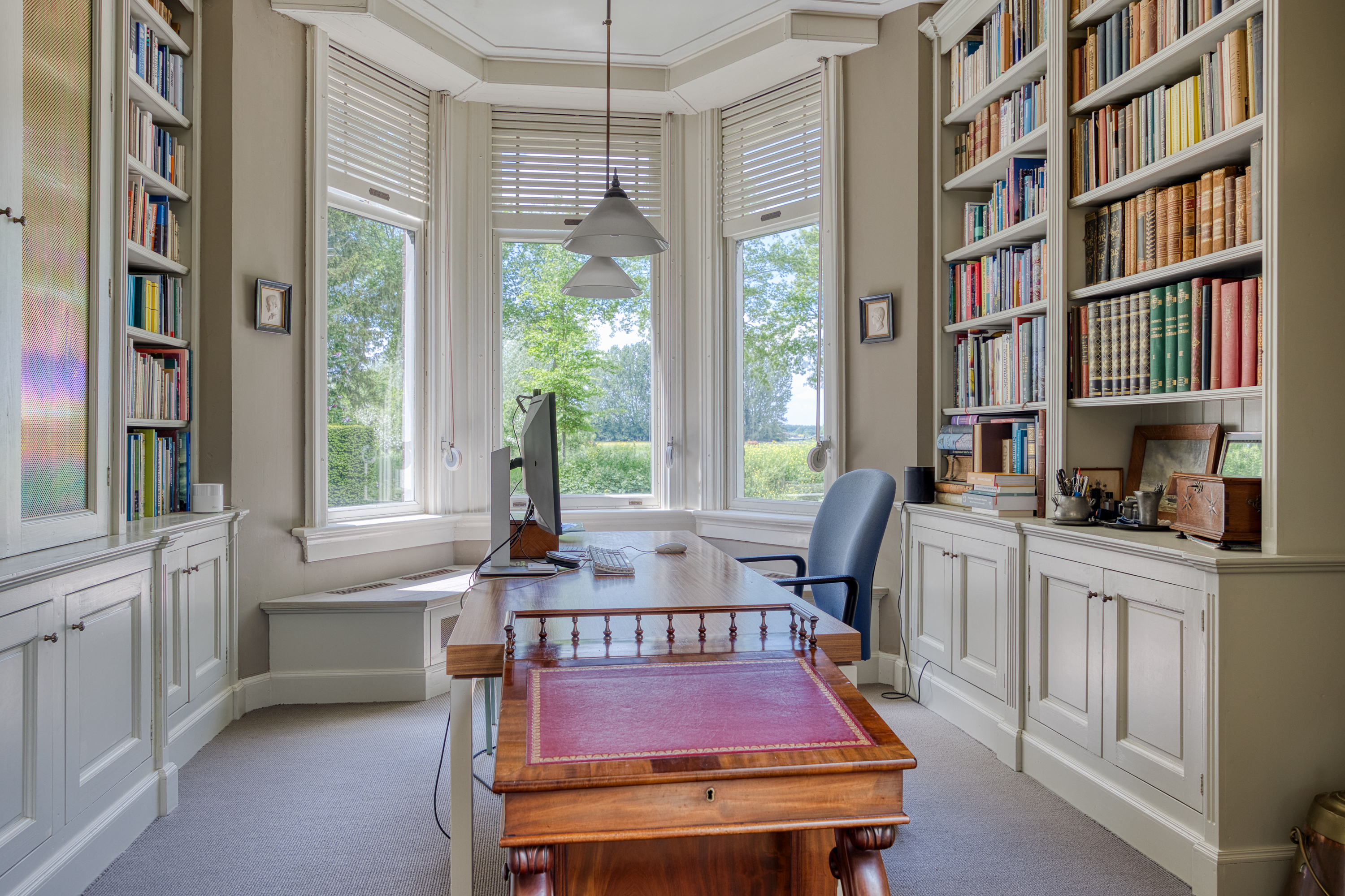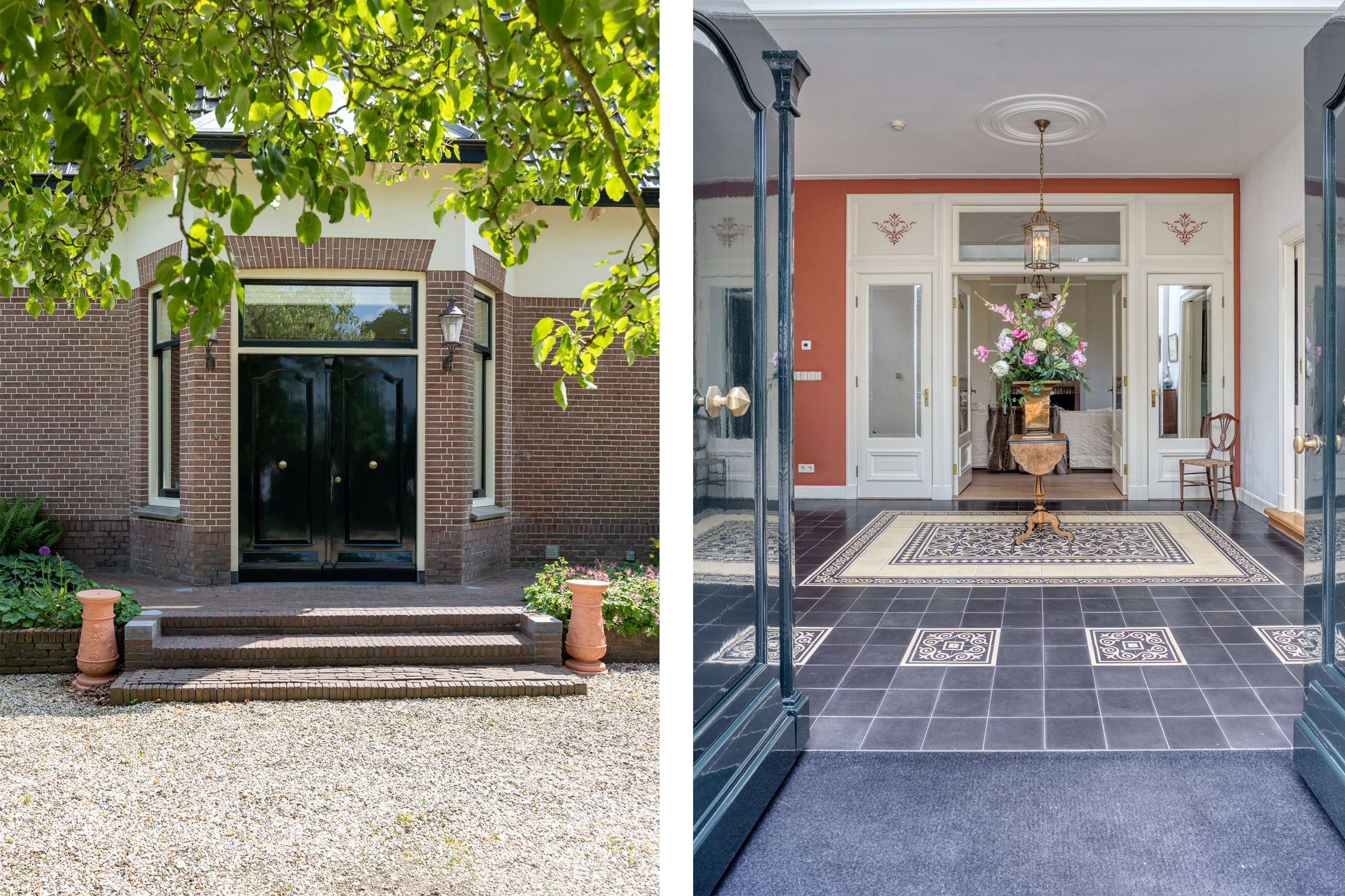 The main entrance of the house was moved to the left during the merger of the two houses. A stately and imposing entrance through two wide doors gives you a warm welcome in this villa. A monumental reception hall with loft immediately indicates the atmosphere of this lovely family home. Lots of light, beautiful materials and beautiful views predominate here. The spacious reception hall gives access to the office at the front.