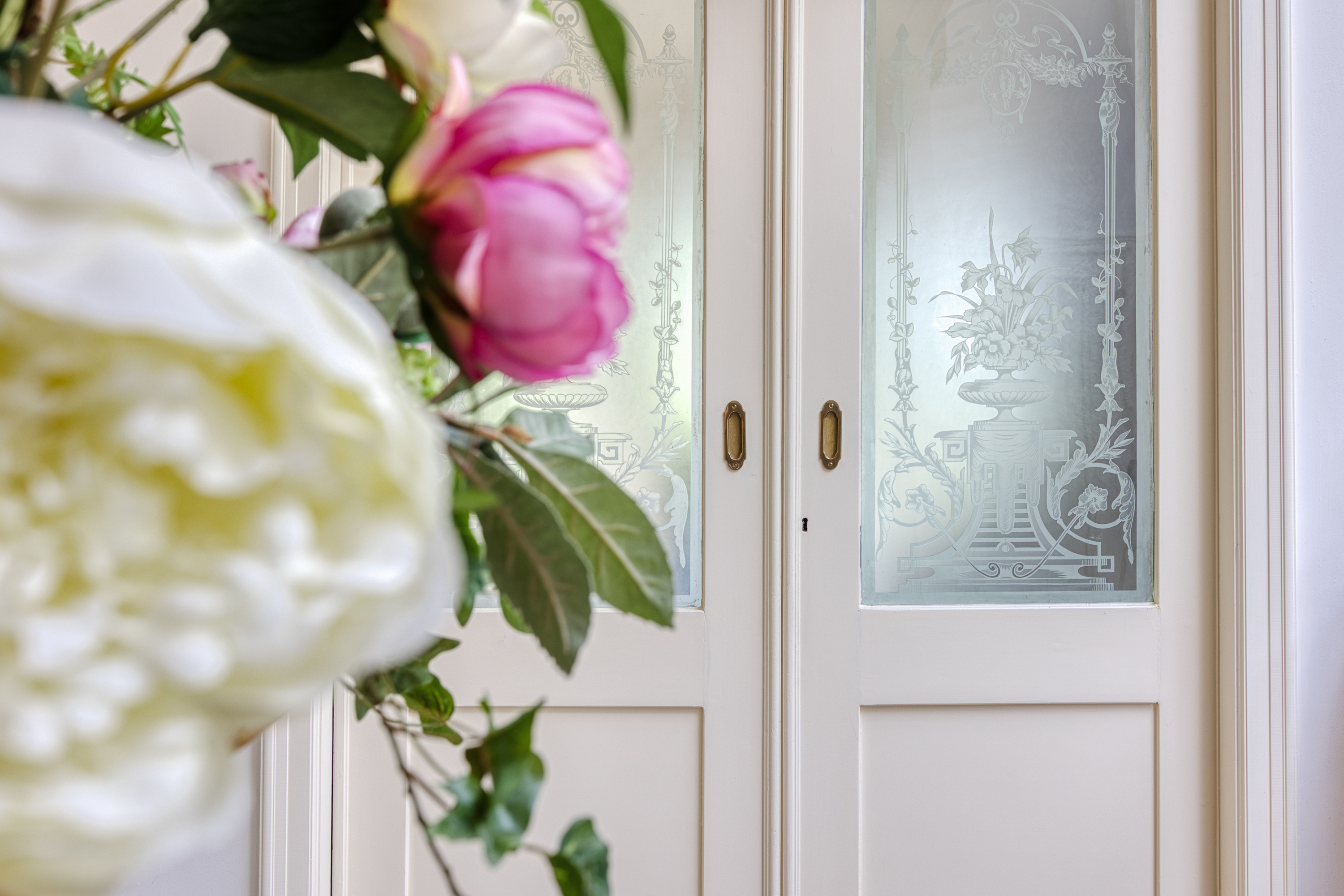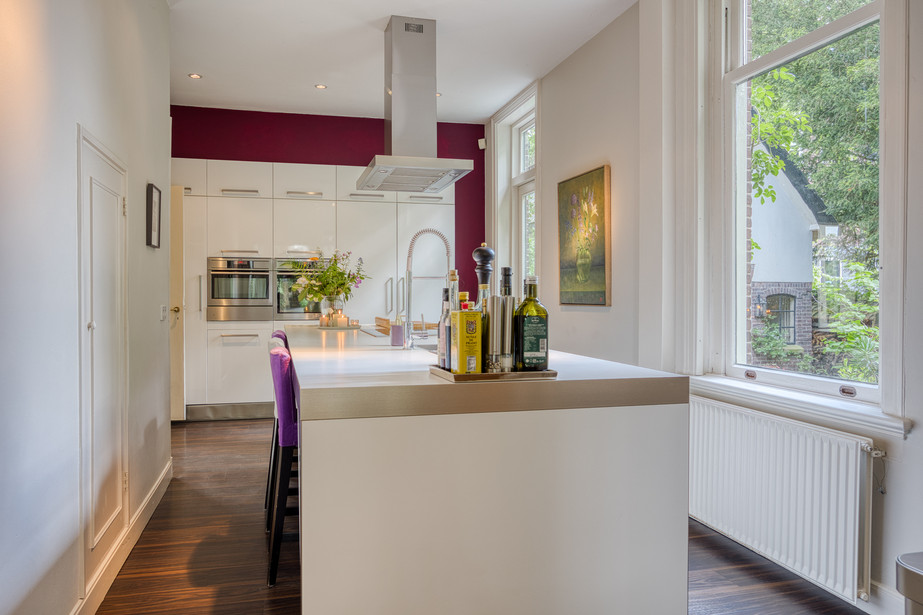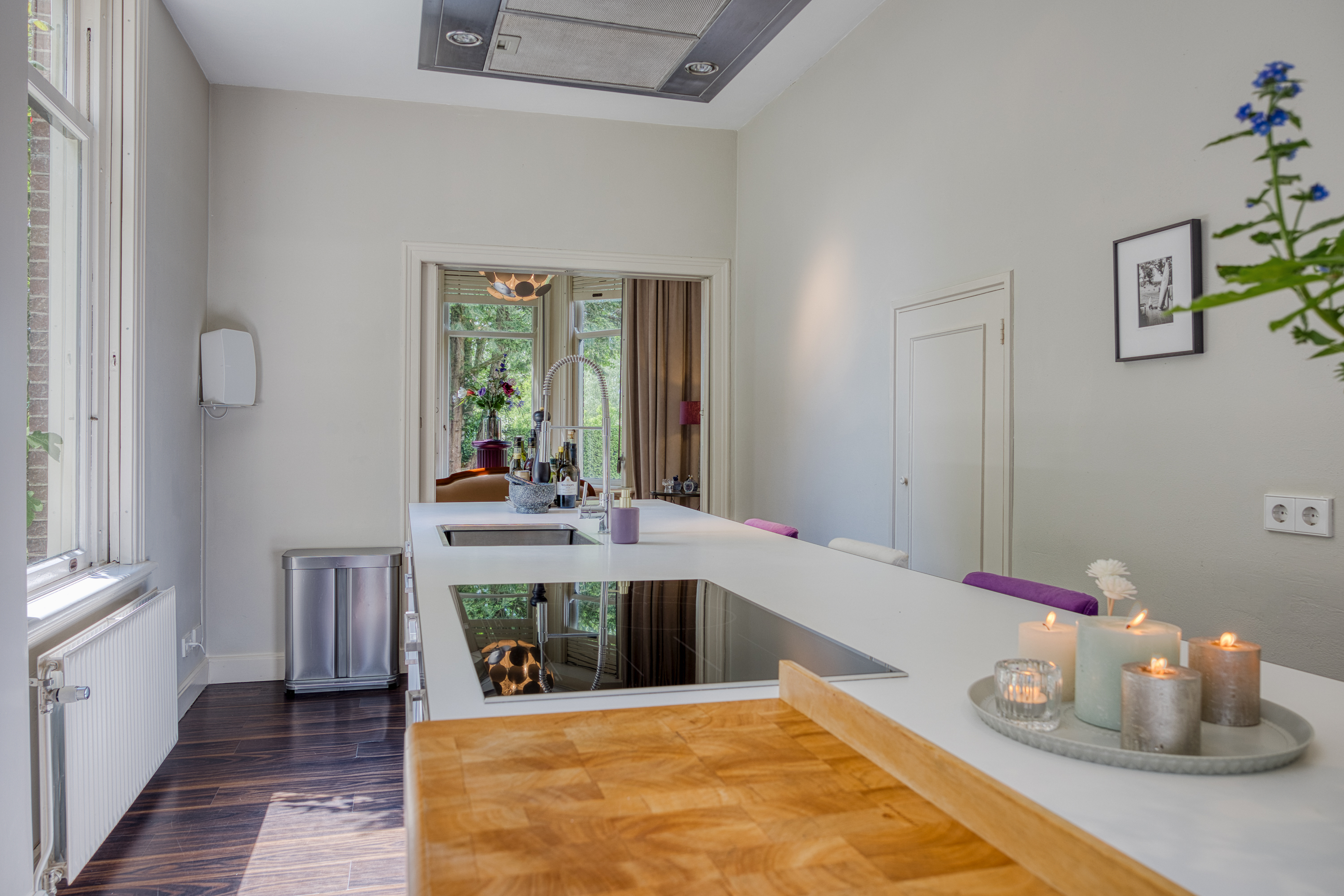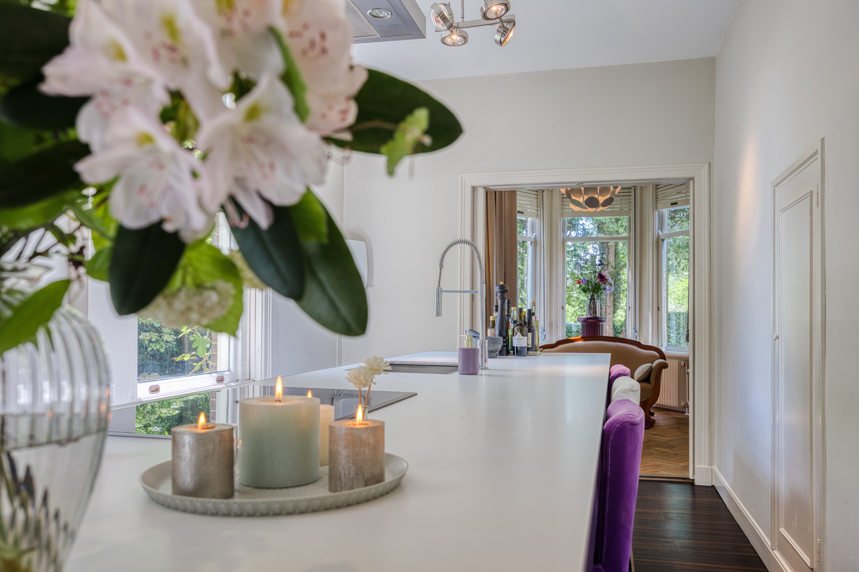 The main entrance of the house was moved to the left during the merger of the two houses. A stately and imposing entrance through two wide doors gives you a warm welcome in this villa. A monumental reception hall with loft immediately indicates the atmosphere of this lovely family home. Lots of light, beautiful materials and beautiful views predominate here. The spacious reception hall gives access to the office at the front.