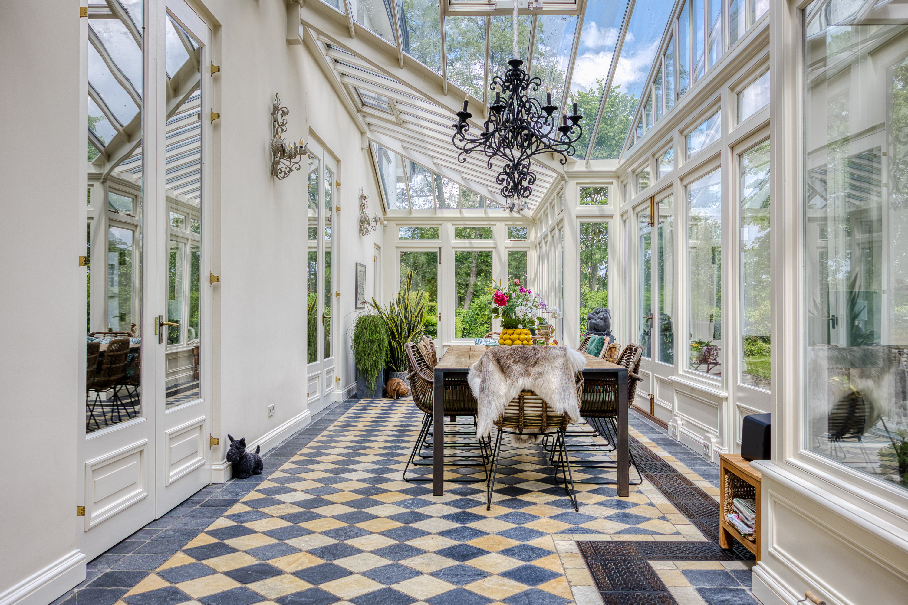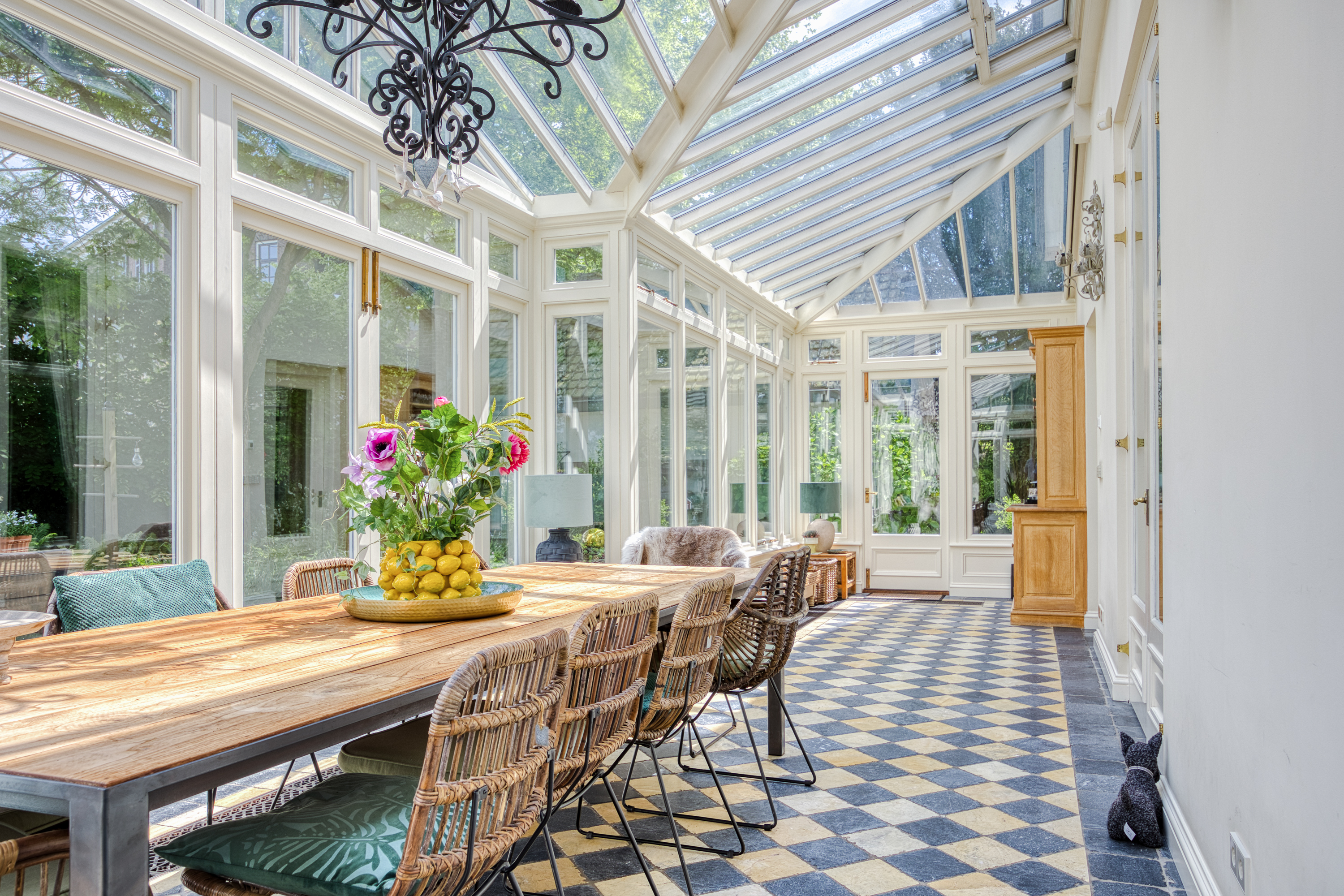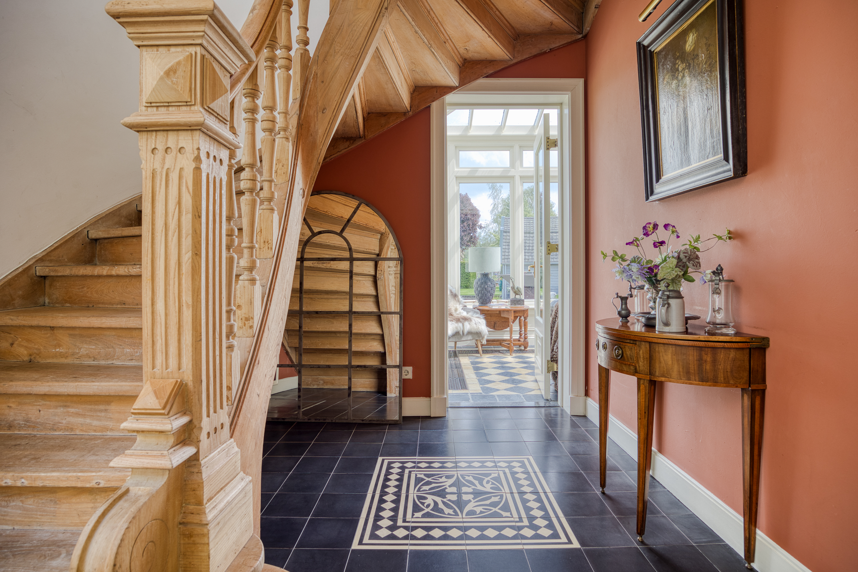 The English conservatory was designed and built by Vale Garden Houses, and is now the beating heart of the house. An incredibly beautiful space where light and view are central. Unobstructed views of the beautiful garden. During each season it is wonderful to stay here. The current owners have a large dining table in this beautiful space. Through the conservatory you reach the right part of the house. The right side of the house still has the original hall of the house from before the merger. The hall gives access to the front room with a bay window and the classic room en-suite doors to the back room. These rooms are now used as an evening/TV room. Through the hallway you reach the kitchen which is spacious and modern. Of course equipped with all conveniences and built-in appliances. The hall connects seamlessly to the conservatory which is located over the entire rear. There is also a staircase to the first floor located in the hall.