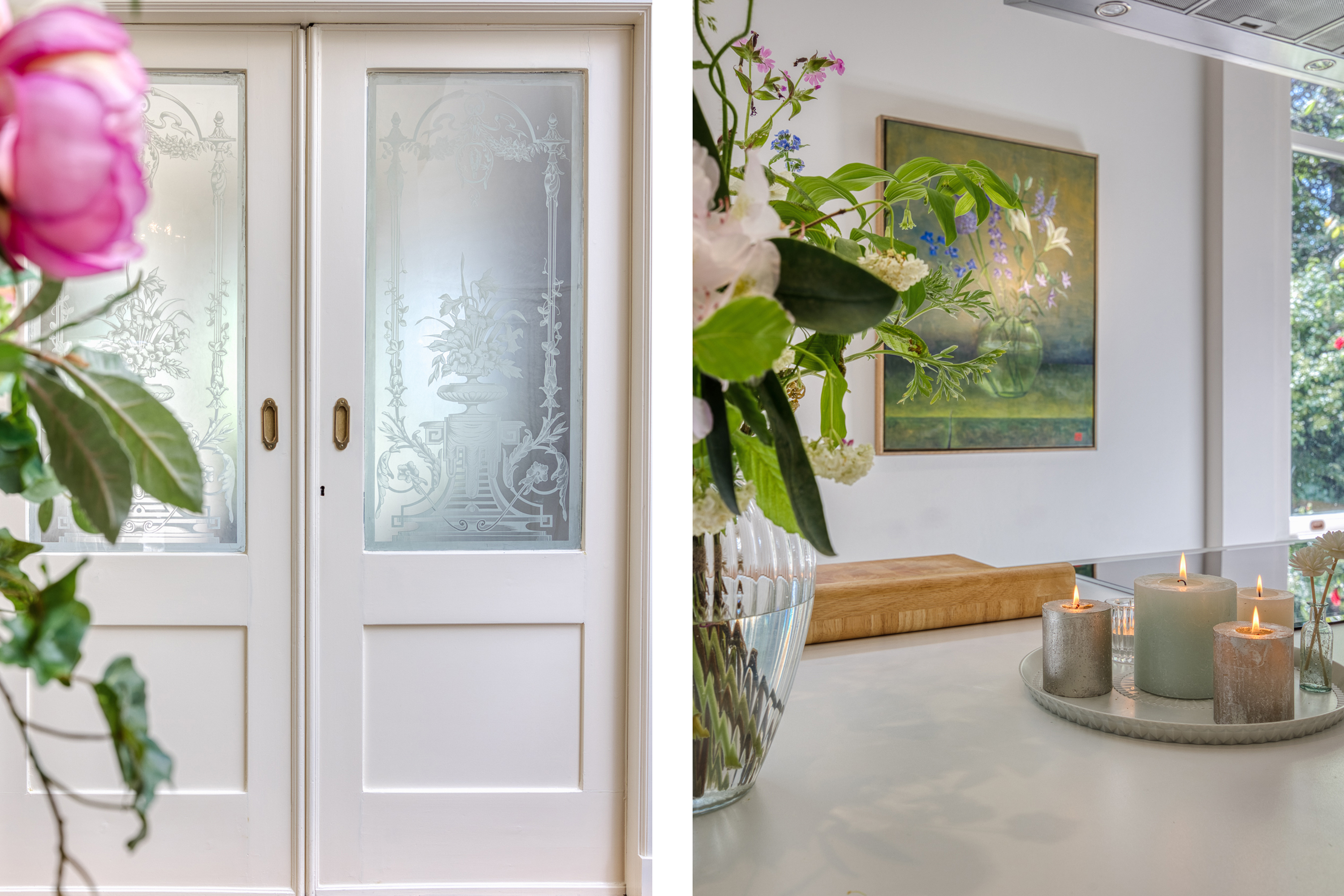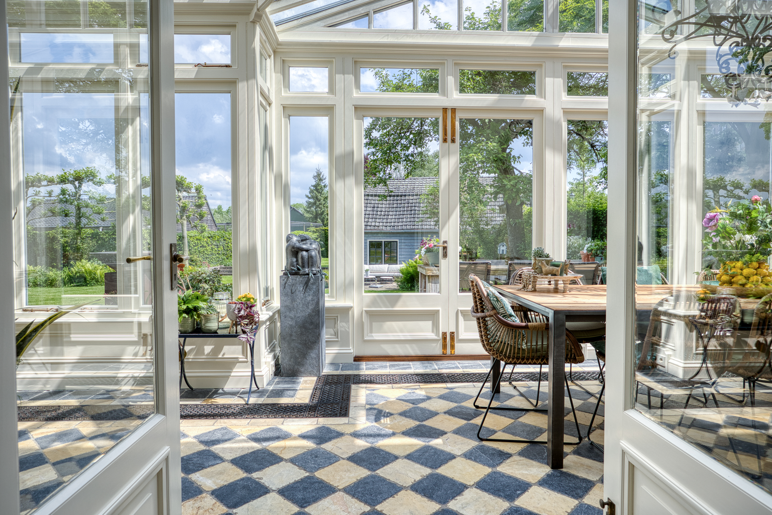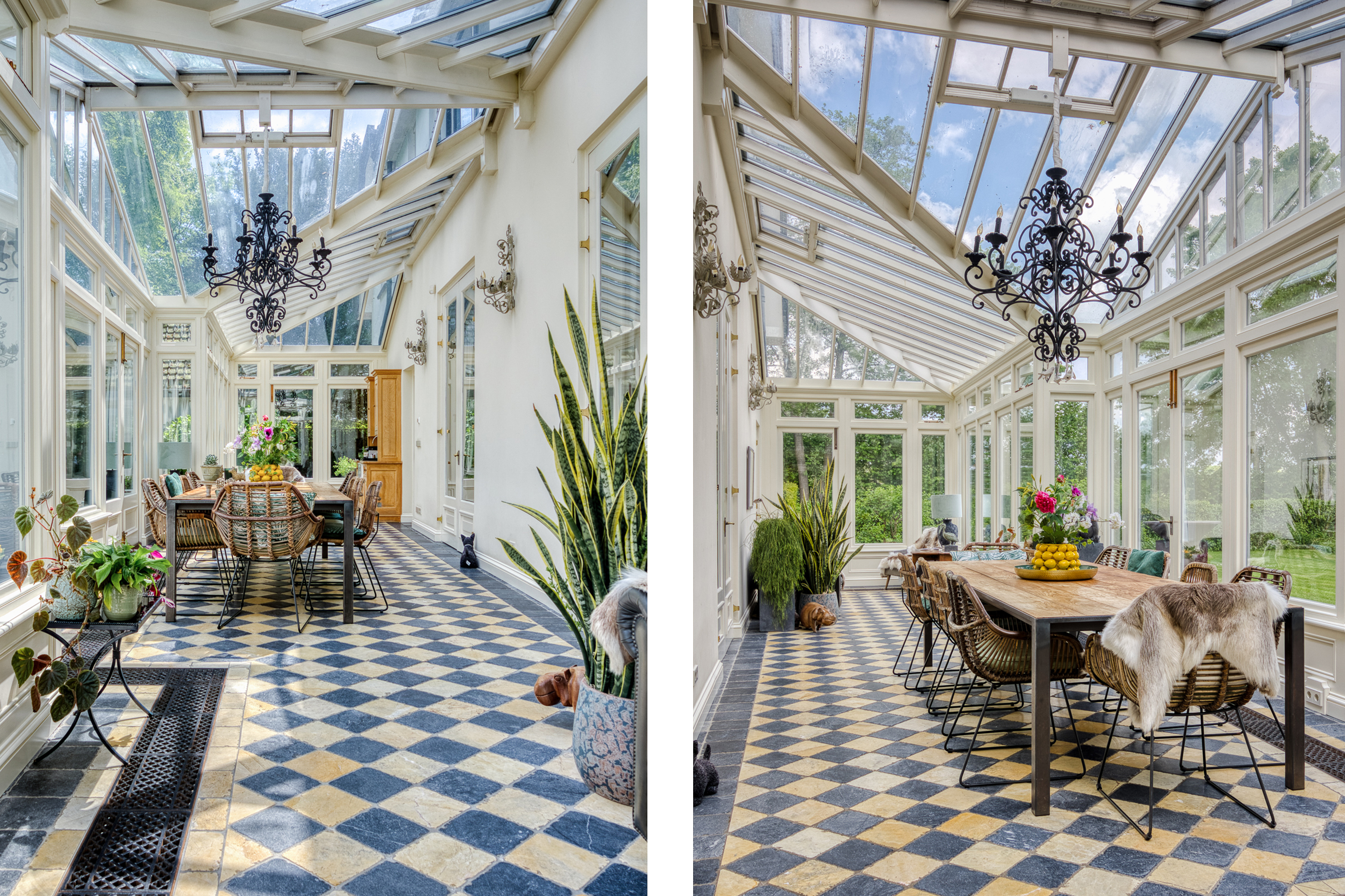The English conservatory was designed and built by Vale Garden Houses, and is now the beating heart of the house. An incredibly beautiful space where light and view are central. Unobstructed views of the beautiful garden. During each season it is wonderful to stay here. The current owners have a large dining table in this beautiful space. Through the conservatory you reach the right part of the house. The right side of the house still has the original hall of the house from before the merger. The hall gives access to the front room with a bay window and the classic room en-suite doors to the back room. These rooms are now used as an evening/TV room. Through the hallway you reach the kitchen which is spacious and modern. Of course equipped with all conveniences and built-in appliances. The hall connects seamlessly to the conservatory which is located over the entire rear. There is also a staircase to the first floor located in the hall.