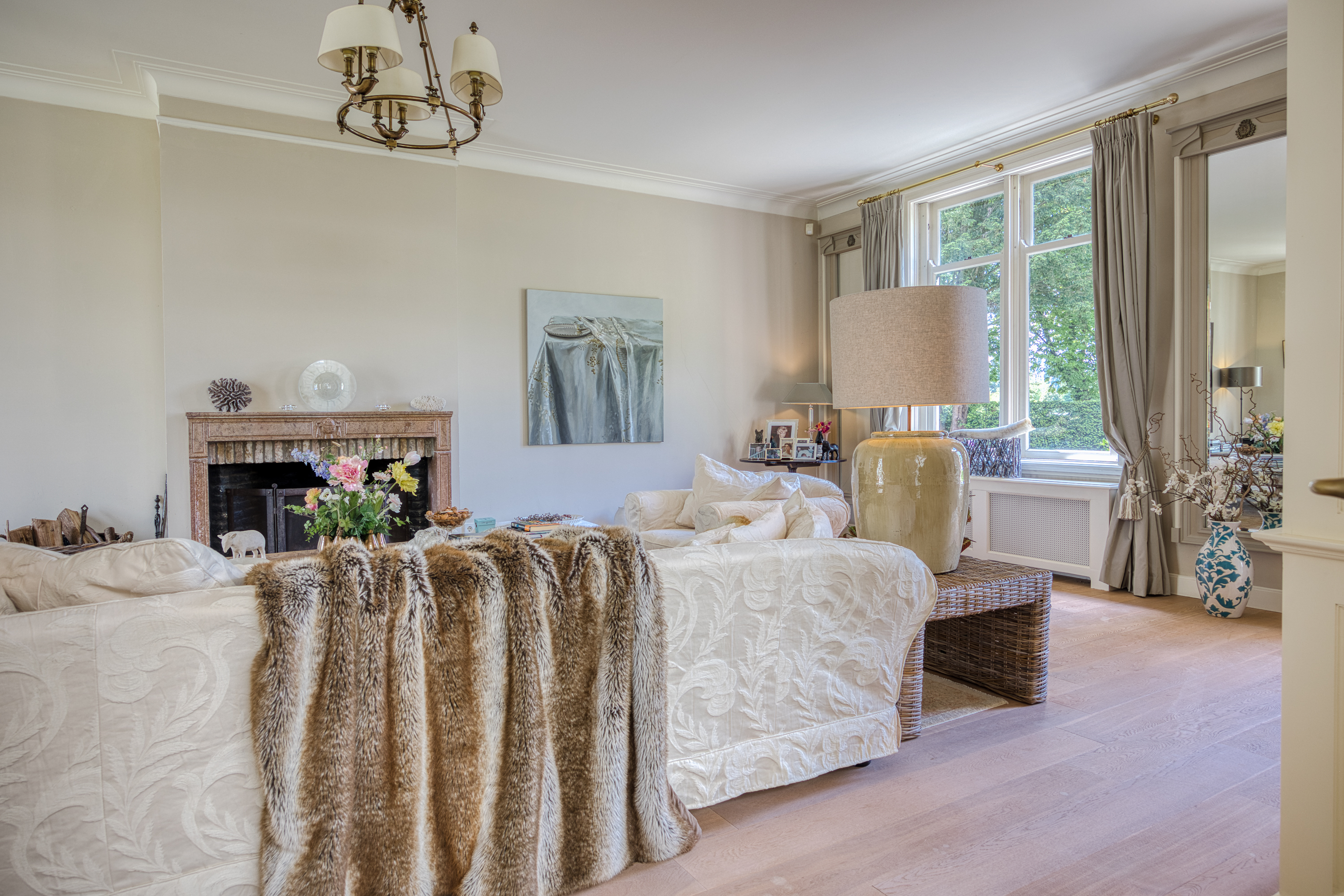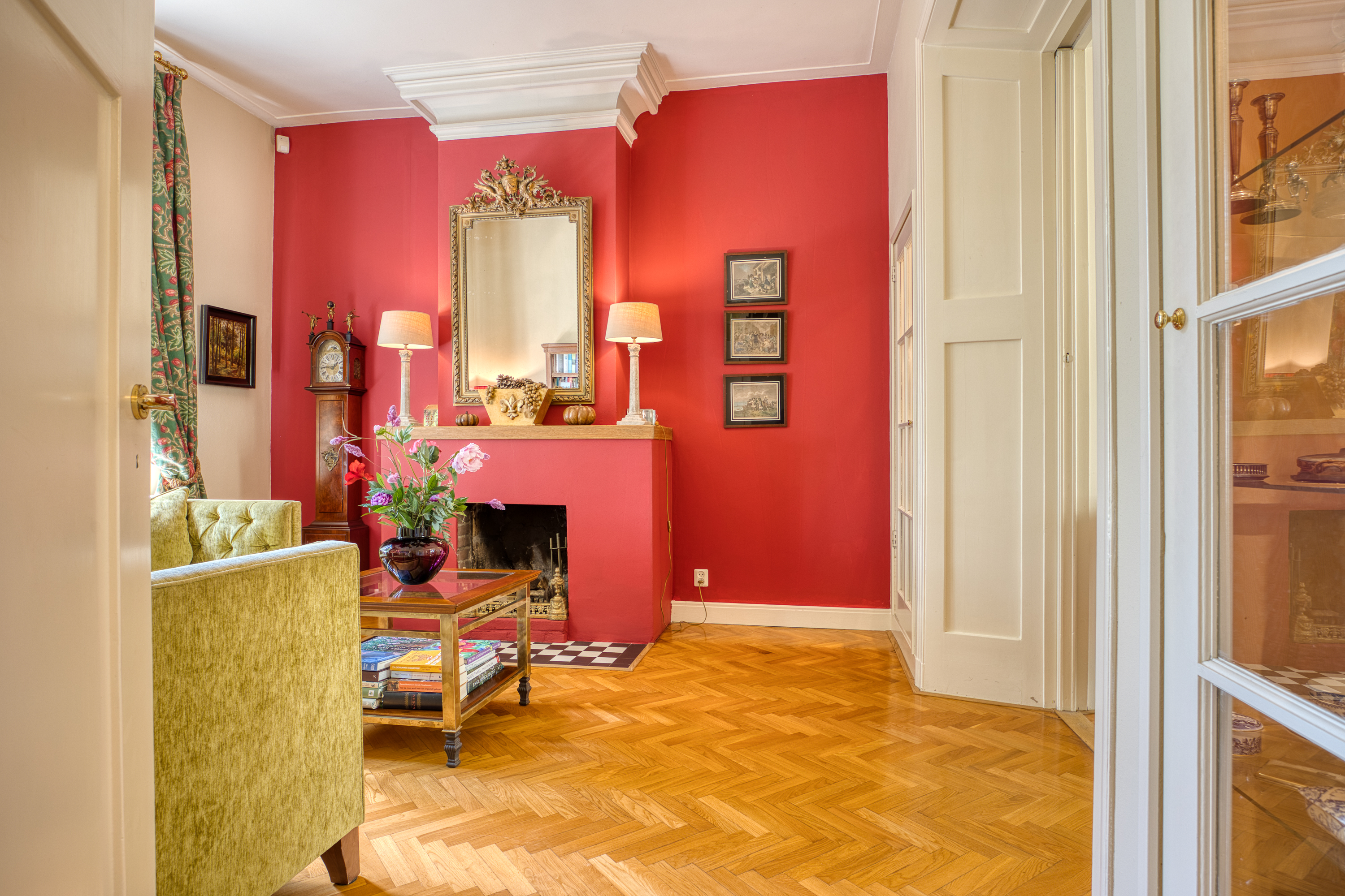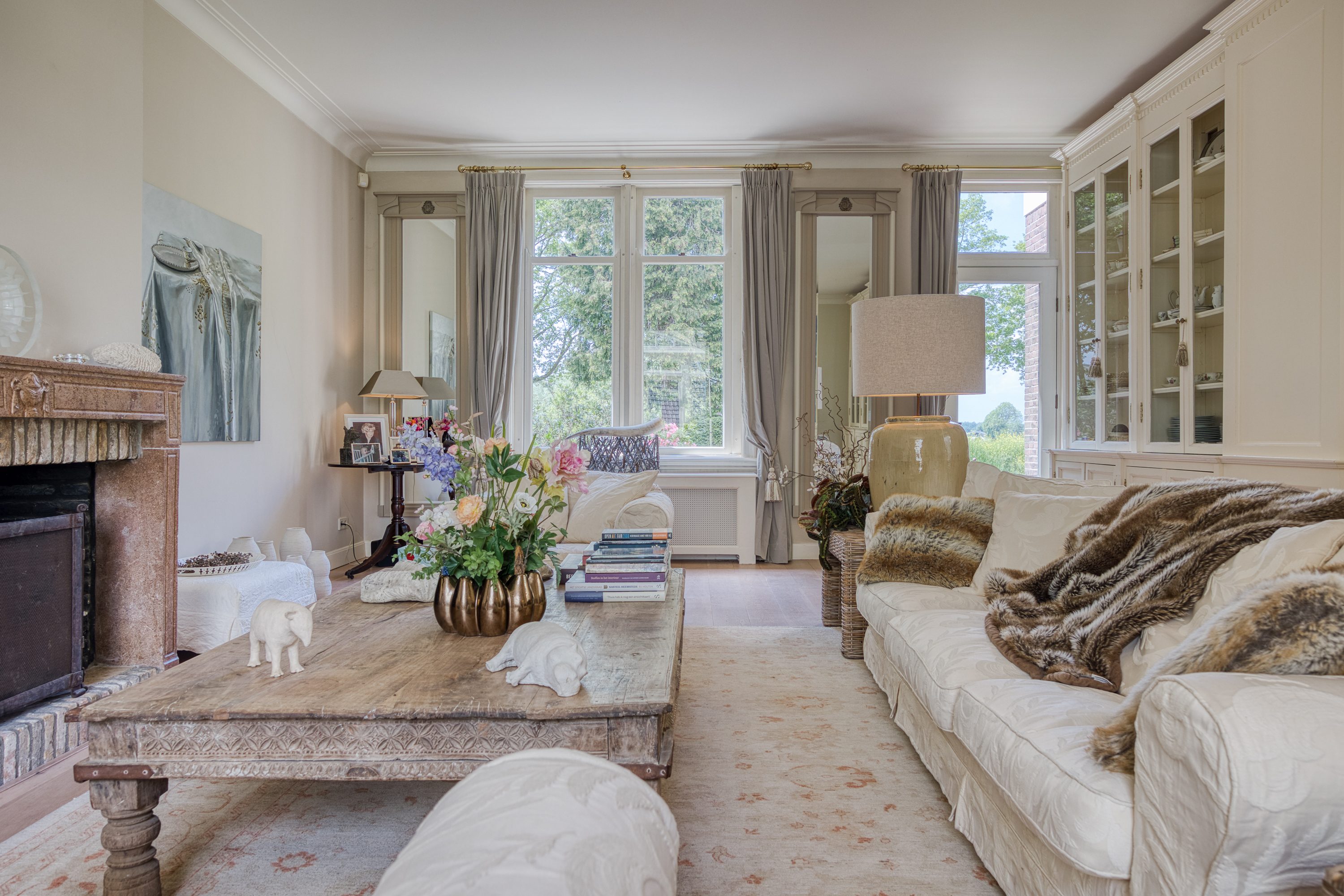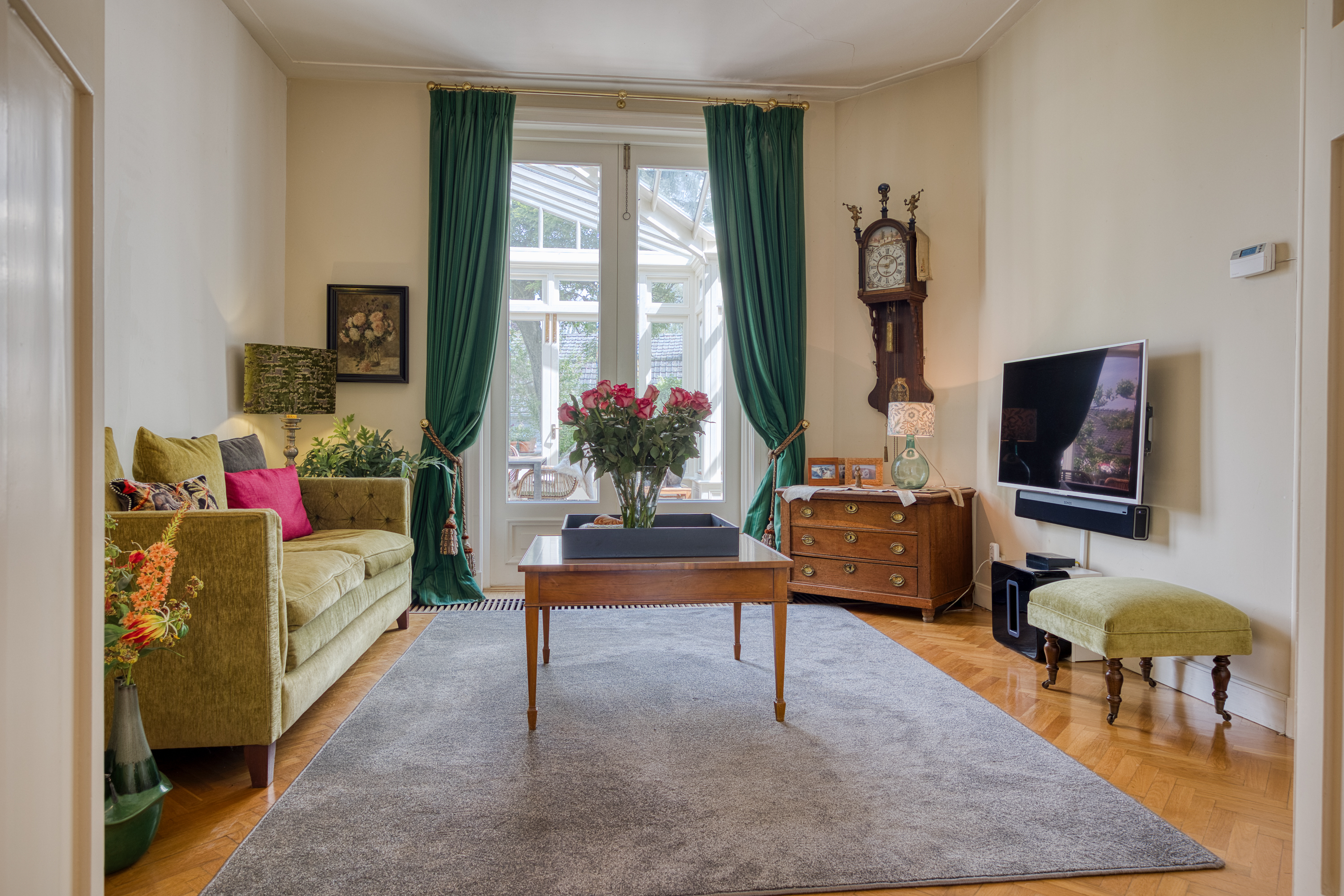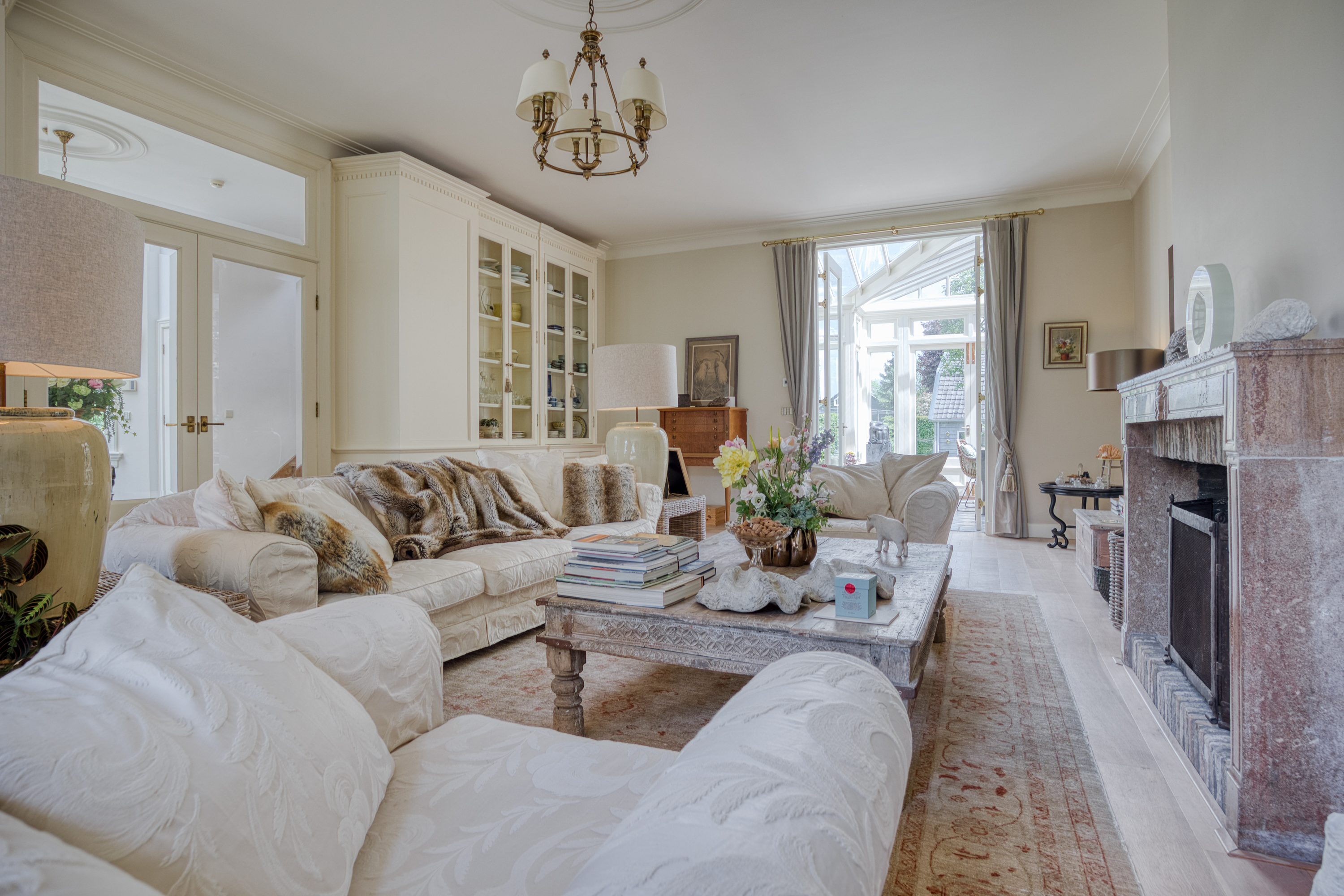 From the hall you can also reach the very spacious living room through two French doors, which is actually centrally located and therefore partly in the middle of the house. A lovely living room with a fireplace, oak floor (wide floorboards) and what immediately stands out: Atmosphere and feeling of space due to the high ceilings, special patio doors, the beautiful authentic details and the beautiful light. Through the hall and the living room you enter the fantastic conservatory.