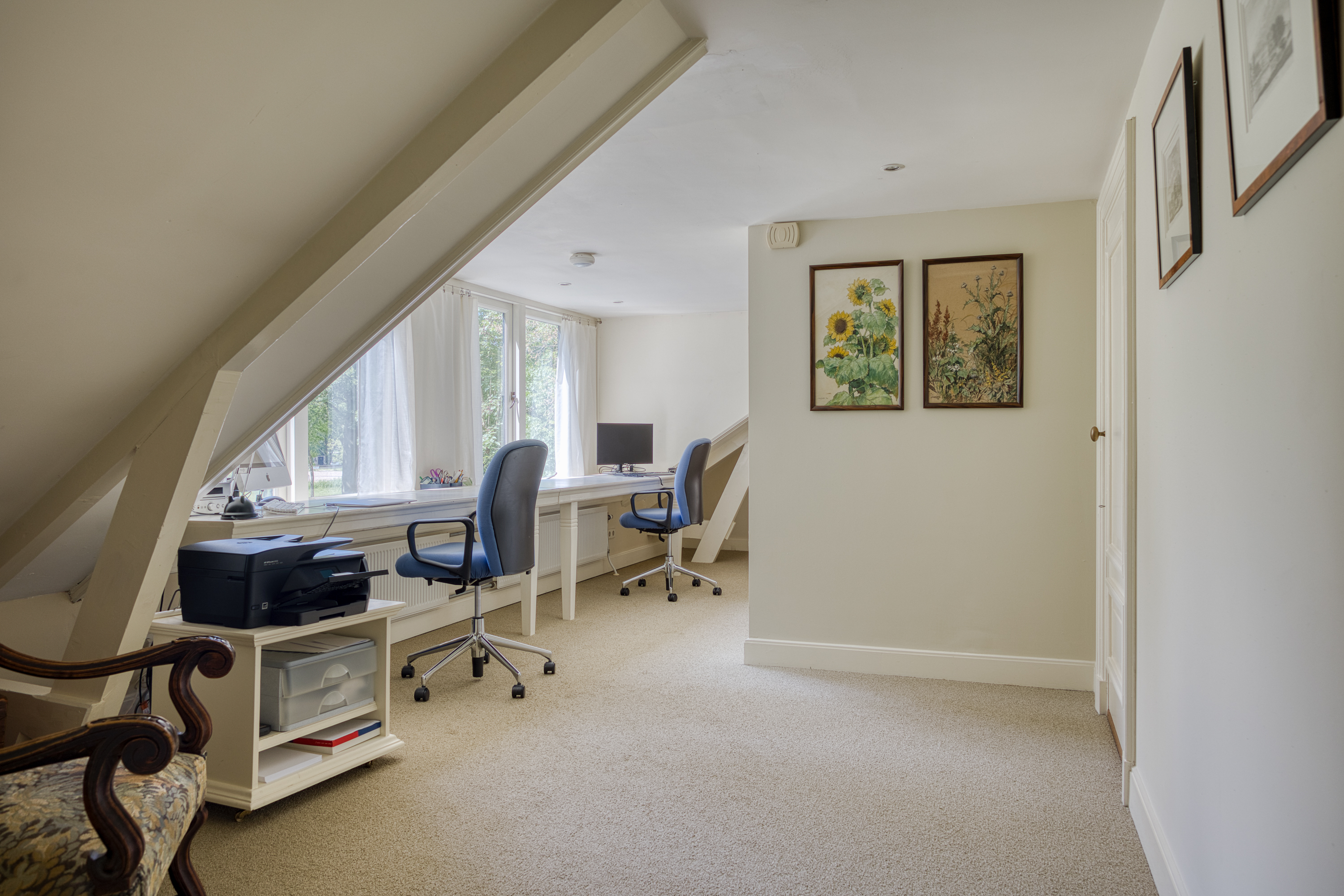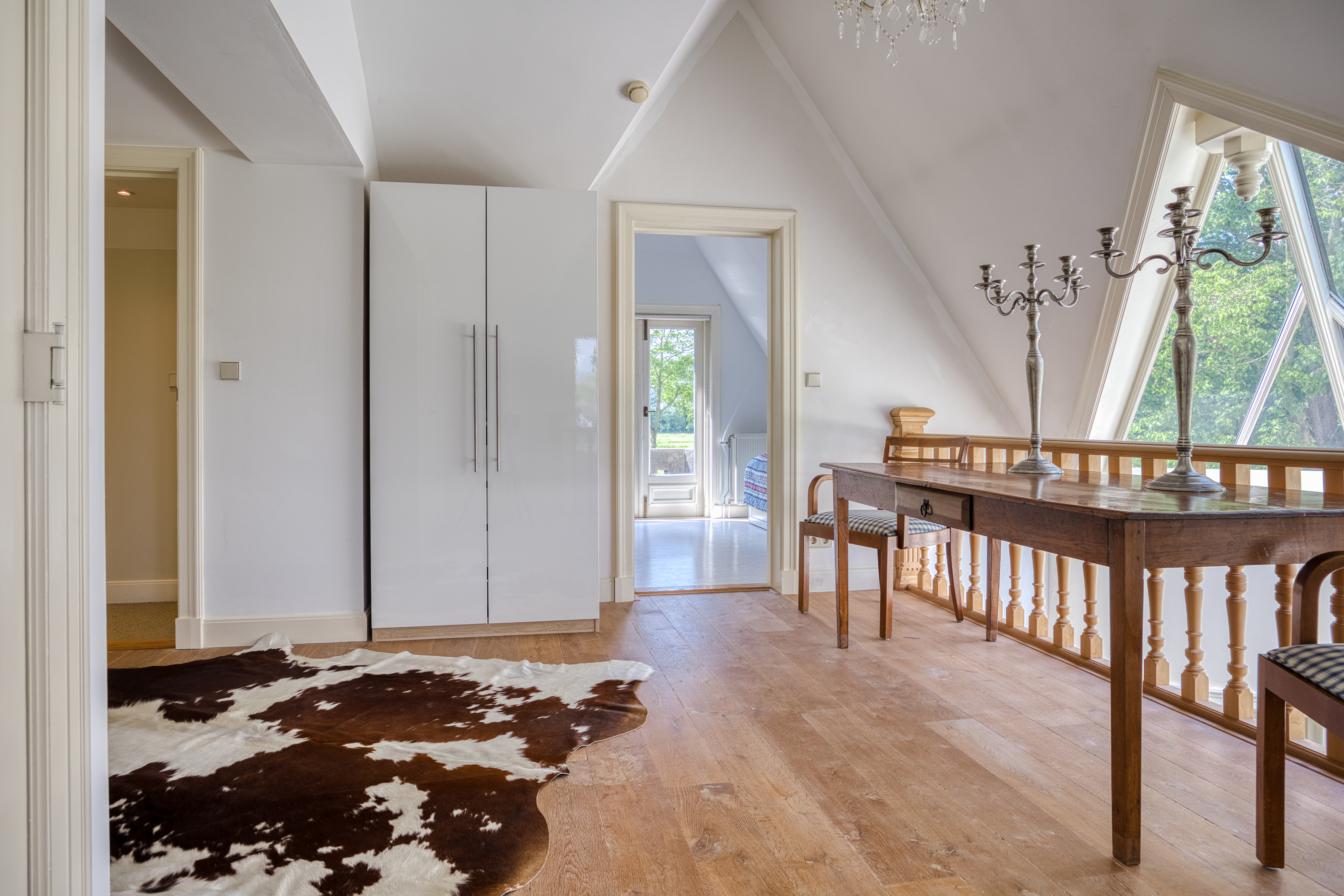 The study has built-in bookcases and a gas fireplace and a nice bay window with a beautiful view over the front garden with a view of the opposite farmlands. There is also a spacious toilet room and a beautiful elm staircase to the upper floor.
