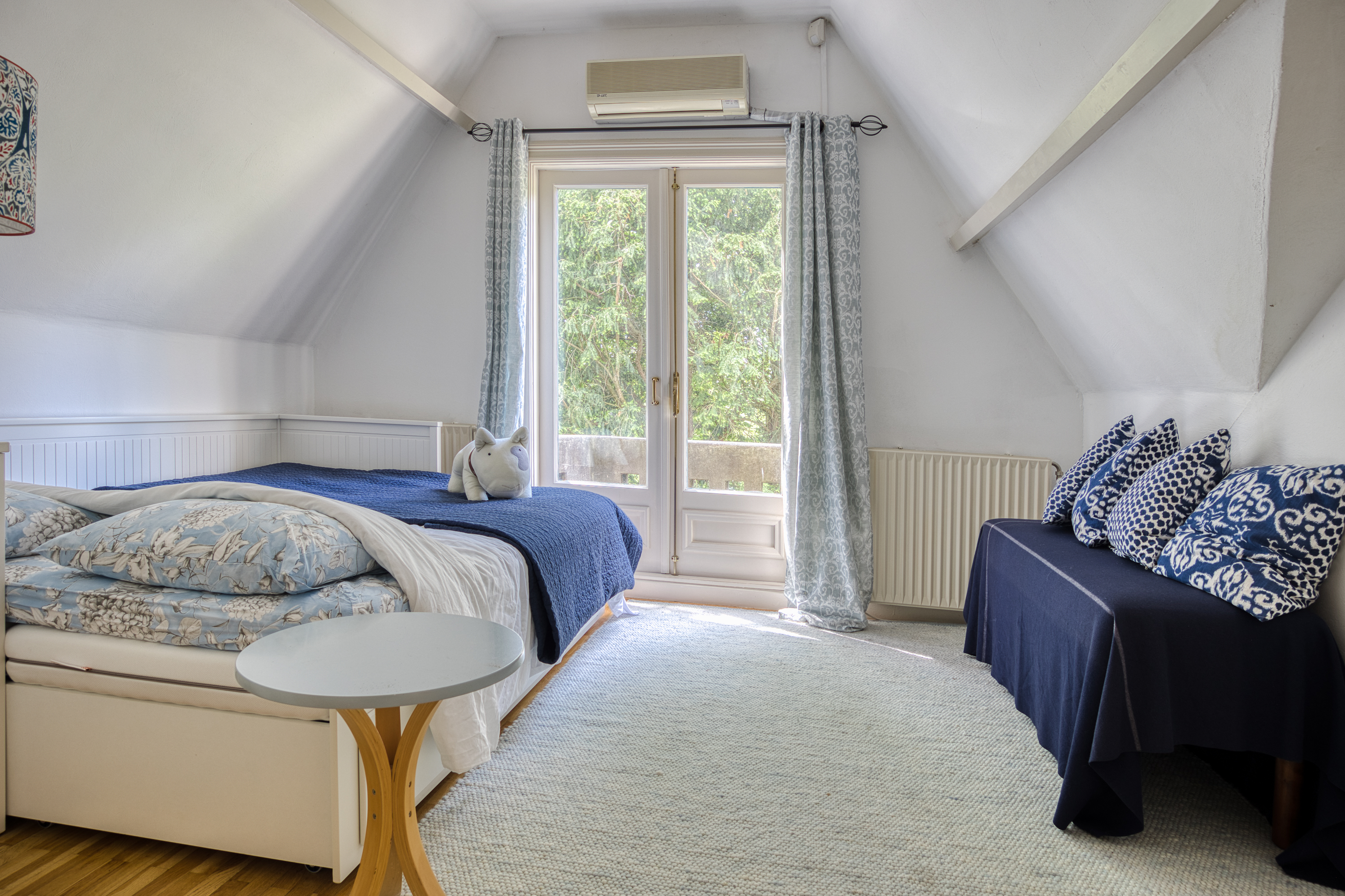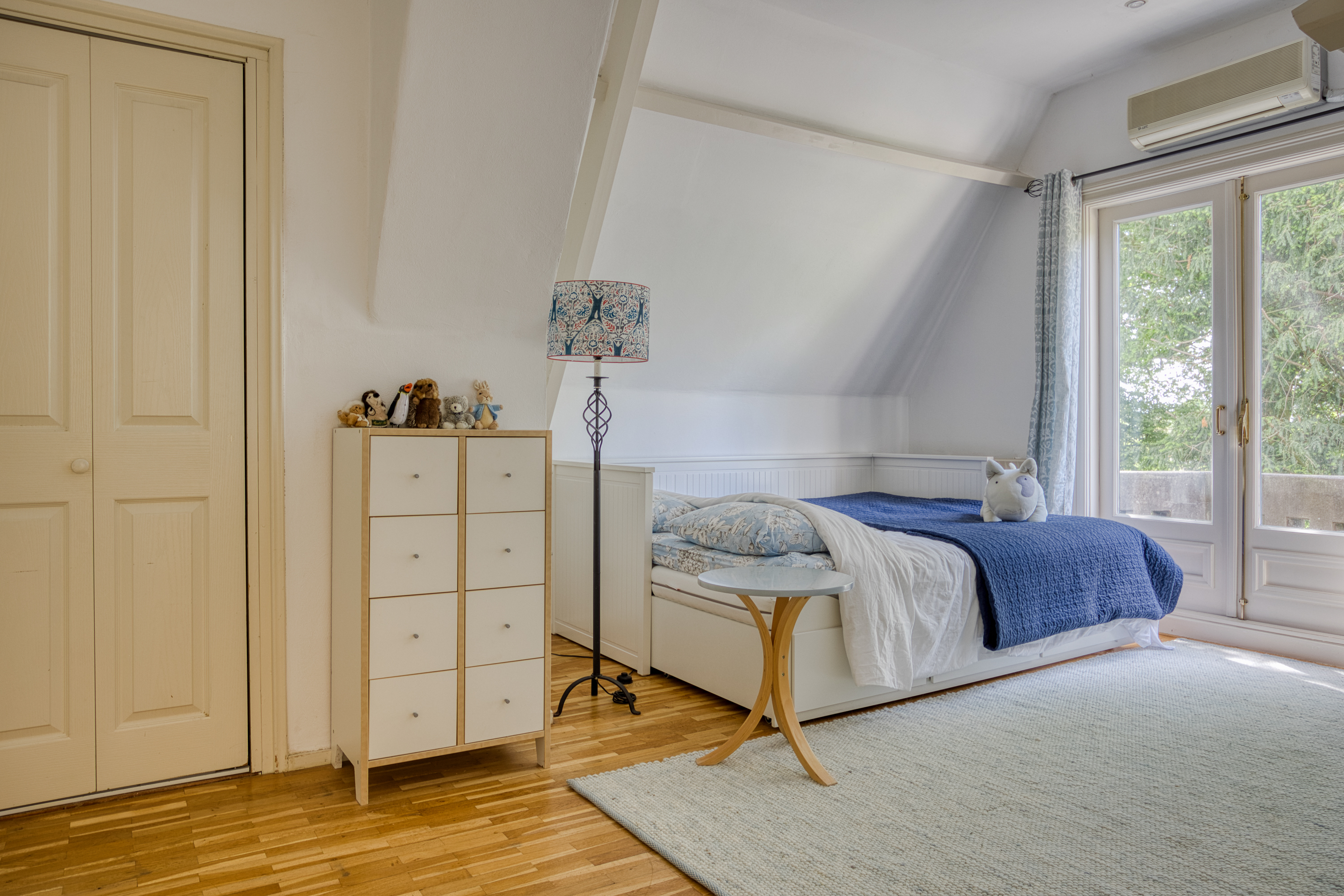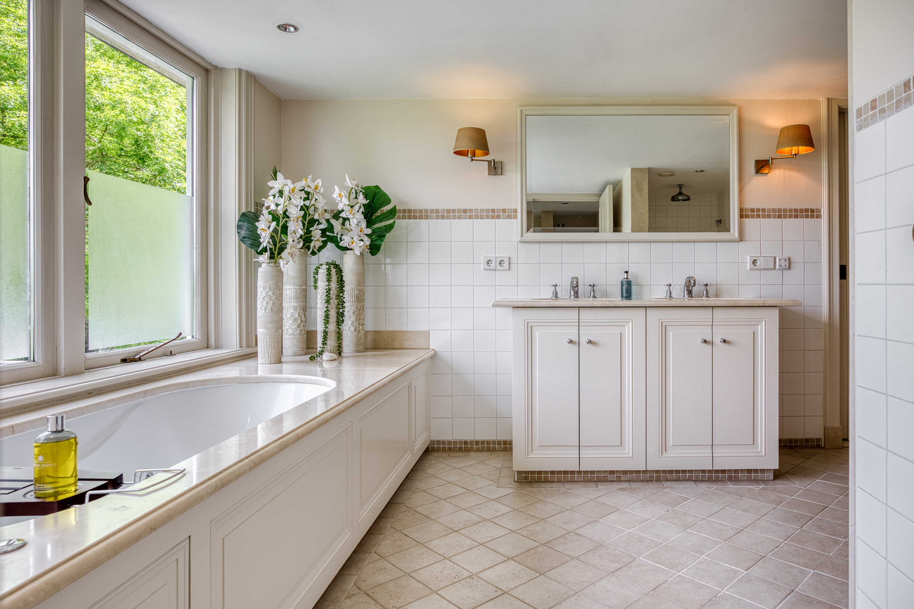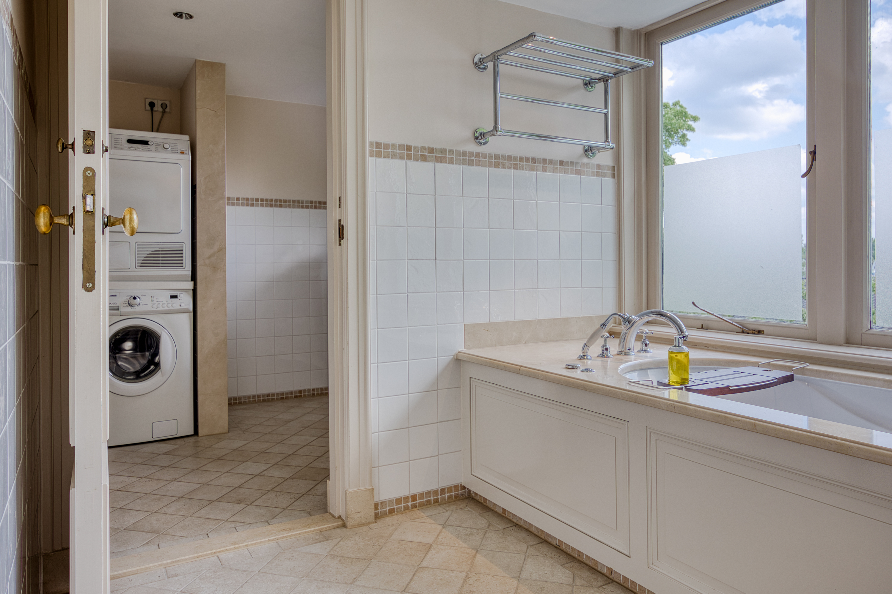 On the landing you will also find the bathroom, which was renovated in 2018 and is equipped with a bath, shower, toilet and sink. Walk through to the master bedroom which has access to the very spacious bathroom. This proverbial ballroom has a walk-in shower, bathtub with a view (over the beautiful garden), and a full-fledged sauna. Behind this bathroom there is also a practical laundry/ironing room that offers enough space for extra storage.