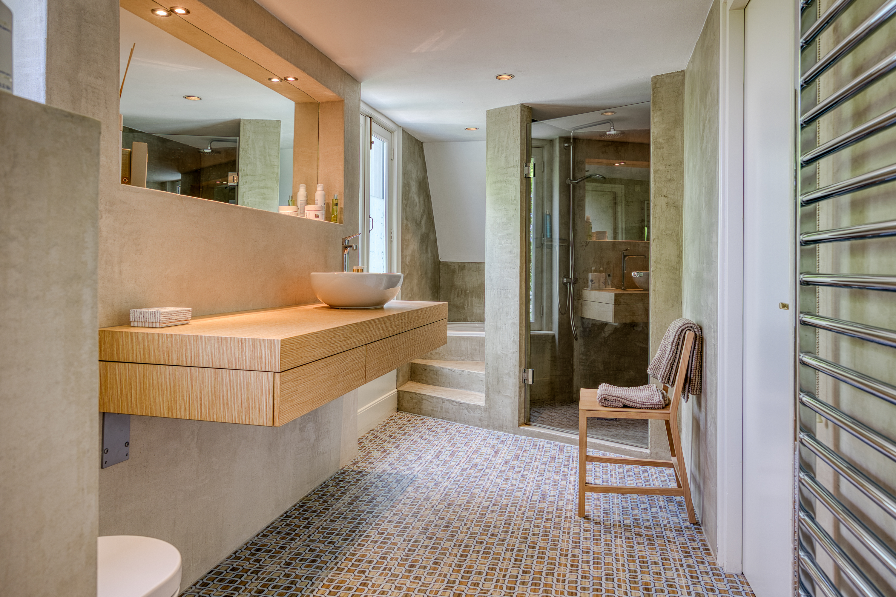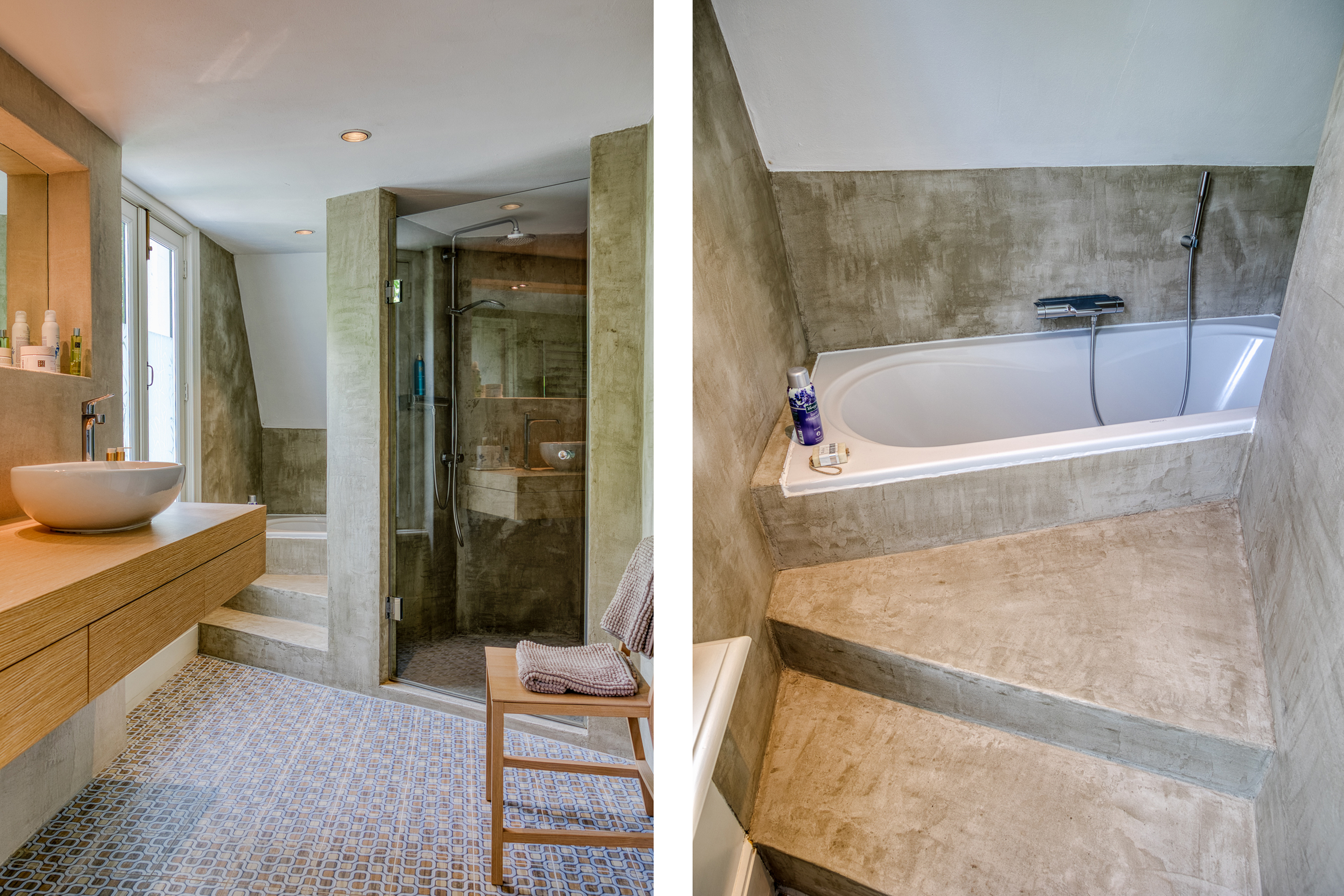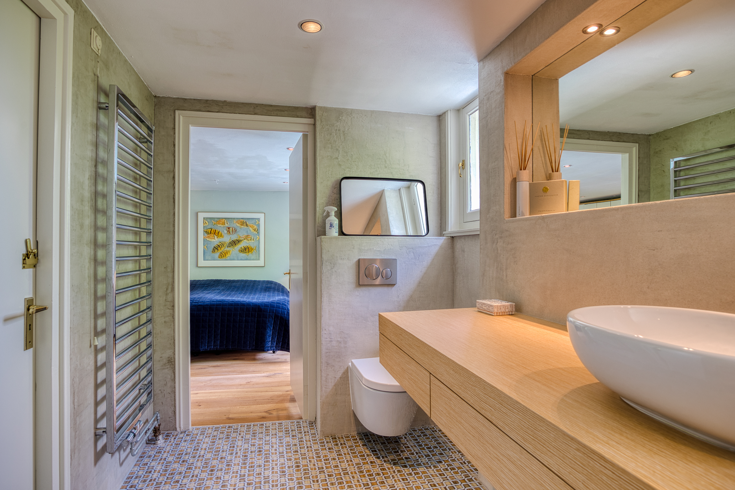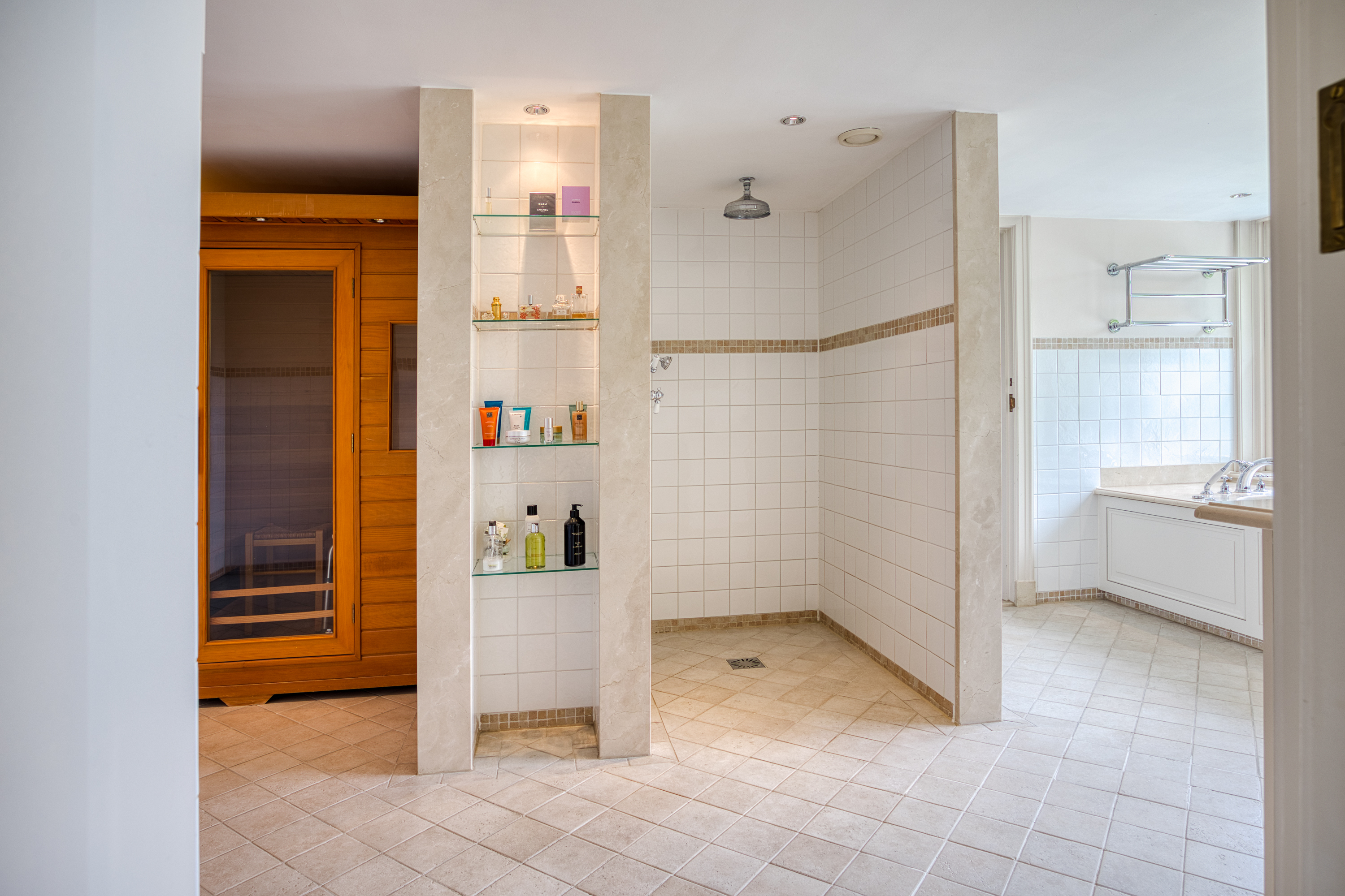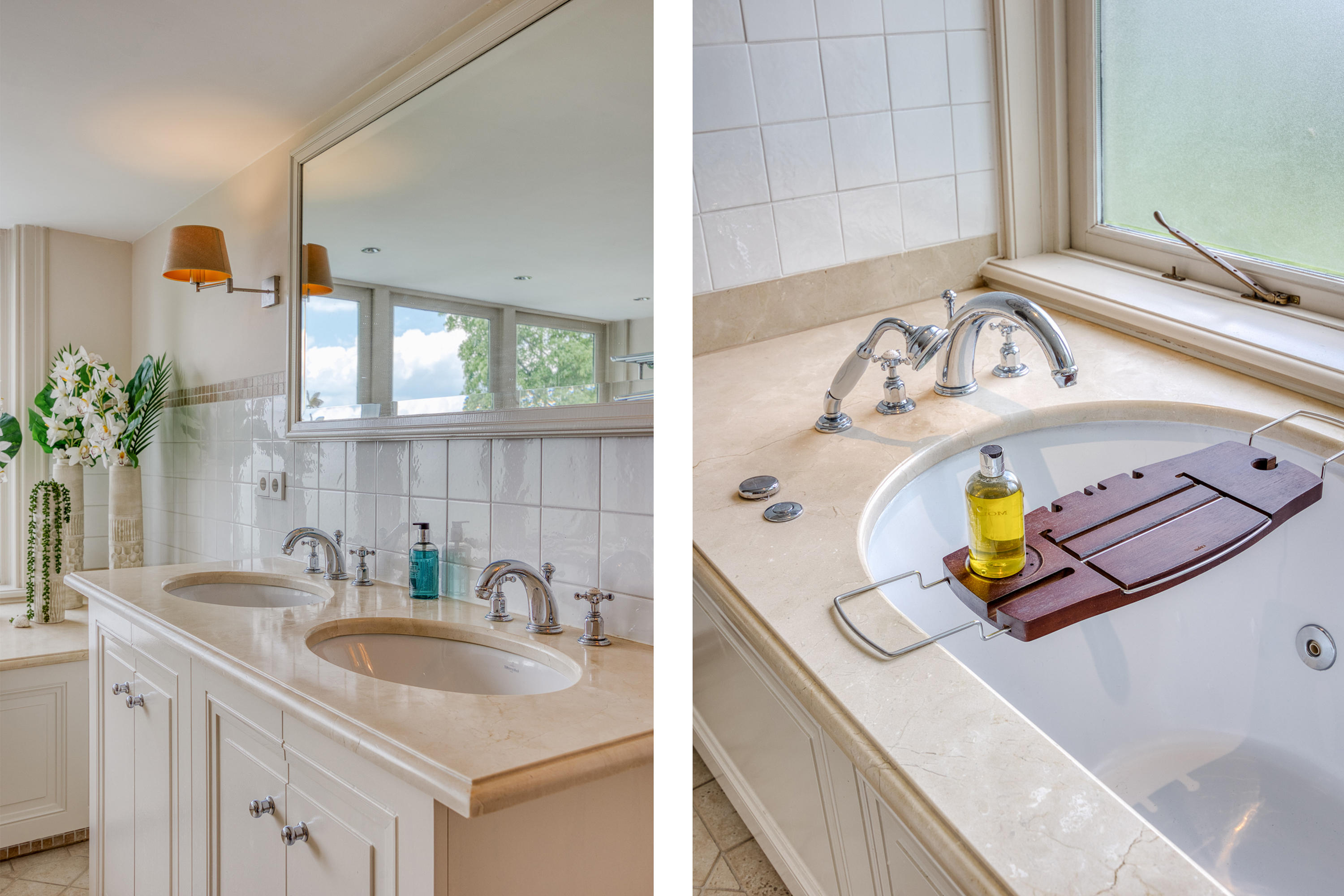 On the landing you will also find the bathroom, which was renovated in 2018 and is equipped with a bath, shower, toilet and sink. Walk through to the master bedroom which has access to the very spacious bathroom. This proverbial ballroom has a walk-in shower, bathtub with a view (over the beautiful garden), and a full-fledged sauna. Behind this bathroom there is also a practical laundry/ironing room that offers enough space for extra storage.