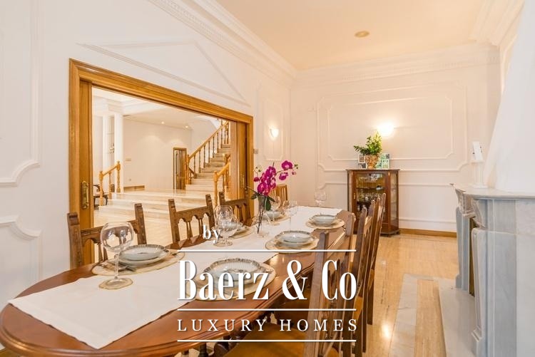 Outdoors, mature trees and layered gardens surround the large swimming pool and an expansive entertainment terrace appointed with a barbecue and wood-fired oven. Recreational enthusiasts will appreciate professional-grade tennis and fronton courts, while an independent guest apartment and extensive garage space provide further distinction. Security systems, climate control, and storage reinforce the villa’s readiness for both family living and high-value investment. This is a luxury villa for sale in Madrid where privacy, stature, and connectivity coalesce.