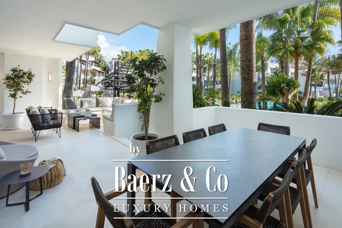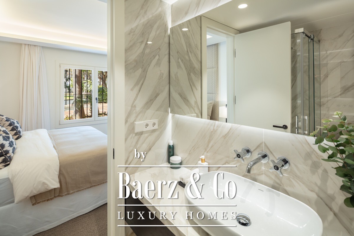 Apartment Marbella is presented at the heart of the five star Puente Romano resort, distinguished by a meticulous renovation that elevates everyday living. The living area spans 138 m², designed with an open plan arrangement that channels natural light throughout the south facing interior. A custom kitchen, crafted with oak cabinetry and Gaggenau appliances, merges seamlessly with the lounge, flowing onto a private terrace set against curated communal gardens.