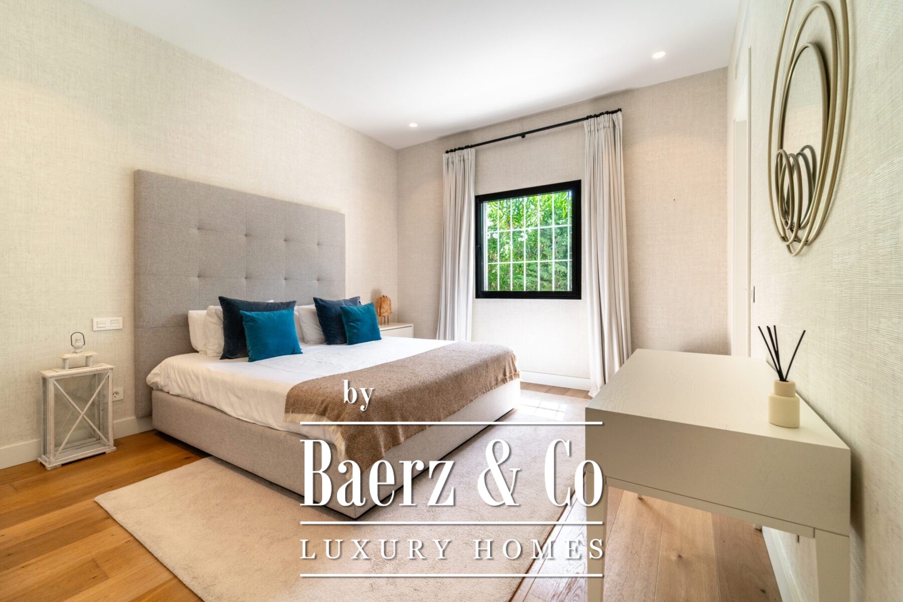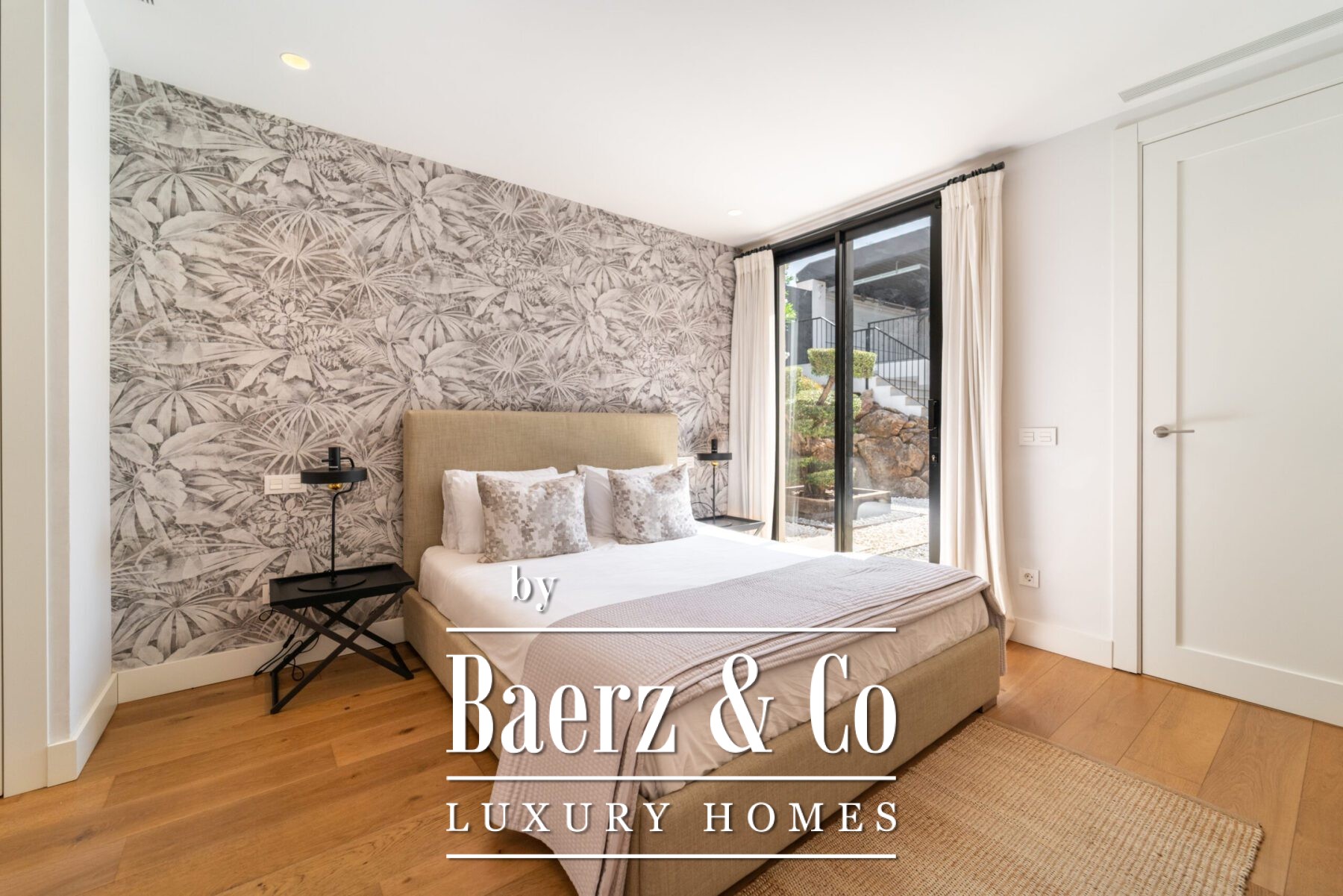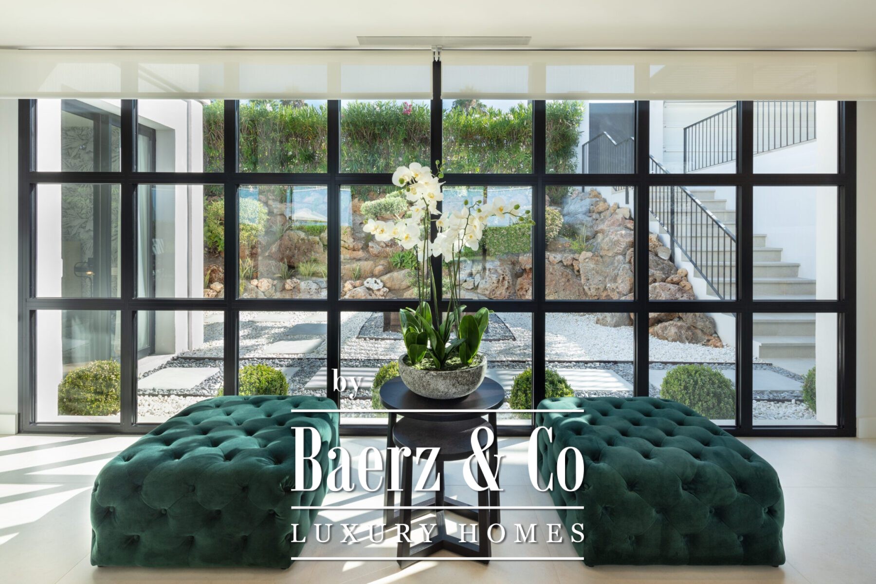 The villa welcomes you into a gorgeous courtyard, with the main feature being a large sculped olive tree, and landscaped entrance, with the back drop of large floor to ceiling colonial style black matte windows, allowing the outside to feel inside. Here at the entrance you find the closed Garage space for convenient parking, with then only 12 steps down into the property. As you enter the property you are greeted with a light and spacious hallway which leads you to a bright open plan living area with modern fireplace. The living room is connected to a spacious dining area which sits 8 guests and onto the modern sleek kitchen and breakfast bar, and off this area a large separate utility room . With a double height pitched ceiling in the main living space, the property feels inviting, homely and spacious. Internally the property has underfloor heating throughout, Airzone zonal A/C, and built in Sonos speaker systems. The property has been designed to create as much light and utilise its orientation as possible, and to create a real indoor-outdoor living experience. The villa has been perfectly distributed to offer large bedroom, wardrobe and en-suite bathroom space, in each of the rooms, tastefully done with the use of Casamance wallpaper and wooden flooring and modern sleek bathrooms. The master bedroom is especially well executed with its double height pitched ceilings and two double terrace doors, leading out into the garden and pool area which offers bright, green views.