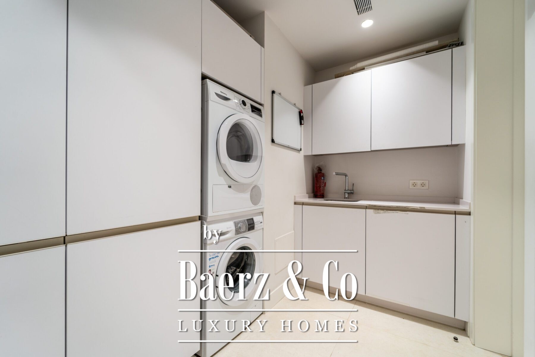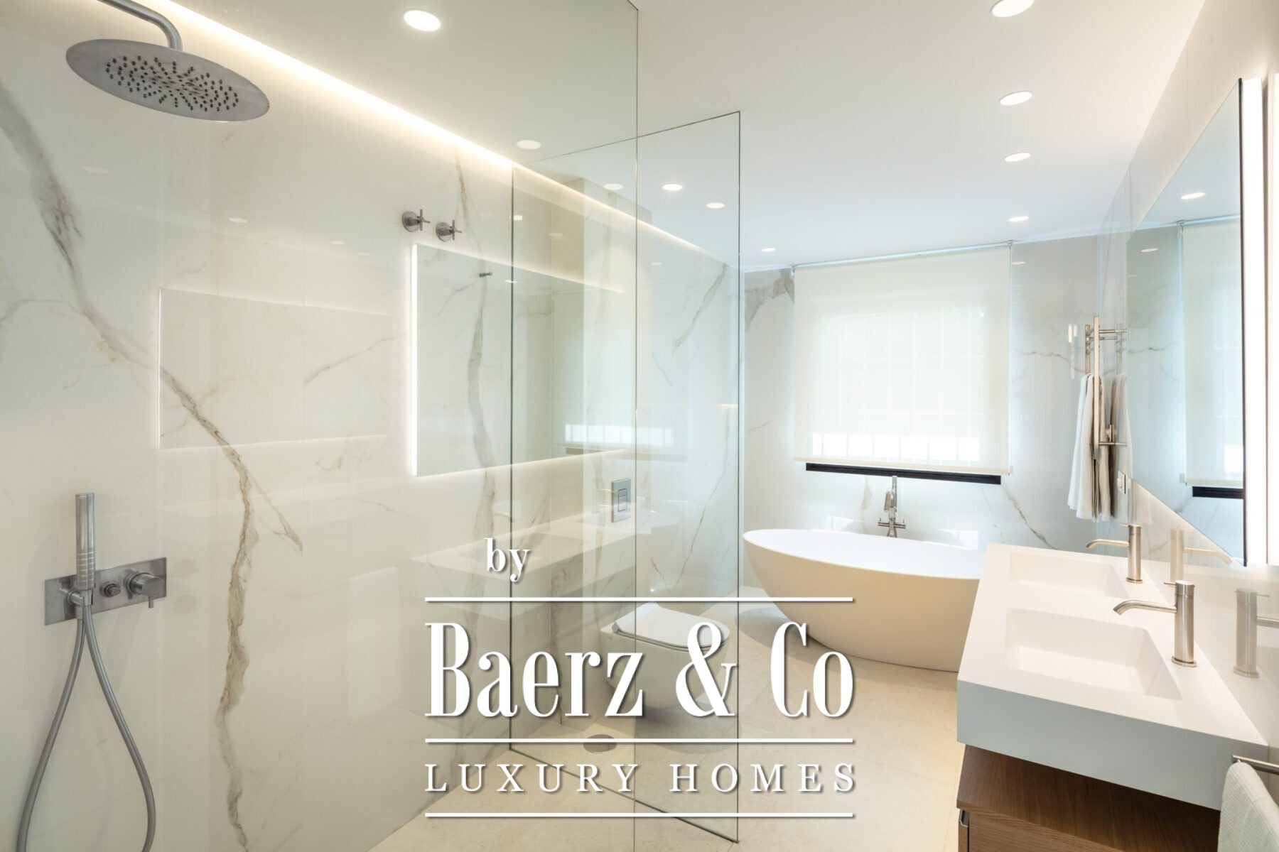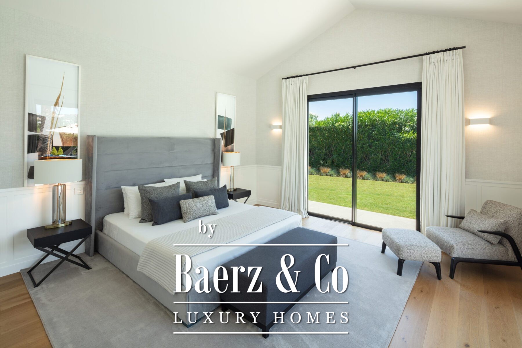 The villa welcomes you into a gorgeous courtyard, with the main feature being a large sculped olive tree, and landscaped entrance, with the back drop of large floor to ceiling colonial style black matte windows, allowing the outside to feel inside. Here at the entrance you find the closed Garage space for convenient parking, with then only 12 steps down into the property. As you enter the property you are greeted with a light and spacious hallway which leads you to a bright open plan living area with modern fireplace. The living room is connected to a spacious dining area which sits 8 guests and onto the modern sleek kitchen and breakfast bar, and off this area a large separate utility room . With a double height pitched ceiling in the main living space, the property feels inviting, homely and spacious. Internally the property has underfloor heating throughout, Airzone zonal A/C, and built in Sonos speaker systems. The property has been designed to create as much light and utilise its orientation as possible, and to create a real indoor-outdoor living experience. The villa has been perfectly distributed to offer large bedroom, wardrobe and en-suite bathroom space, in each of the rooms, tastefully done with the use of Casamance wallpaper and wooden flooring and modern sleek bathrooms. The master bedroom is especially well executed with its double height pitched ceilings and two double terrace doors, leading out into the garden and pool area which offers bright, green views.