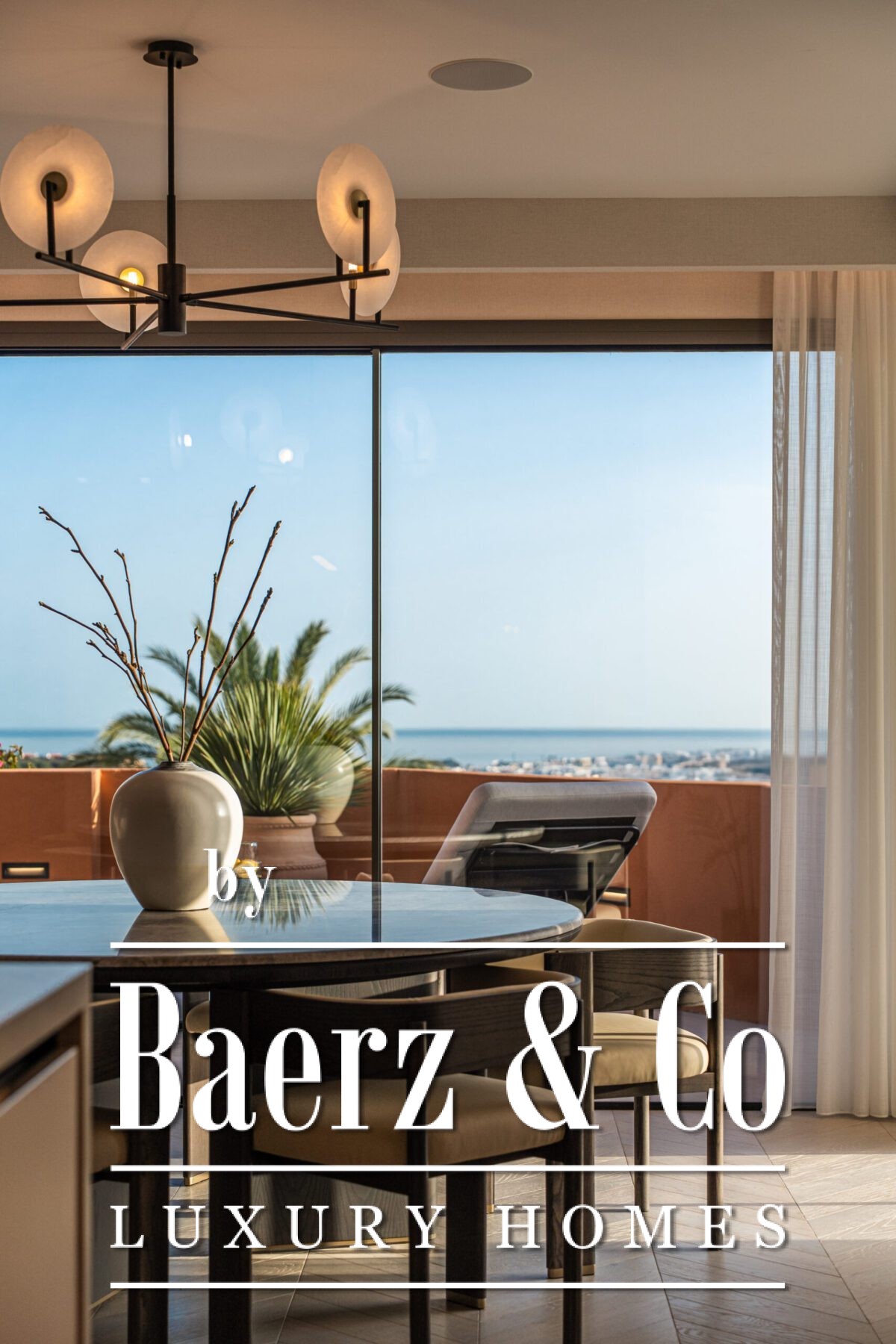Within this secured, gated enclave with 24-hour security, the four-bedroom, four-and-a-half-bathroom home reveals refined details. Floor-to-ceiling windows illuminate the open living and dining space, seamlessly extending to a spacious terrace designed for tranquil hours or entertaining under the Marbella sky. The kitchen is appointed with Gaggenau appliances, complemented by natural oak floors and an intuitive smart home system, underlining discreet luxury and ease.